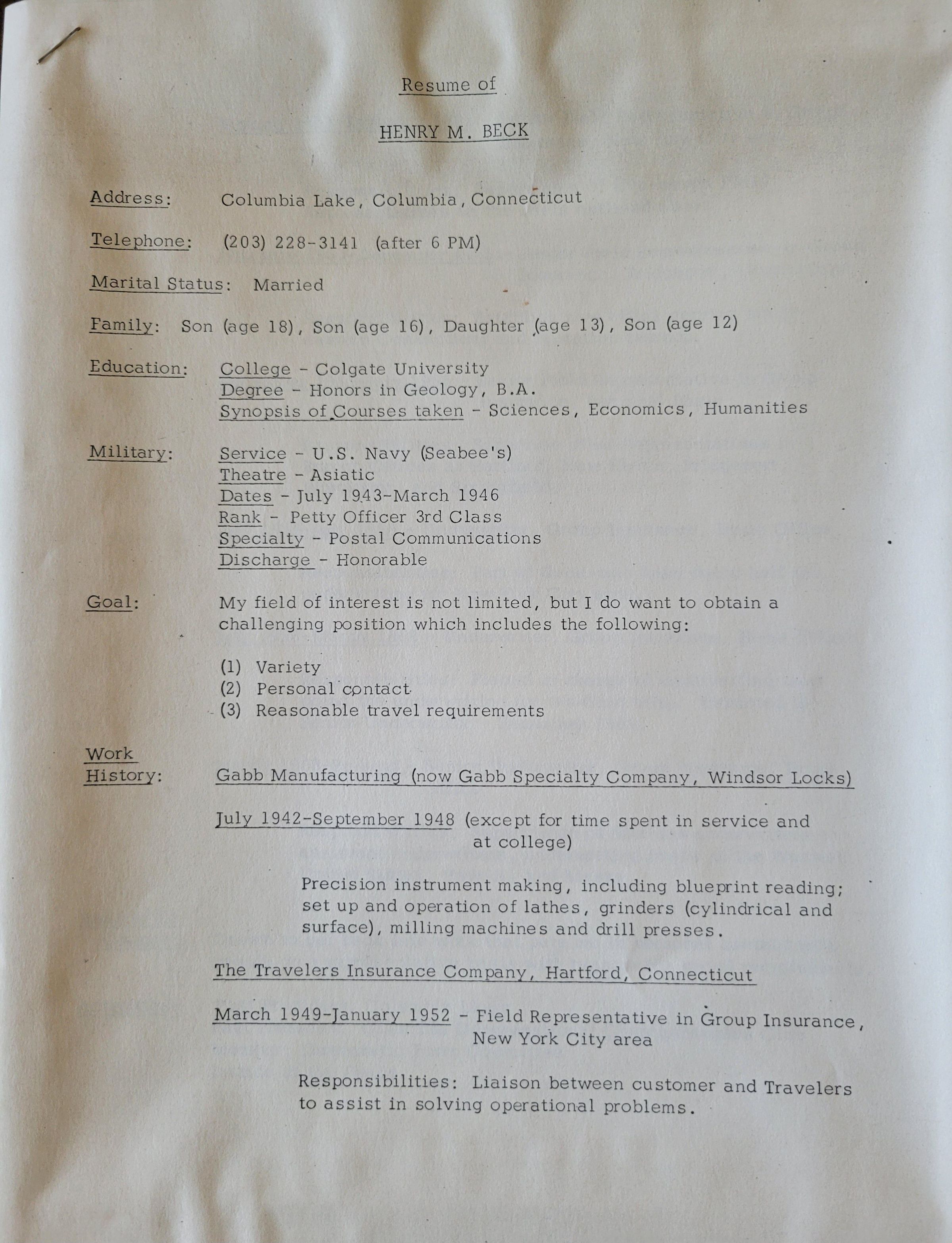 The professional resume of Henry M. Beck from 1969. Three pages typewritten and stapled in the upper left corner.Collection