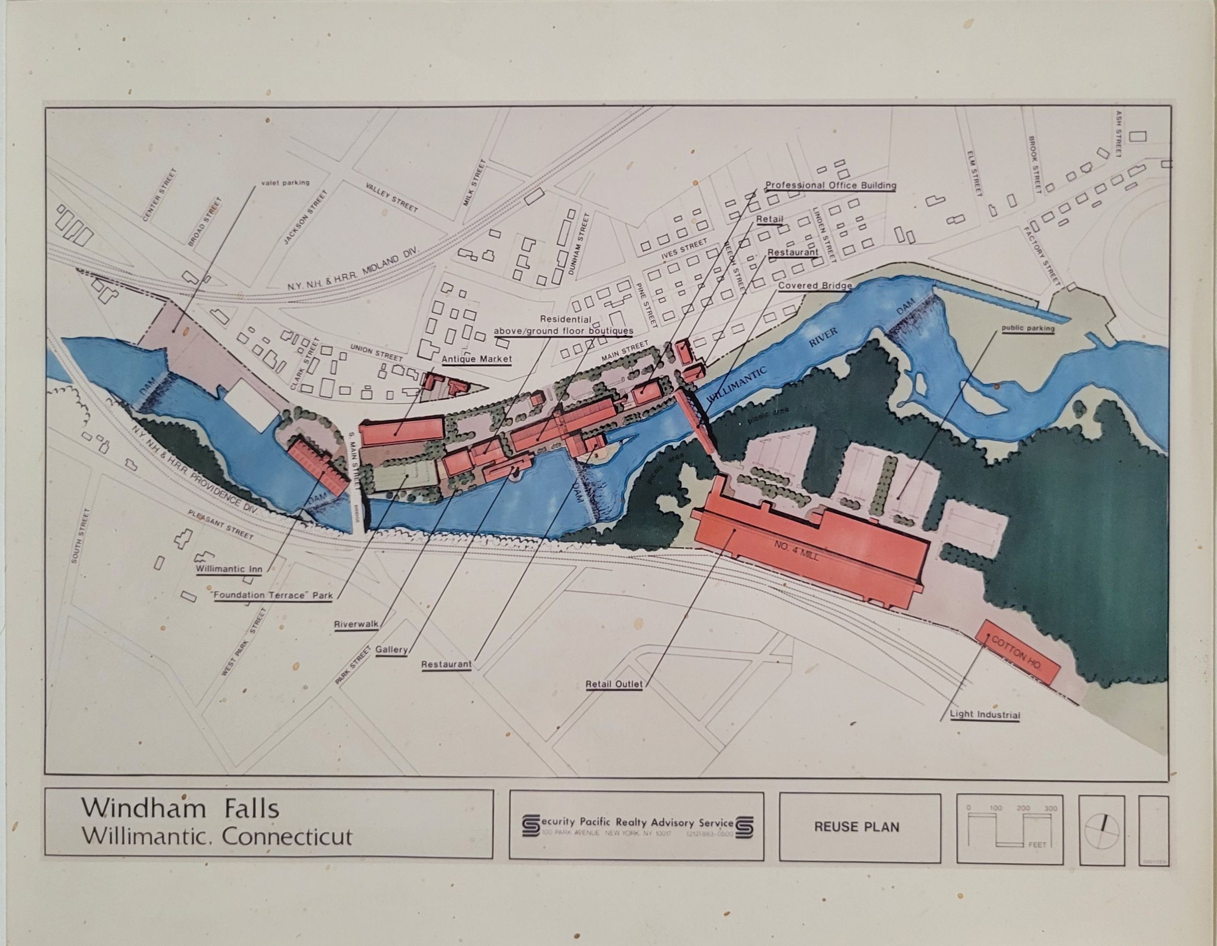 A plan offered to the City of Willimantic for the reuse of the ATCO mill no.4 and other buildings by the Security Pacific Realty Advisory Service of NY, NY. Circa 1980Collection