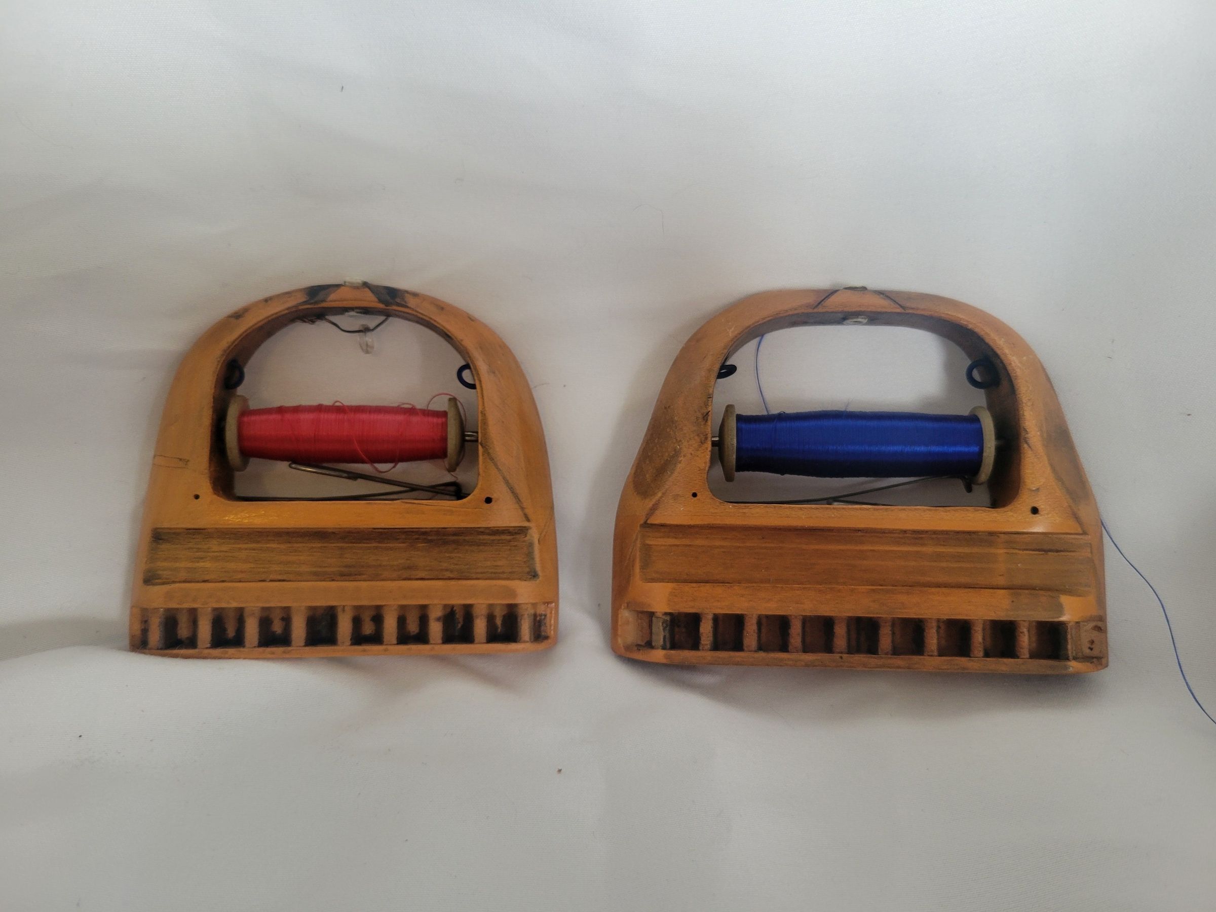 Wooden shuttles such as these are used on power looms to make ribbon. Gear teeth fit into the grooves at the bottom to move them back and forth across the web. Both these shuttles are fitted with spools of silk thread, one in red and the other in blue.Collection