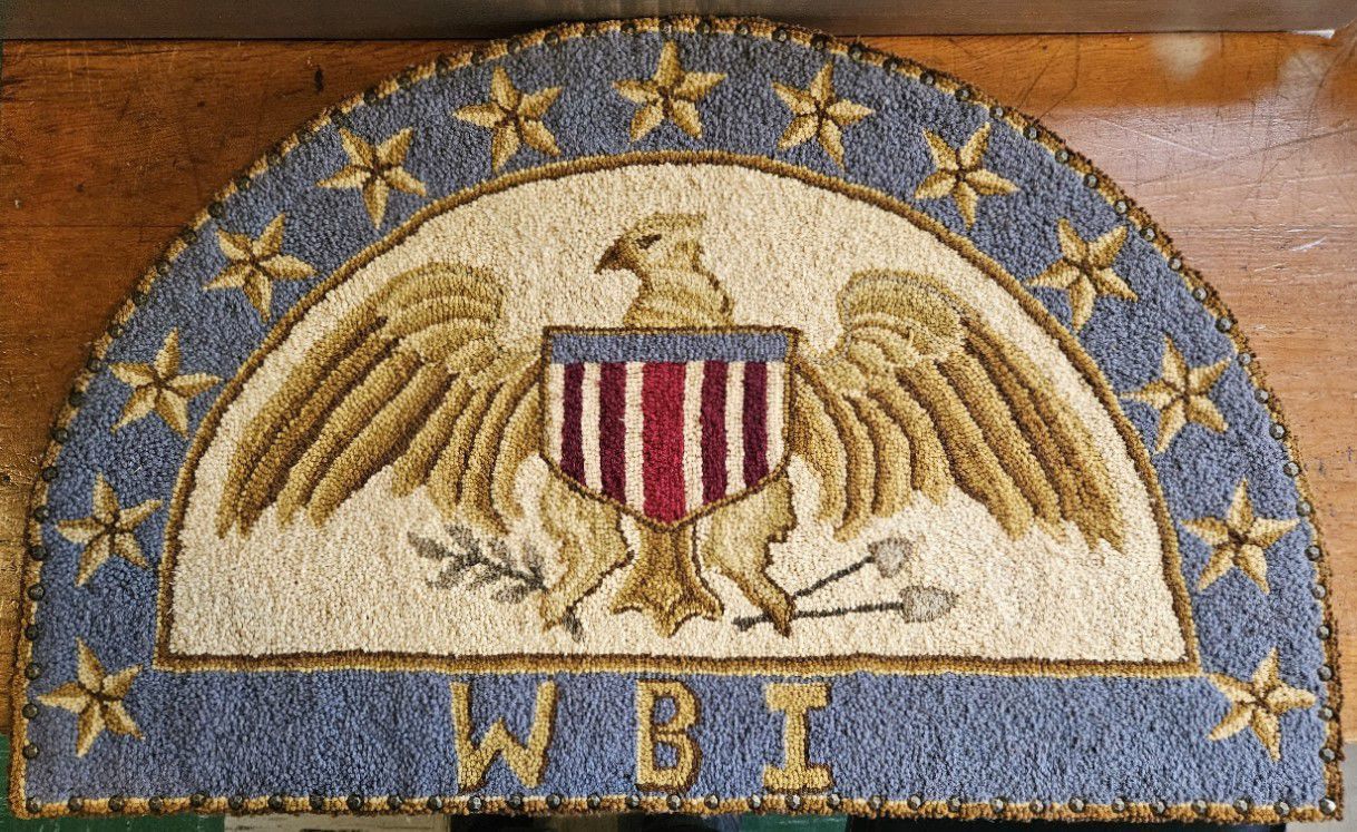 Woven hooked rug. The eagle and shield hooked rug with WBI at the bottom is a rug Mary Louise Steen Isbell of Darien, CT, hooked for her son, William Burton Isbell, who fought in the army in World War II. He was stationed in North Africa, where he fought against Rommel's Afrika Korps. She created one of these rugs for her two sons who came home from the war. (Her third son, Laurence Harvey Isbell, was a submariner who died in the Pacific.) She drew the pattern on Burlap and used wool strips cut from fabric scraps to create the design.Collection