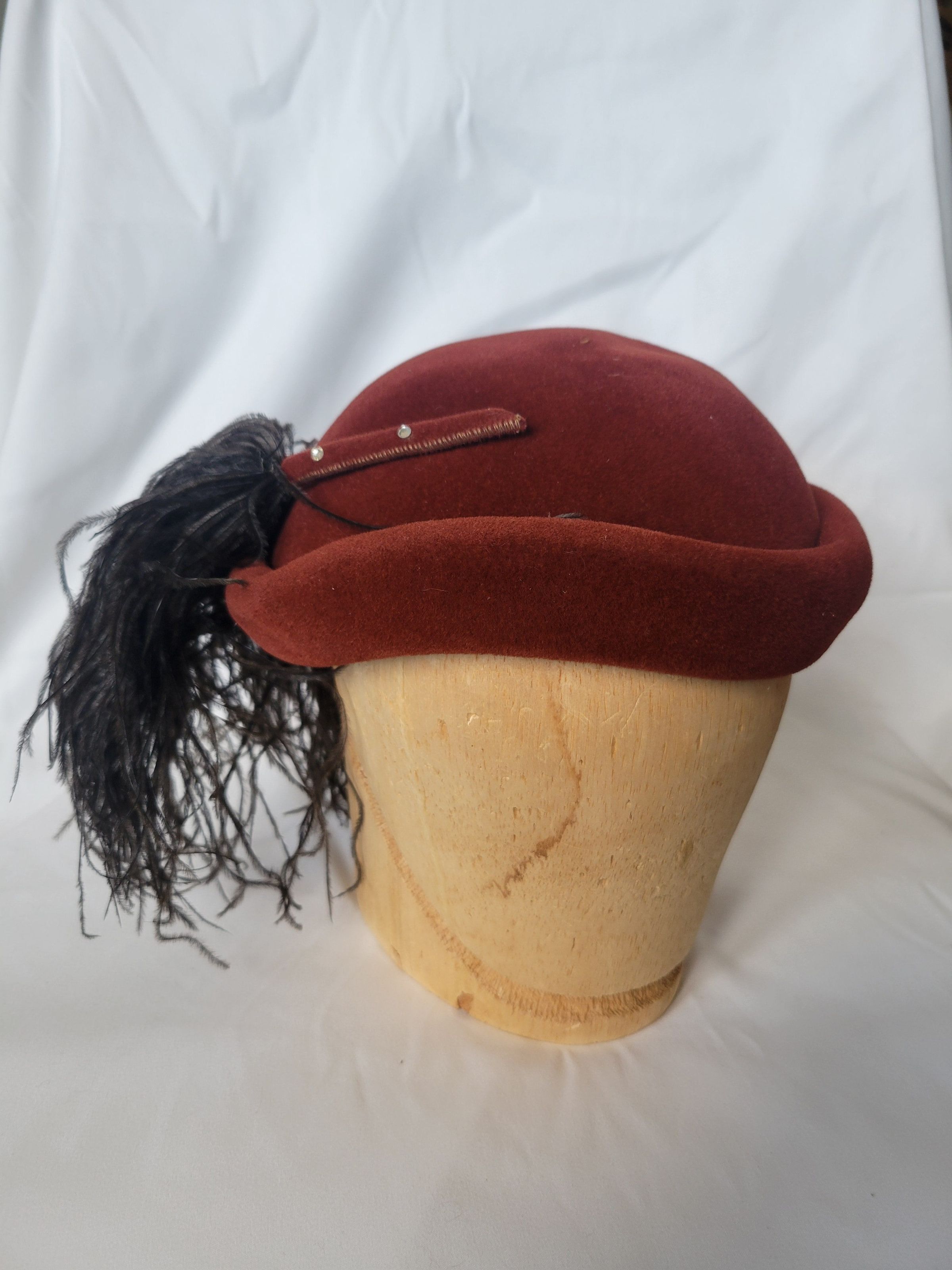 A rust colored velour derby hat with black ostrich feathers. This sort of cap was popular with women in the 1940's and early 1950's.Collection