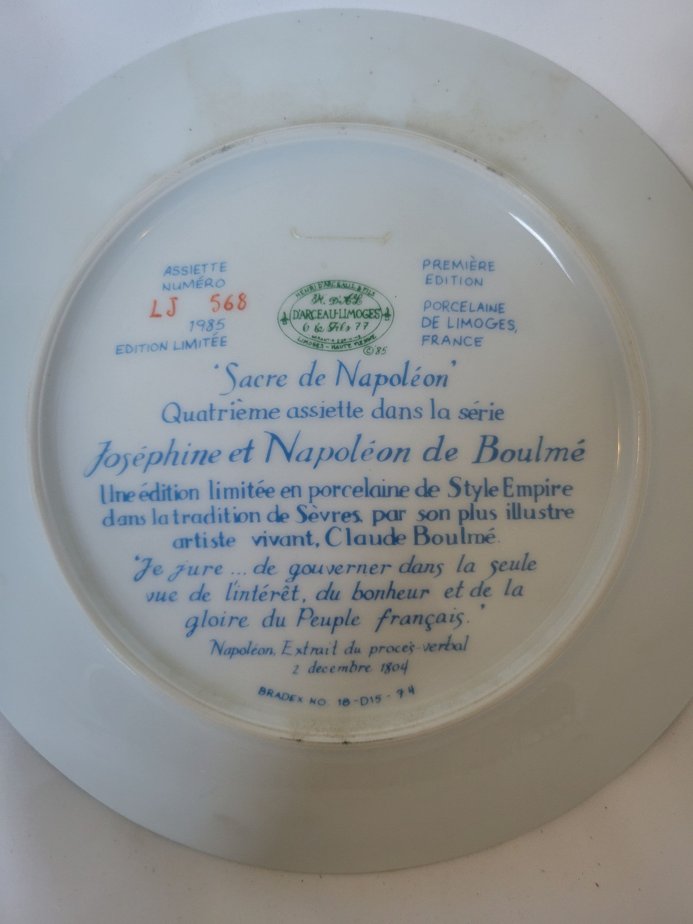 Fourth in the Josephine and Napoleon series by artist Claude Boulme of Limoges France. This is a hand numbered limited edition collector's plate, created in 1985. It was donated along with a wire plate hanger.Collection