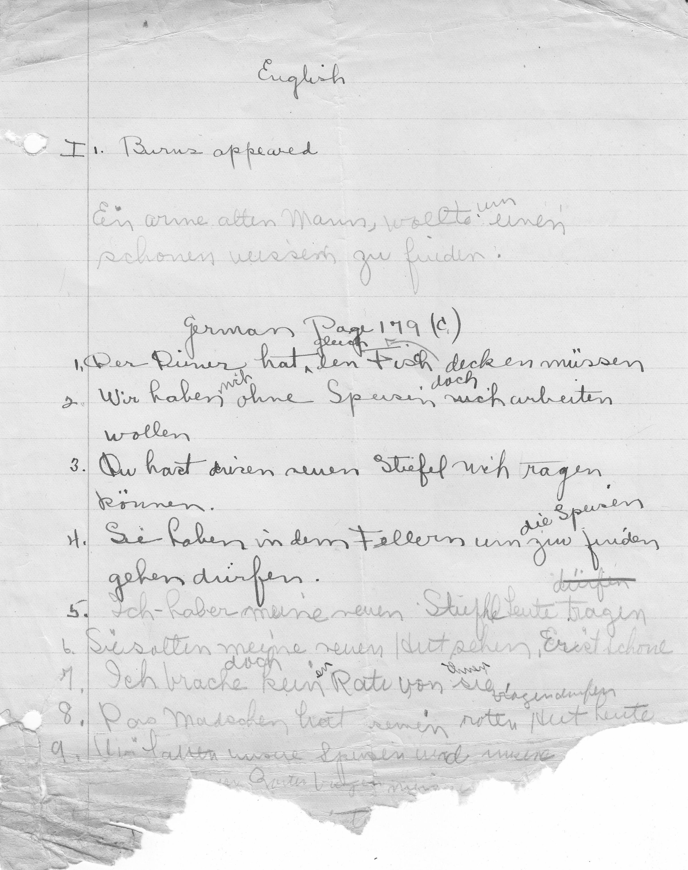 School assignment in German completed by Mary Norberta Smith, probably when she was a student at the Willimantic Normal School in the late 1910s.Collection