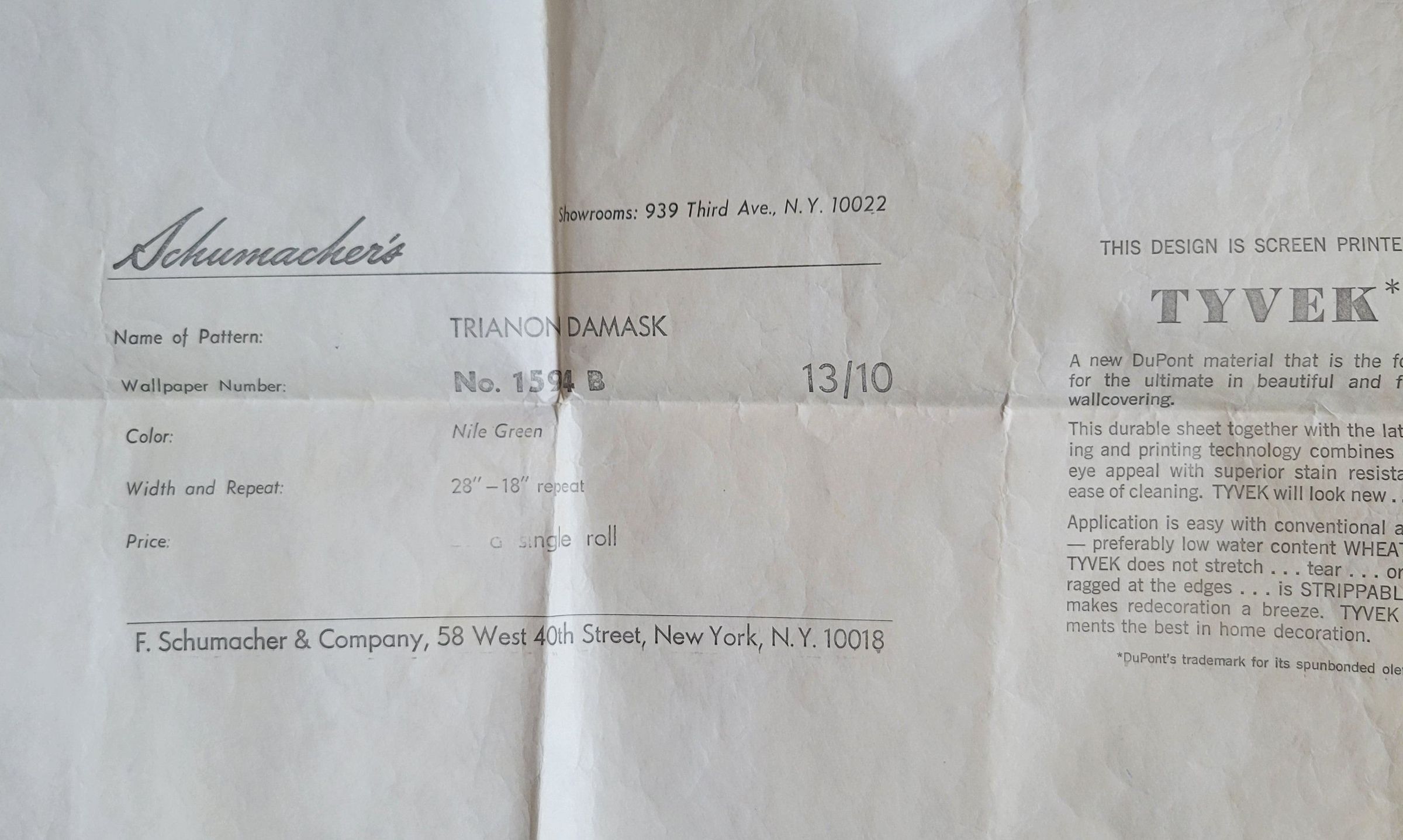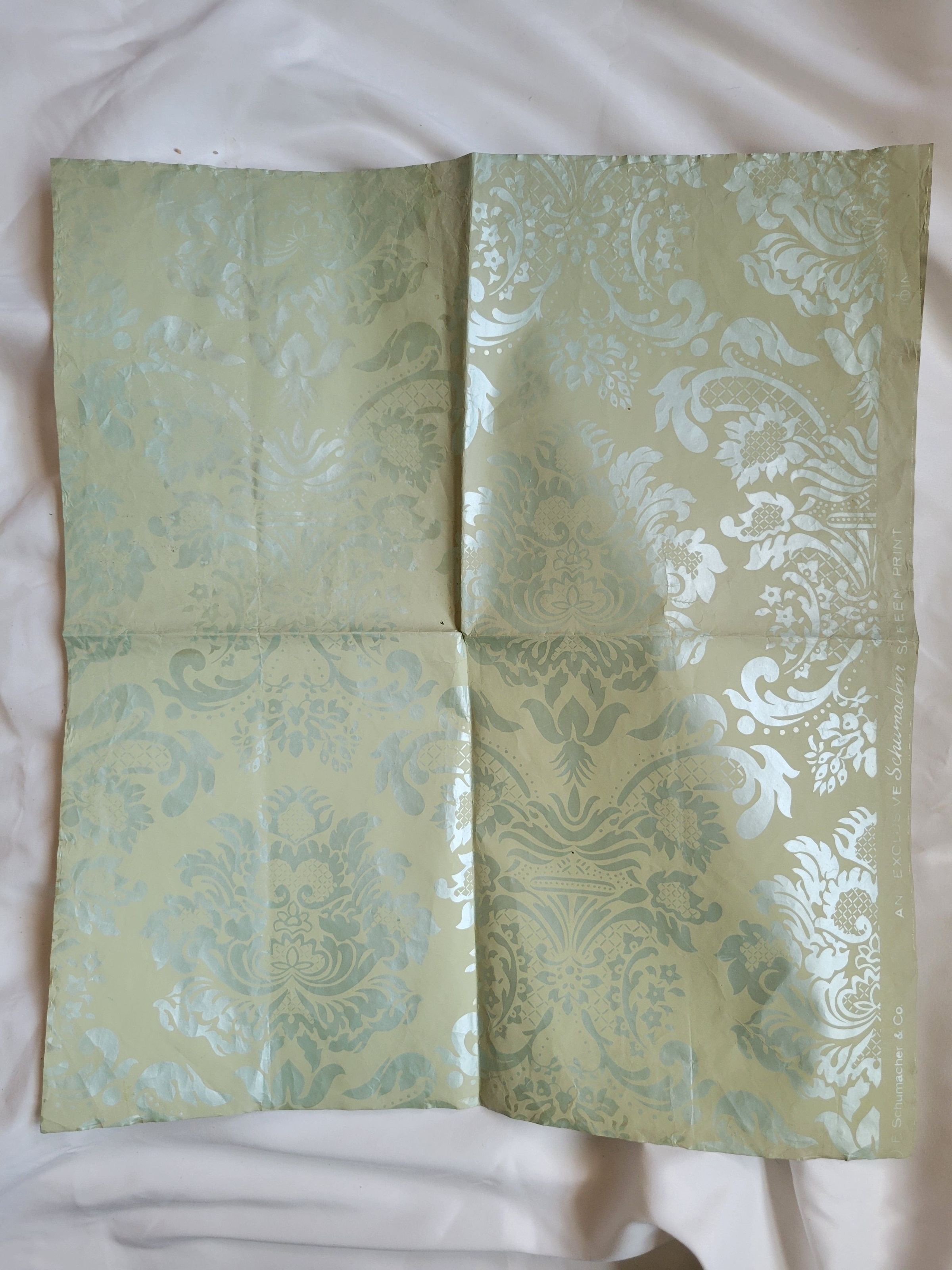A sample of Trianon Damask wallpaper, no. 1594 B, by F. Schumacher and Co. The sample is a pale green with a large silvery floral damask pattern. The salvage edge of the paper which shows the name of the company is included on one side. The back of the paper has the company name and the name and details of the print. It also details the benefits of the Tyvek material of the wallpaper. F. Schumacher and Co. was founded in 1889 and is still in business today selling wallpaper, fabrics, and home furnishings.Collection
