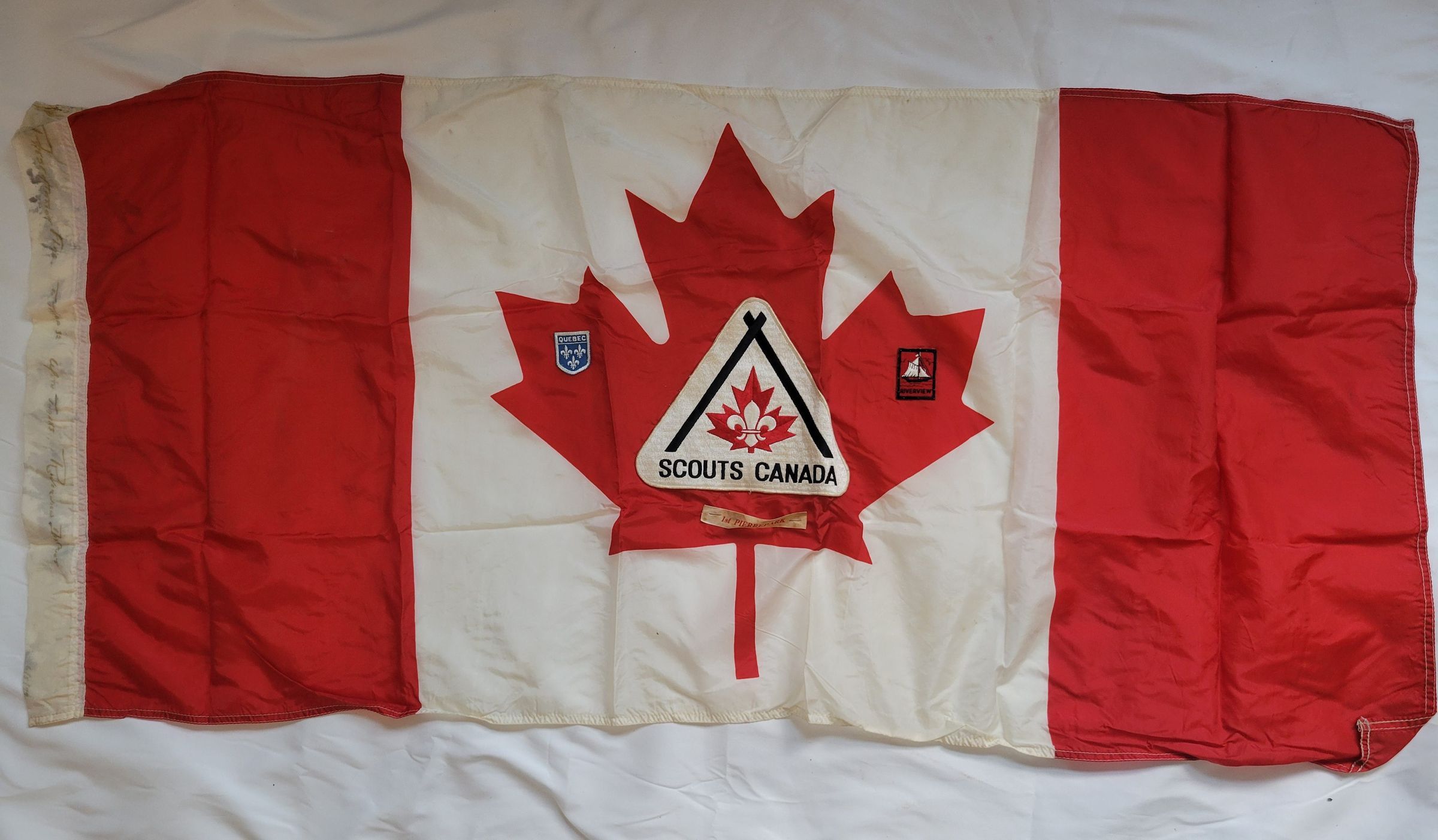 A large nylon Canadian flag with Scouts Canada insignia. To the left of the insignia is a patch of the Quebec crest, and to the reight is a patch with a sailboat and "Overview" underneath. Below the insignia is pinned a strip of cloth that reads "1st Pierrepark." Along the pole edge of the flag there is handwriting in pen saying the flag was presented to Troop 32 with thanks.Collection