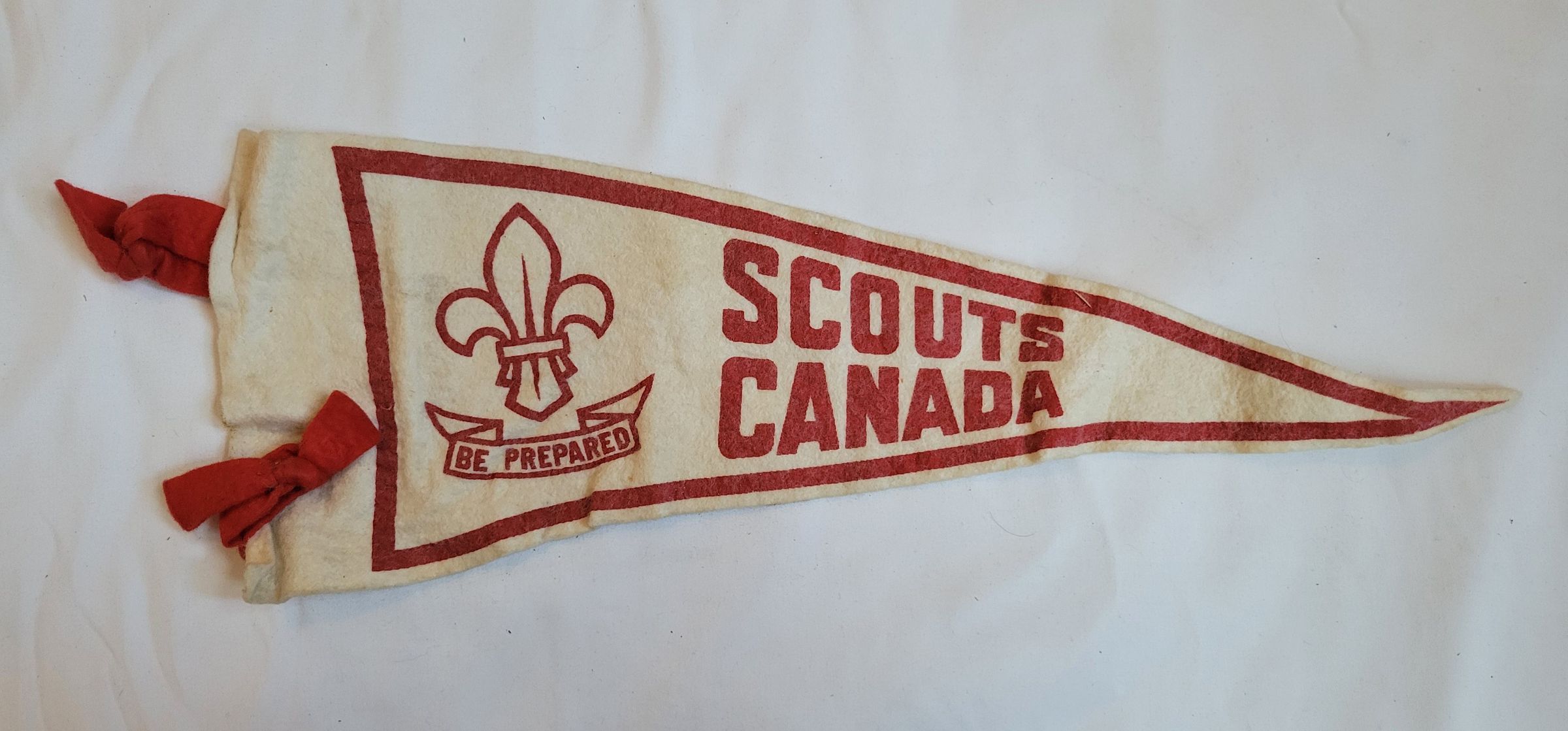 A red and beige felt pennant for Scouts Canada, featuring a fleur de lis and the scout motto "Be Prepared." The pennant is wrinkled and yellowed but otherwise in good condition.Collection