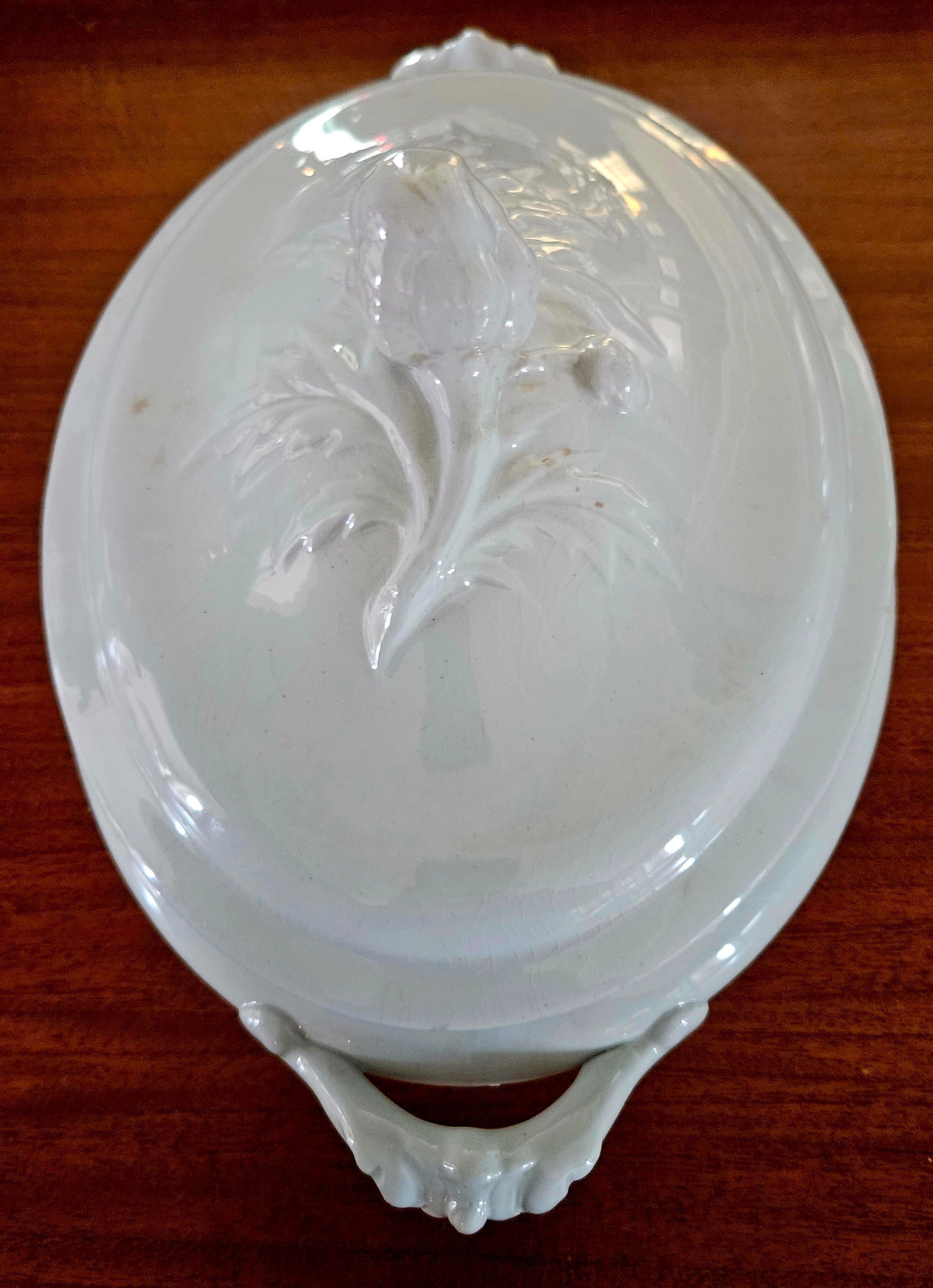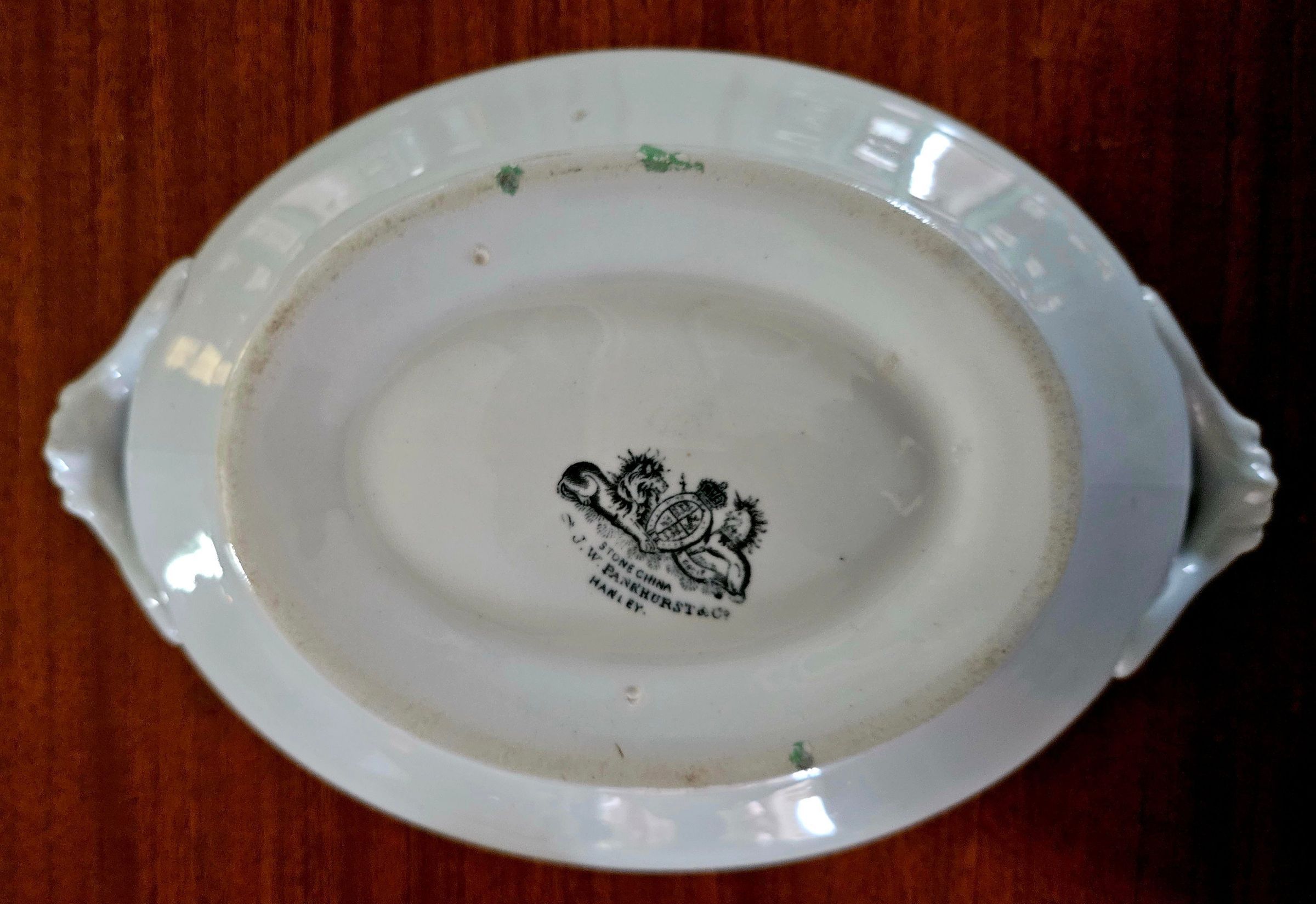 Stone china serving bowl, manufactured by J. W. Parkhurst & Co., Hanley, England, earthenware and ironstone manufacturers in Hanley, Stoke-on-Trent, England. James William Pankhurst was in partnership with the Meigh family for a brief period in 1850 at the Old Hall Street works as Charles Meigh, son and Pankhurst. This partnership ended on the 6th July 1850. Both Meigh and Pankhurst seem then to have continued as separate manufacturing companies at the same works. It was not unusual for manufacturers to share works. According to Jewitt Ceramic Art of Great Britain, Pankhurst continued at the Old Hall Works until 1883. Pankhurst also operated the Charles Street Works. "& CO" was added from 1852 although not all marks had the "& Co." Pankhurst's original partner at the Charles Street Works was John Dimmock - this partnership was dissolved on the 26th December 1857. Pankhurst was later in partnership with James Meakin - this partnership was dissolved on the 30th July 1883. Donated to the Mill Museum by Brenda Buchbinder of Willimantic, CT, whose father, Irving Liss, had been an antique dealer in Pennsylvania.Collection