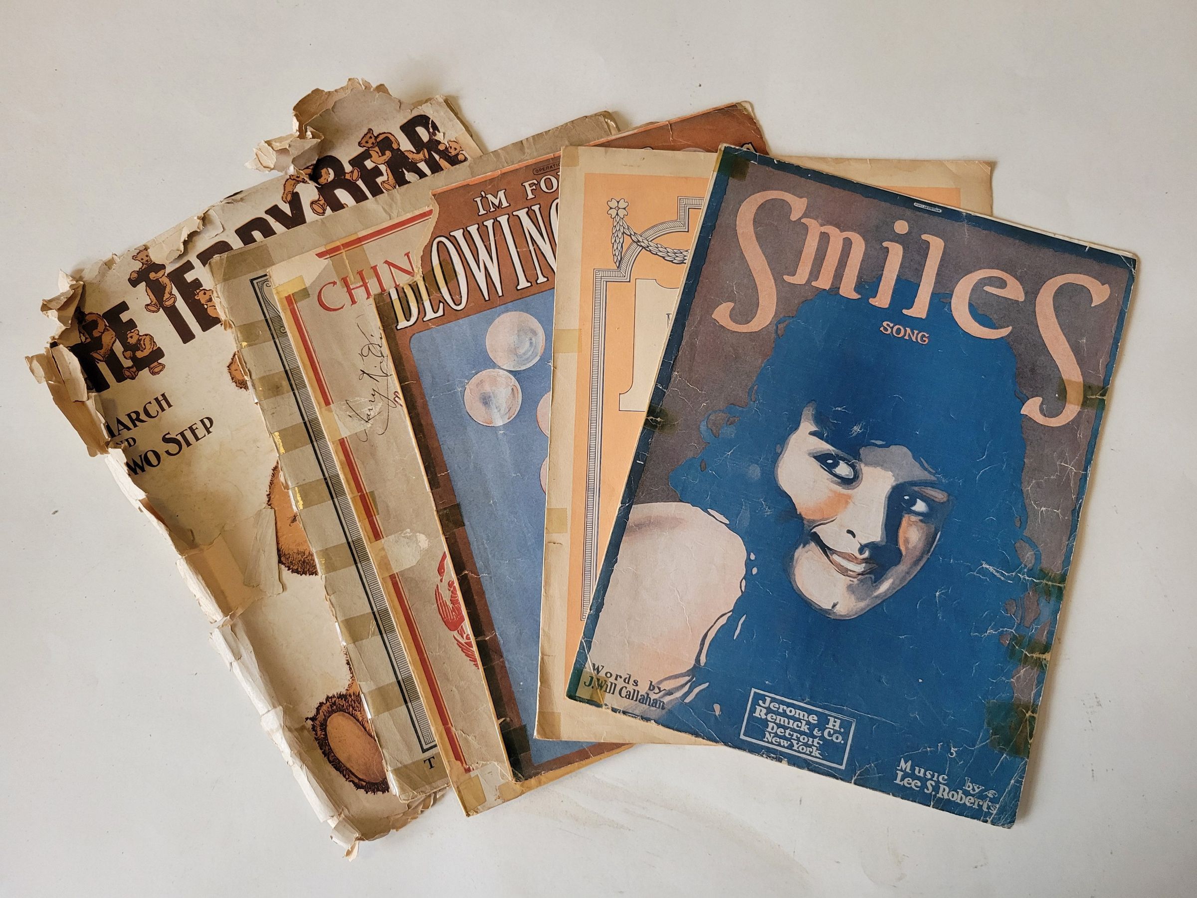 Six booklets of sheet music, dated 1913 to 1919. All booklets are torn and taped in several places, but the music is still easily readable.Collection