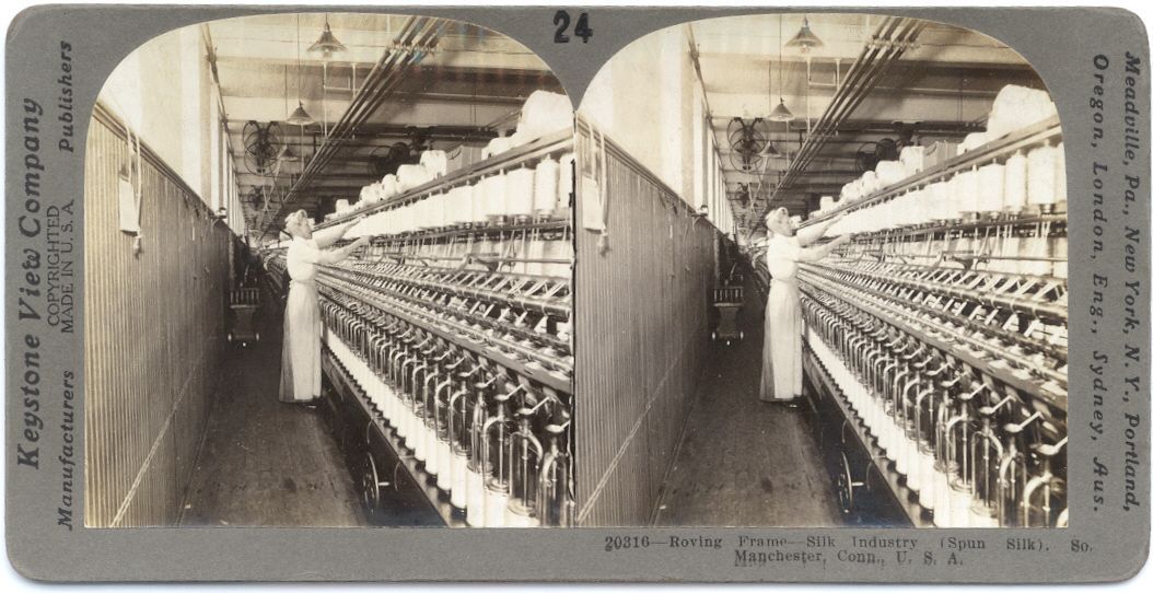 Stereograph of an unidentified worker operating a roving machine at Cheney Brothers silk mills in South Manchester, CT, 1914. Black and white print on cardboard. Unknown photographer. Studio: Keystone View Company, Meadville, PA. Serial #20316, #24 in a series.Photograph Details
