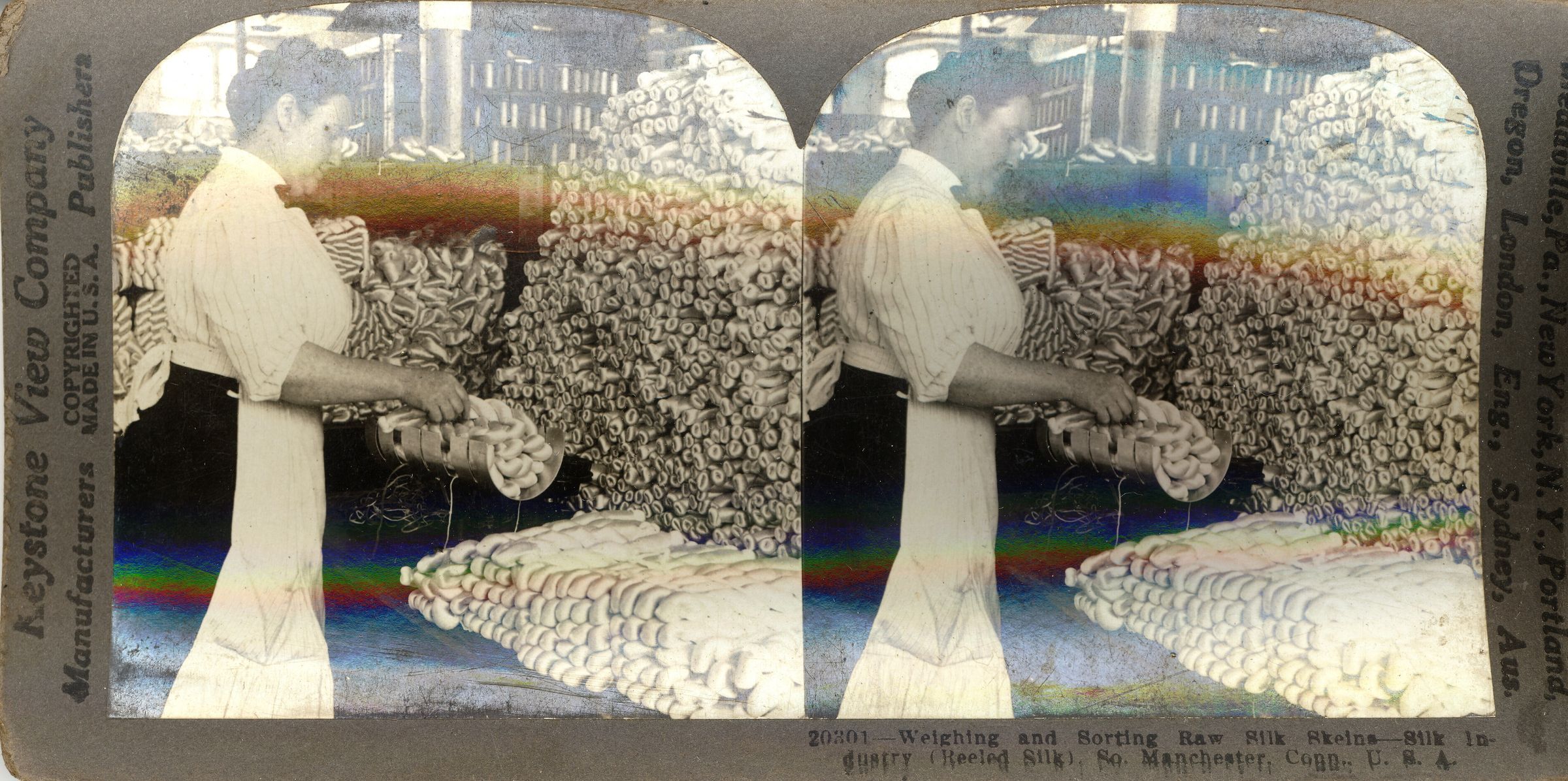 Stereograph of silk mill worker weighing and sorting raw silk skeins at Cheney Brothers silk mills in South Manchester, CT, 1914. Black and white print on cardboard. Card is warped. Unknown photographer. Studio: Keystone View Company, Meadville, PA. Serial #20301.Photograph Details