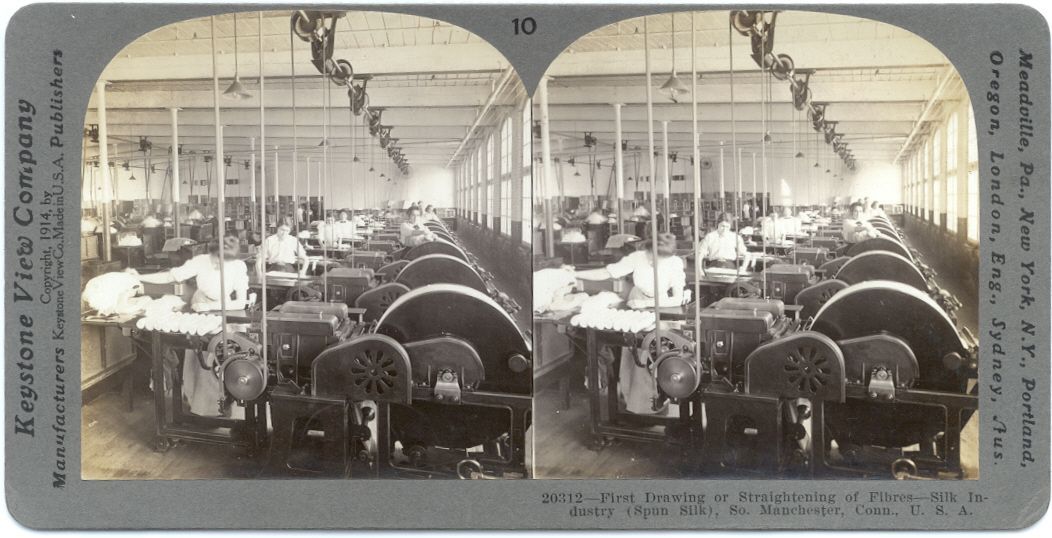 Stereograph of workers drawing silk, Cheney Brothers silk mills, South Manchester, CT, 1914. Black and white print in cardboard. Unknown photographer. Studio: Keystone View Company, Meadville, PA.Photograph Details