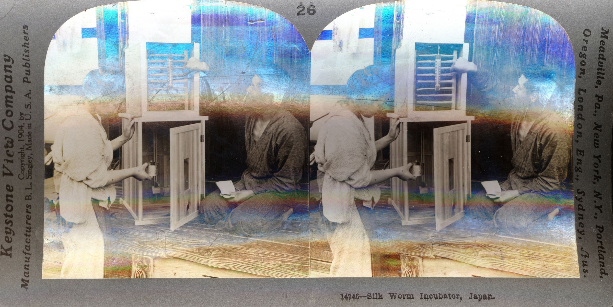 Stereograph of a silk worm incubator in Japan, 1904. Card is warped.Photograph Details
