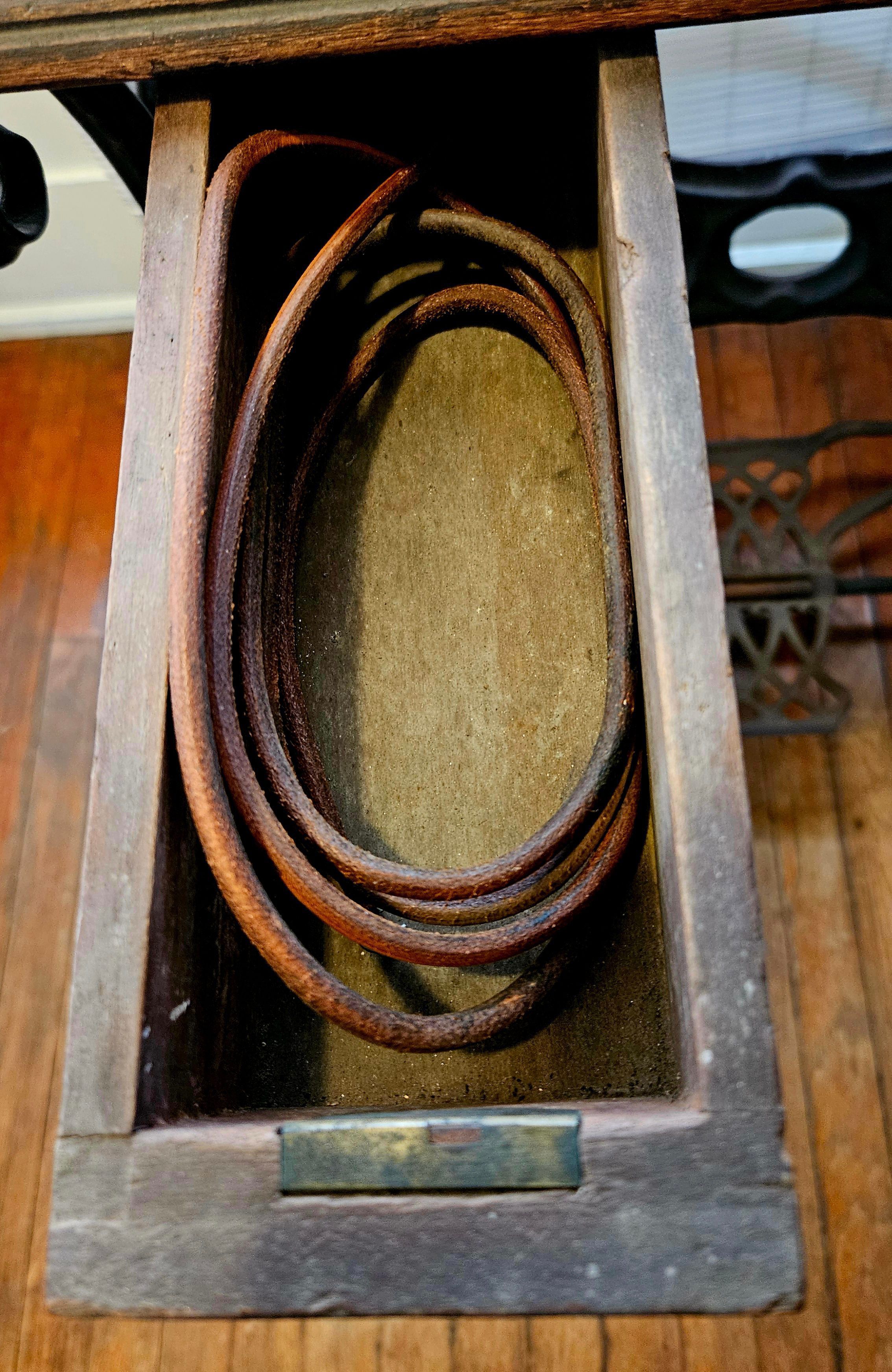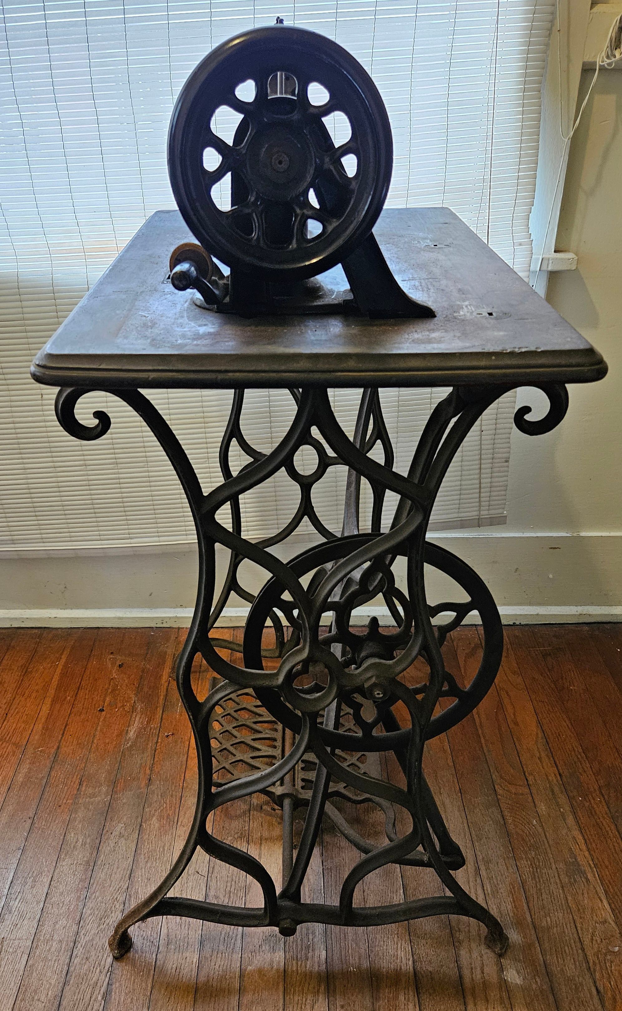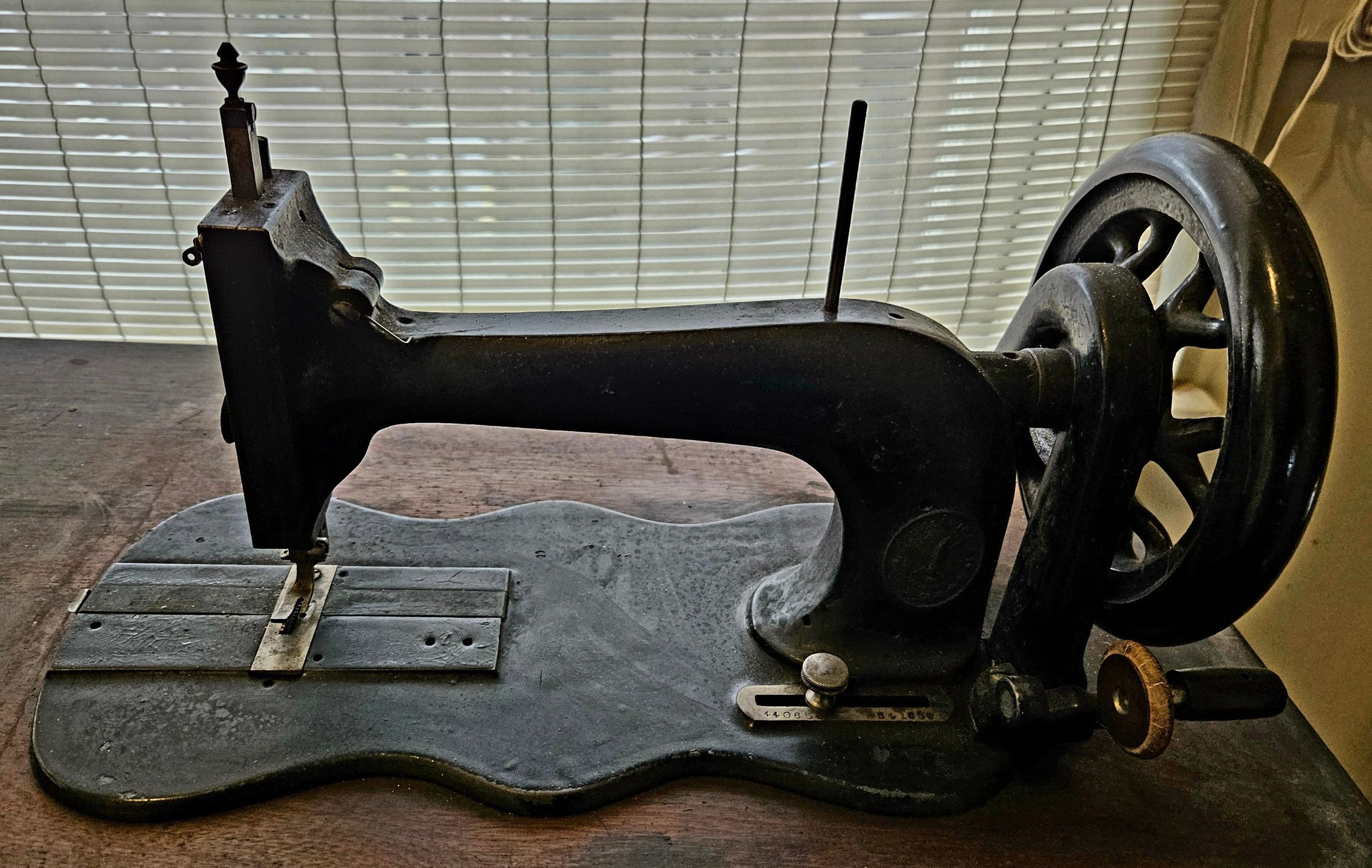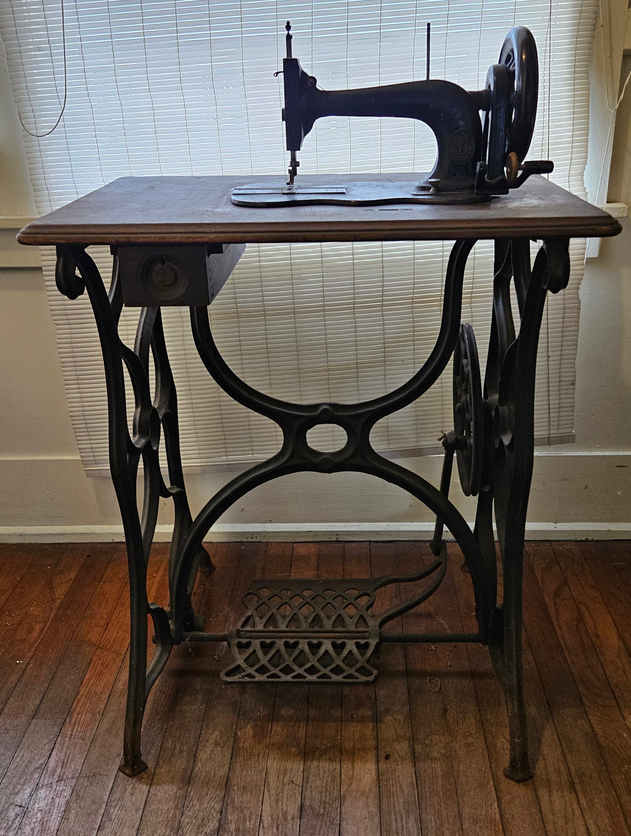 Singer New Family home sewing machine, serial no. 440656 341656. Wood and iron cabinet. Treadle. Steel machine, painted black, with "guitar-shaped" base. Once had gold leafing, but very little left. No. allotted: 47,000. Allotment year: 1870. Factory: New York City Mott Street. For Singer serial numbers, see https://ismacs.net/singer_sewing_machine_company/early-serial-numbers/singer-sewing-machine-early-serial-number-database.html.Context