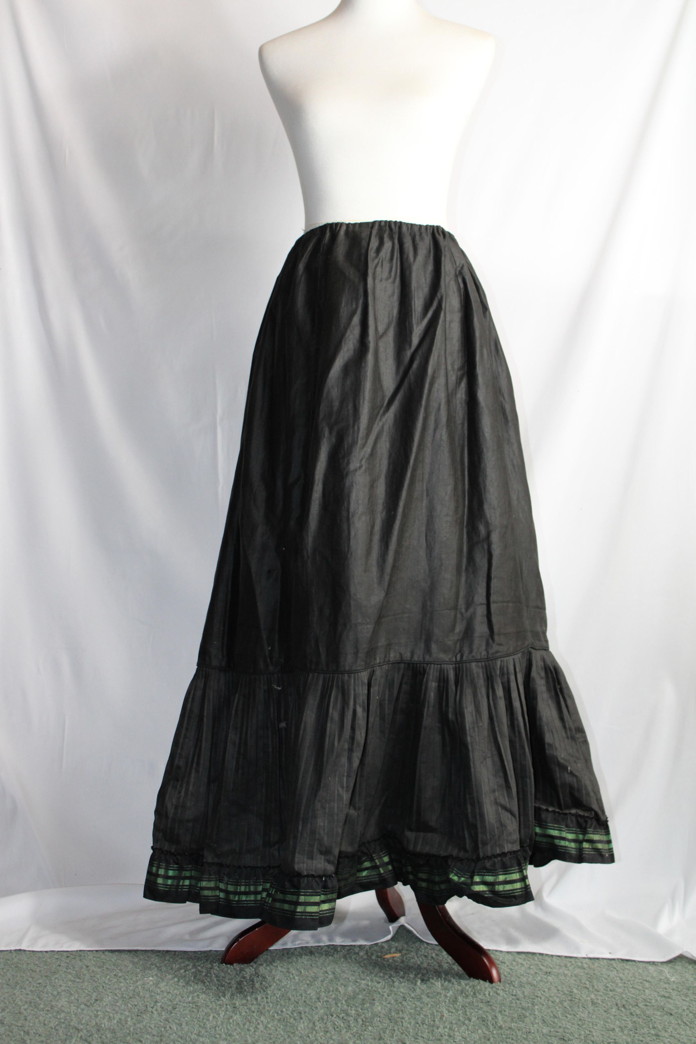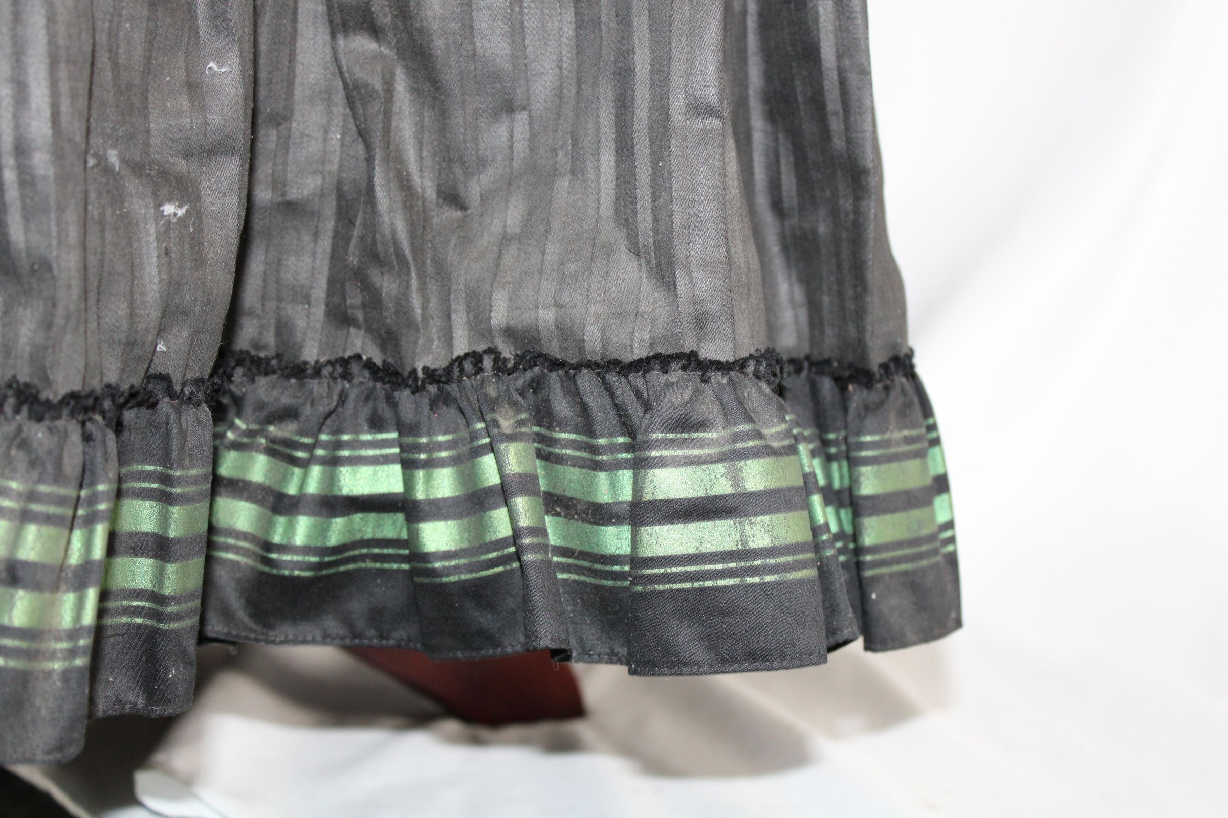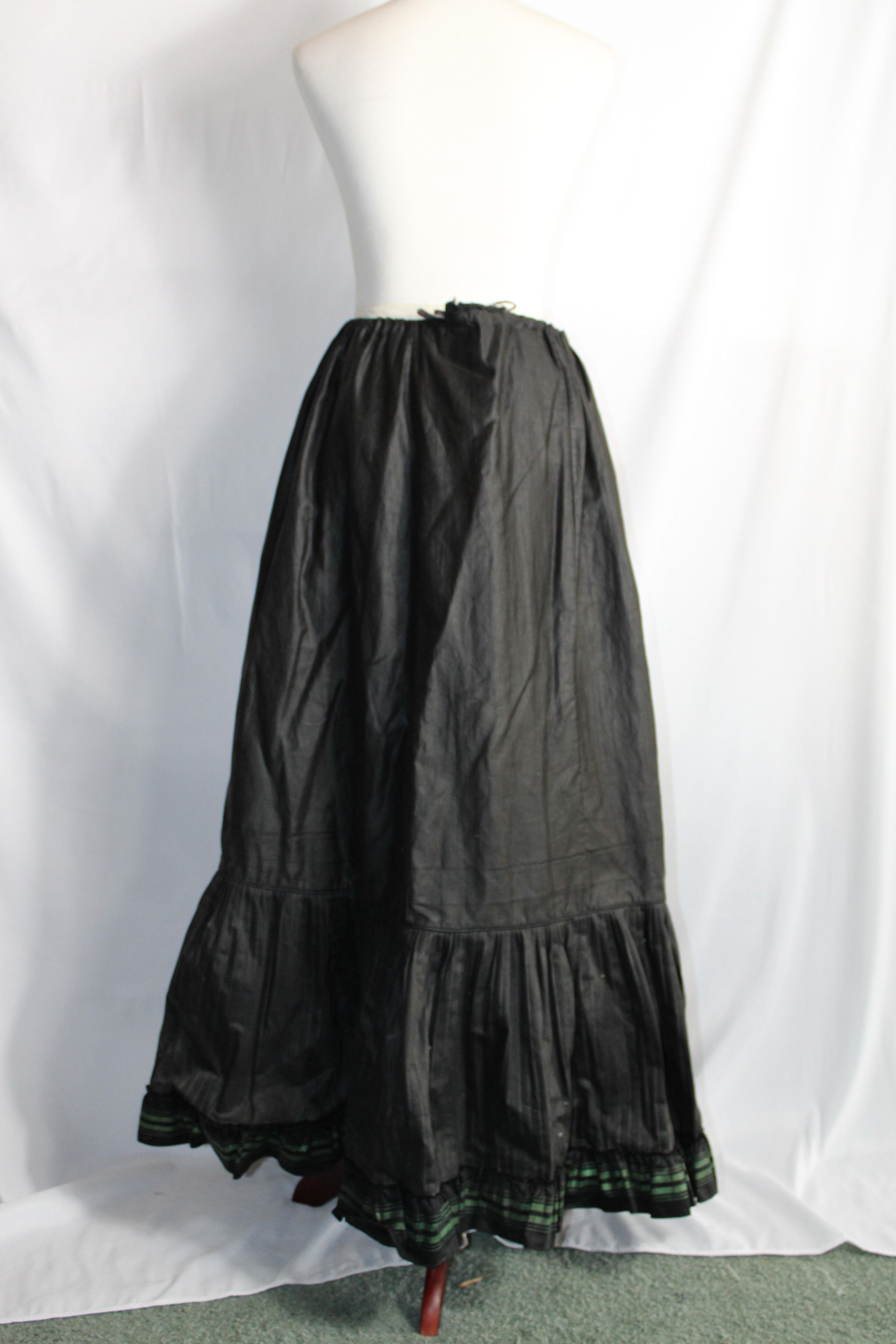 A black drawstring skirt with a green striped ruffle at the bottom. Likely includes an arsenic compound.Collection