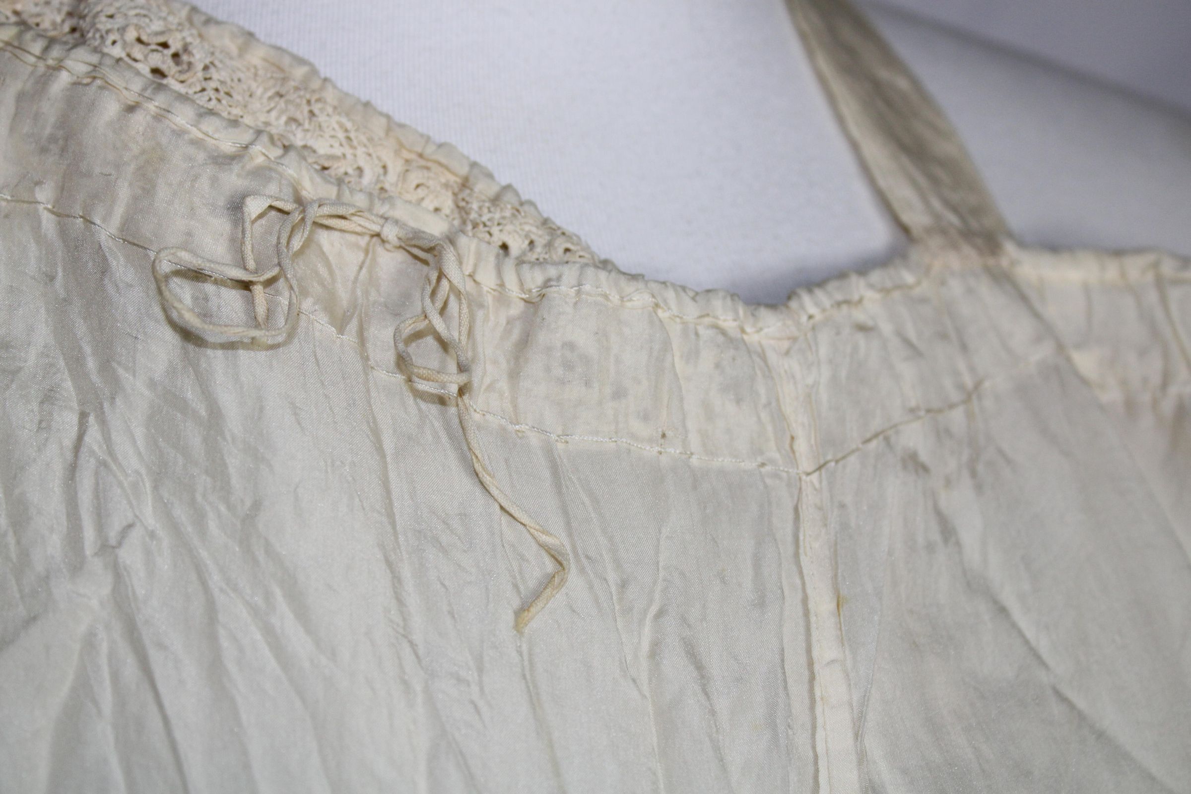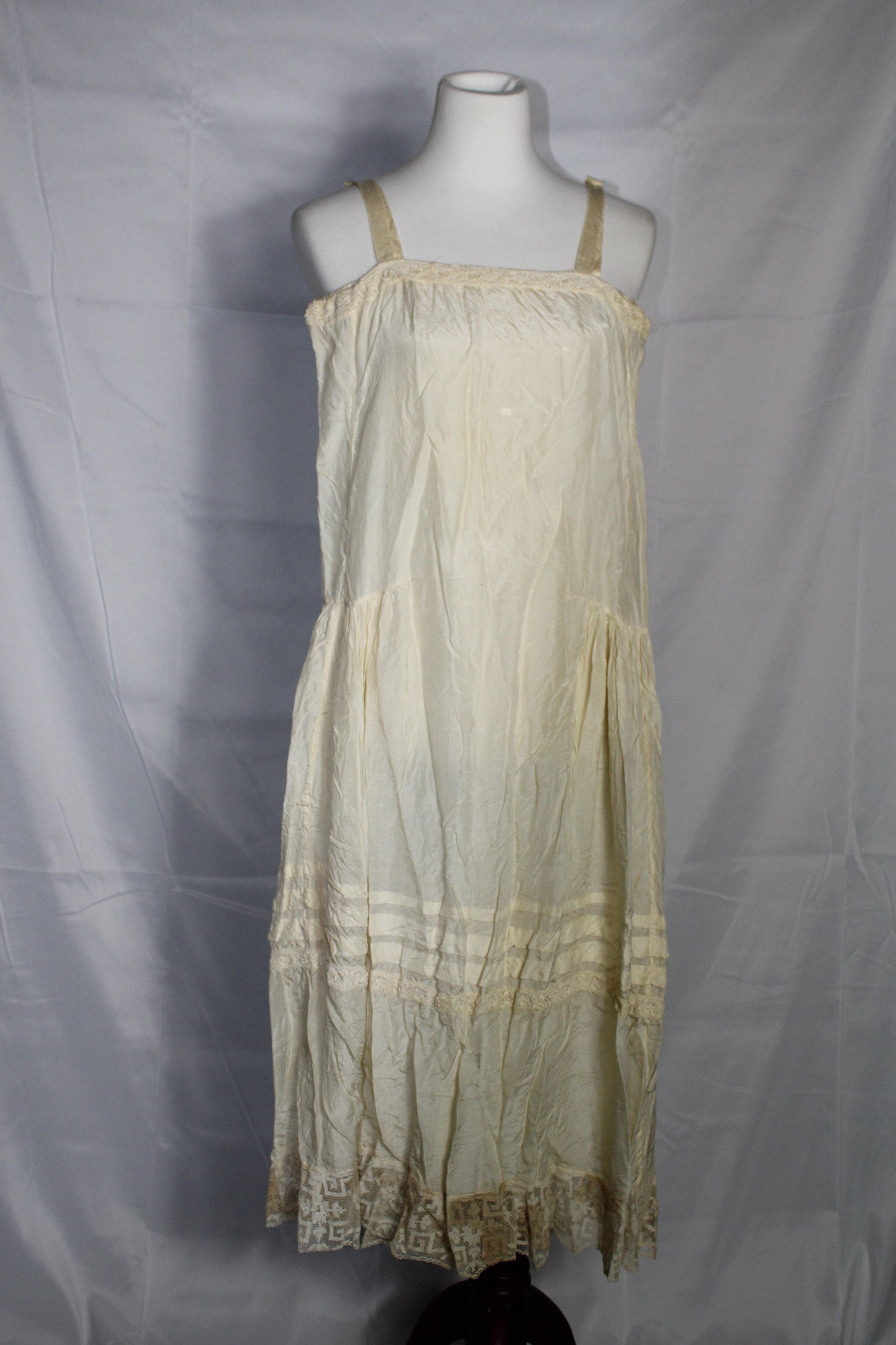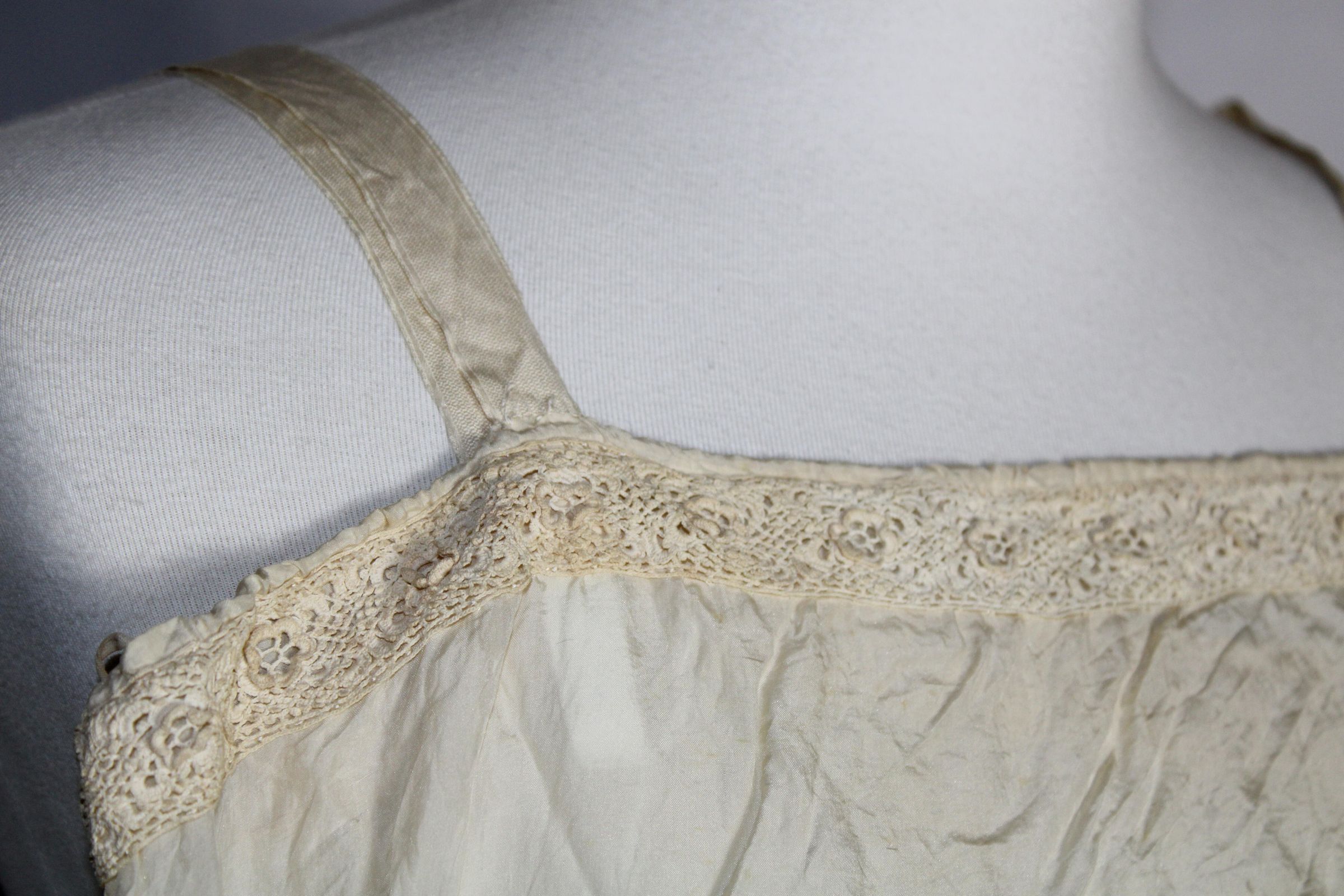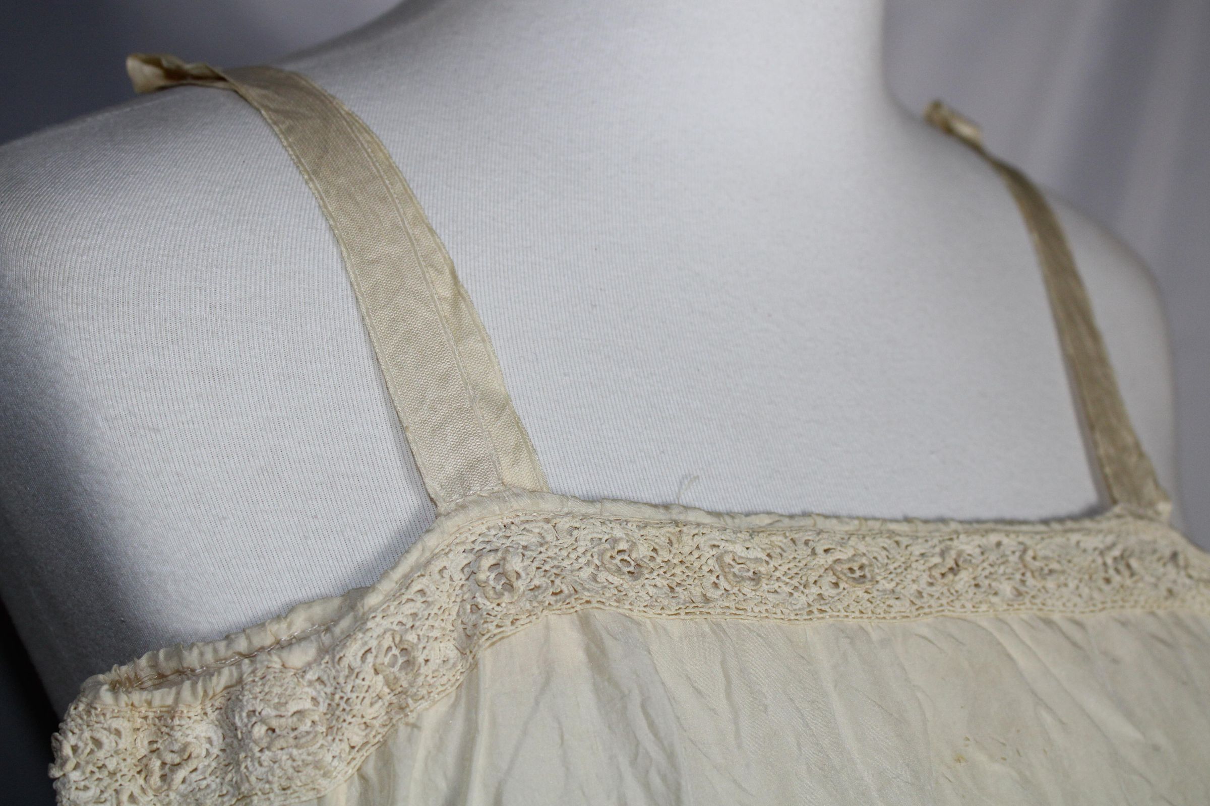 Lightweight slip decorated with crochet lace and pin tucks. Geometric bobbin lace along hem. Small darning spots on front bust.Collection