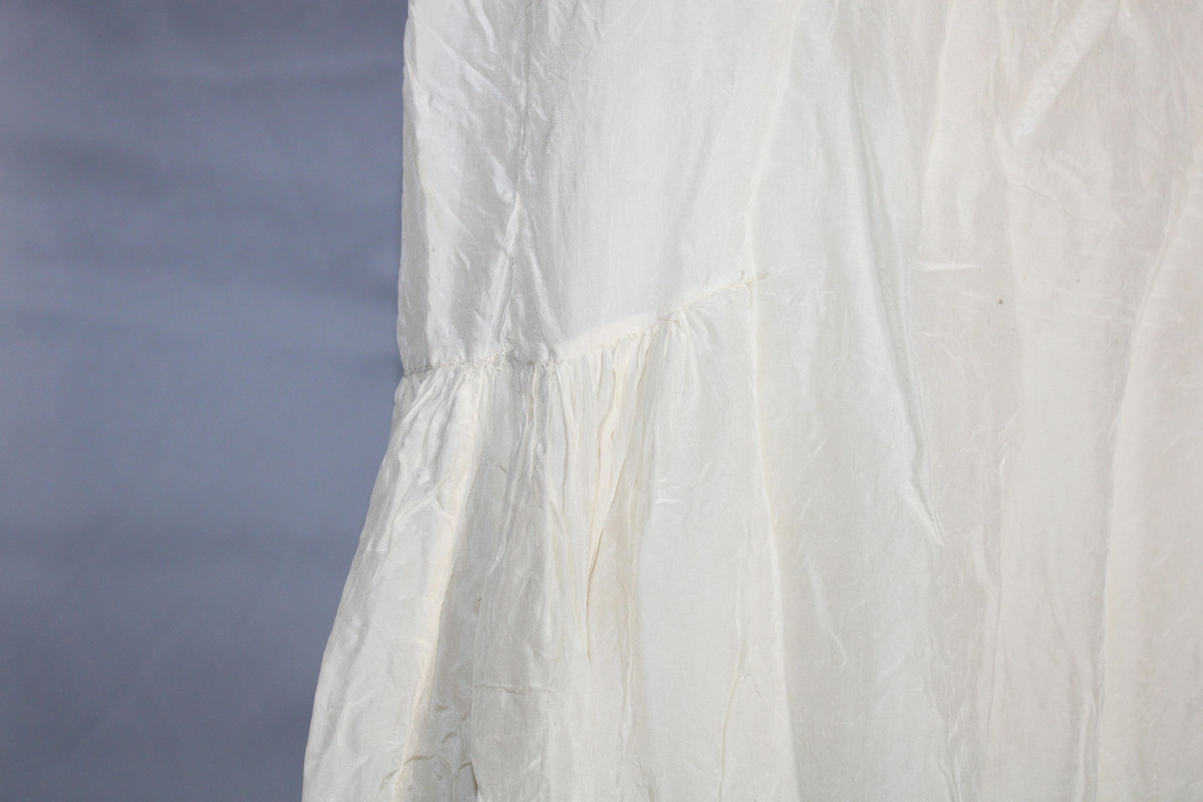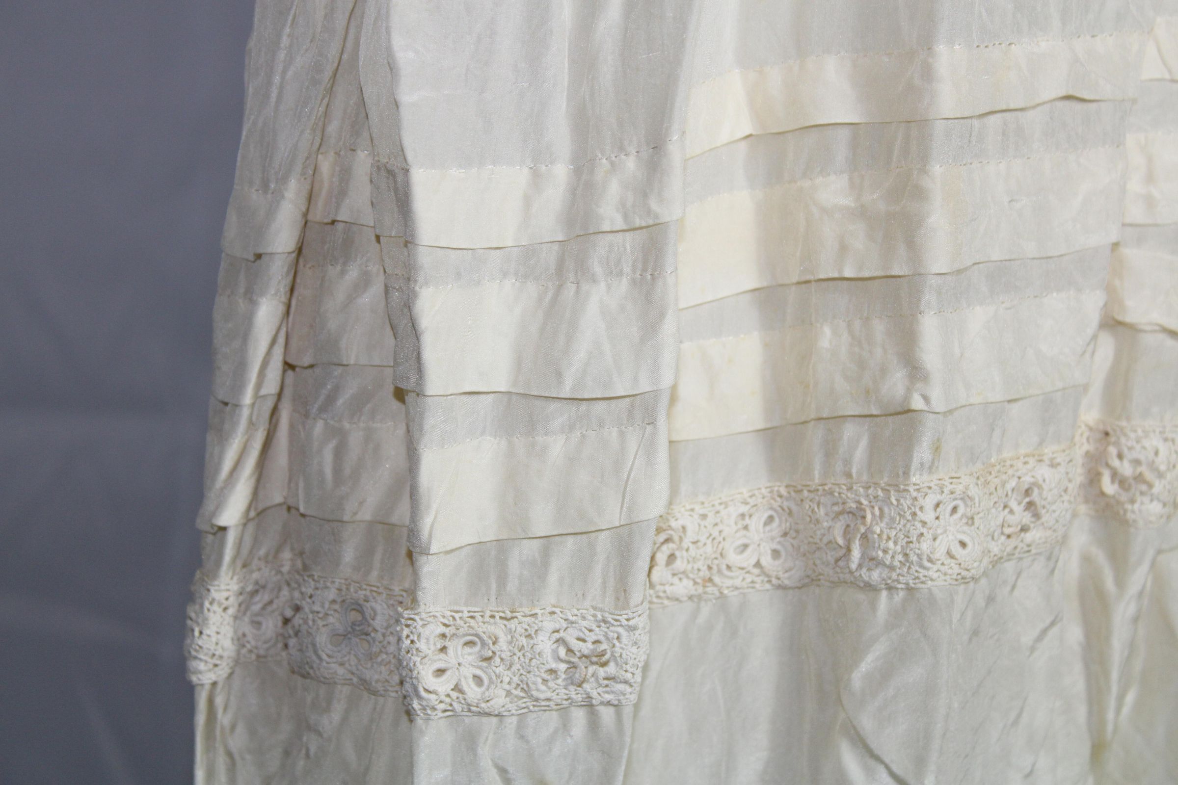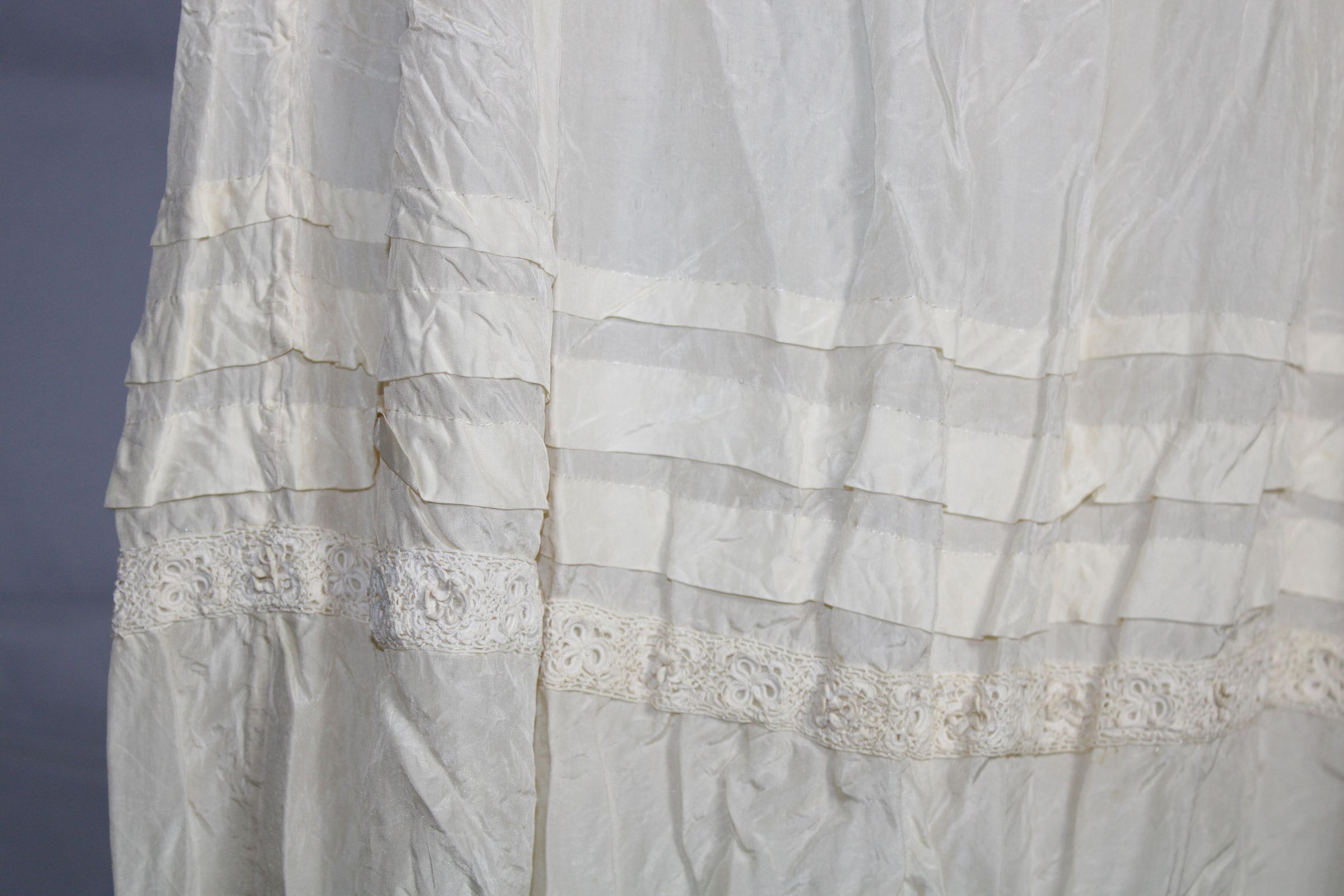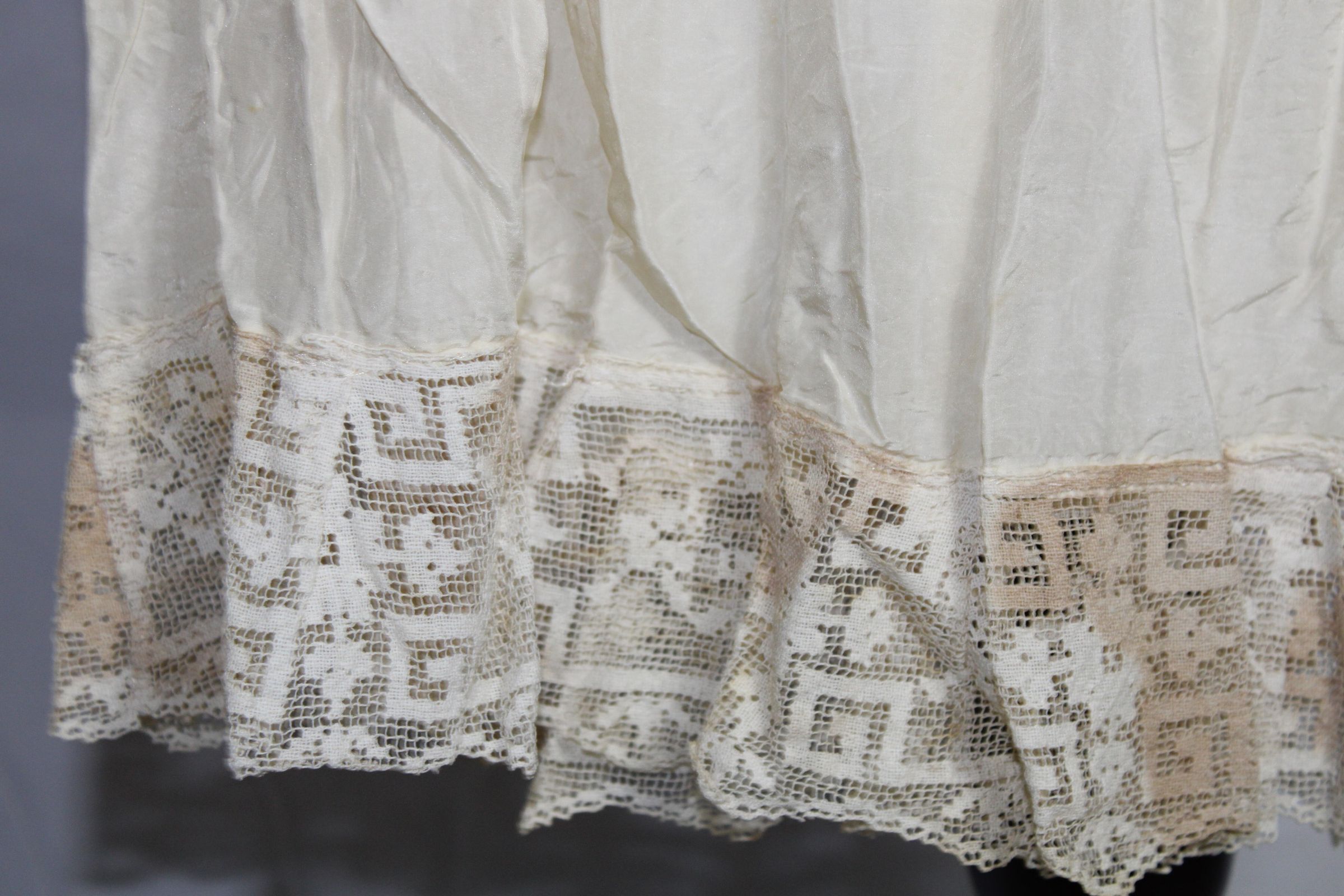 Lightweight slip decorated with crochet lace and pin tucks. Geometric bobbin lace along hem. Small darning spots on front bust.Collection