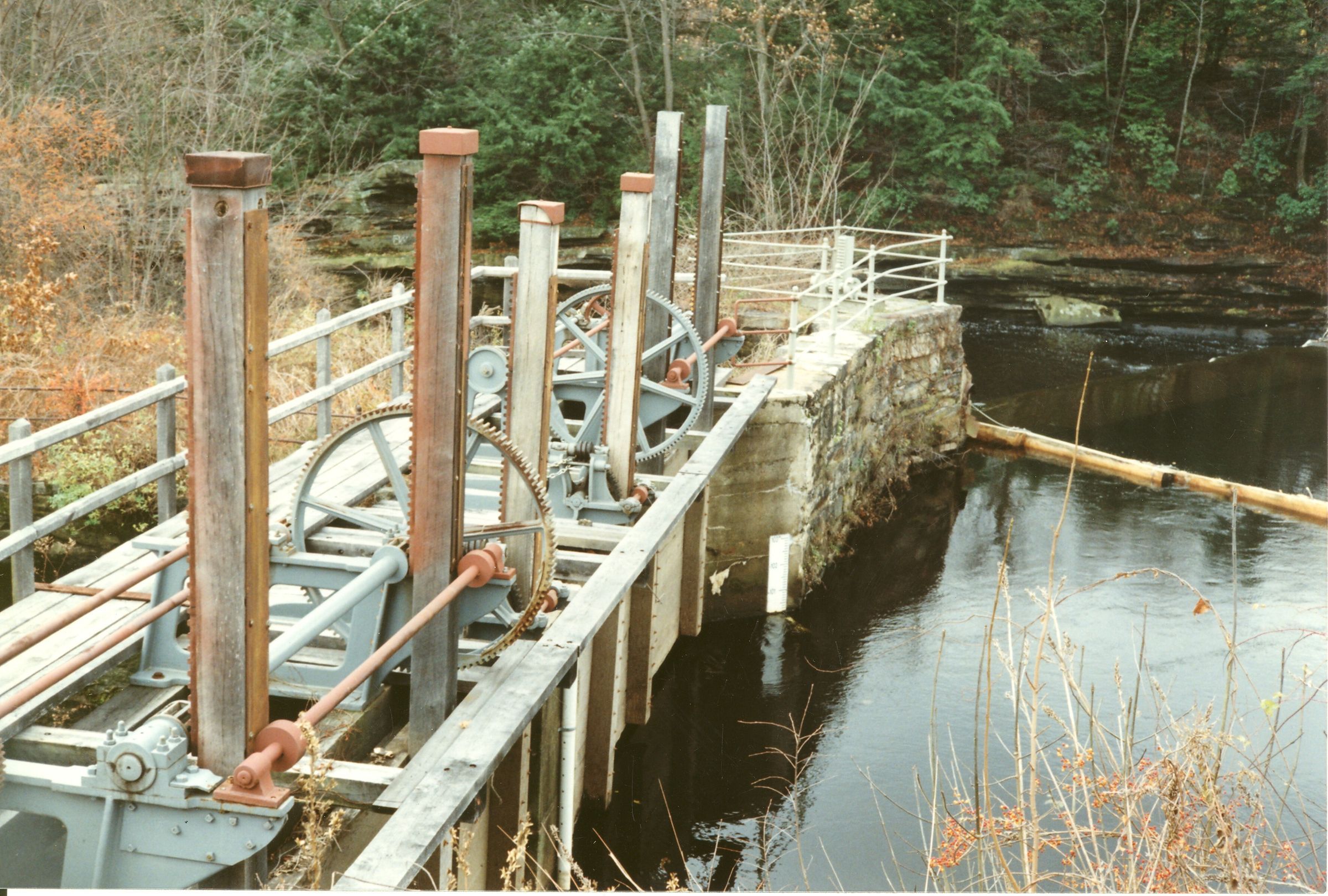 Color photographic print of the sluice gates to Mill No. 1, American Thread Company, Willimantic, CT. C. 1987.Photograph Details