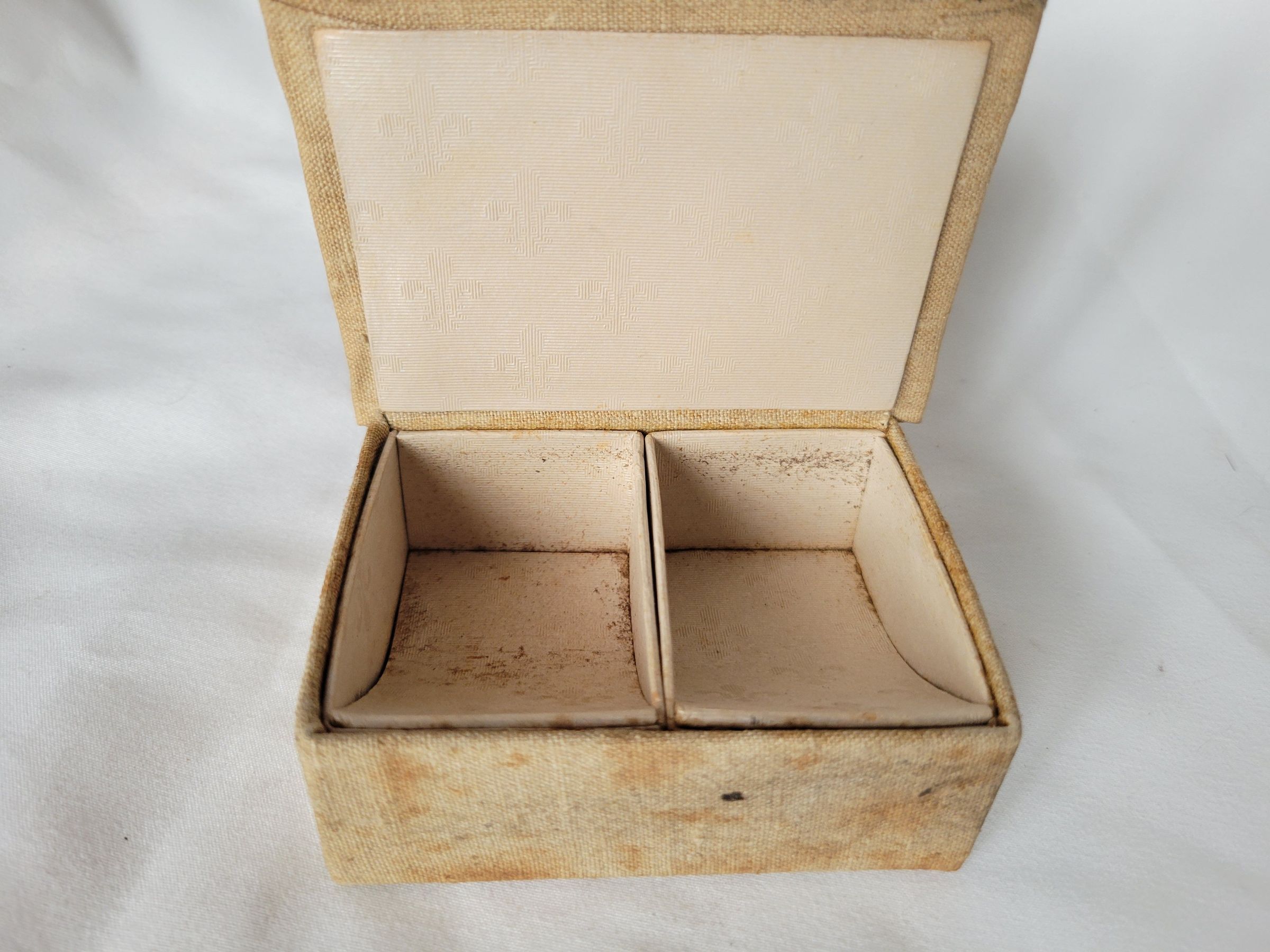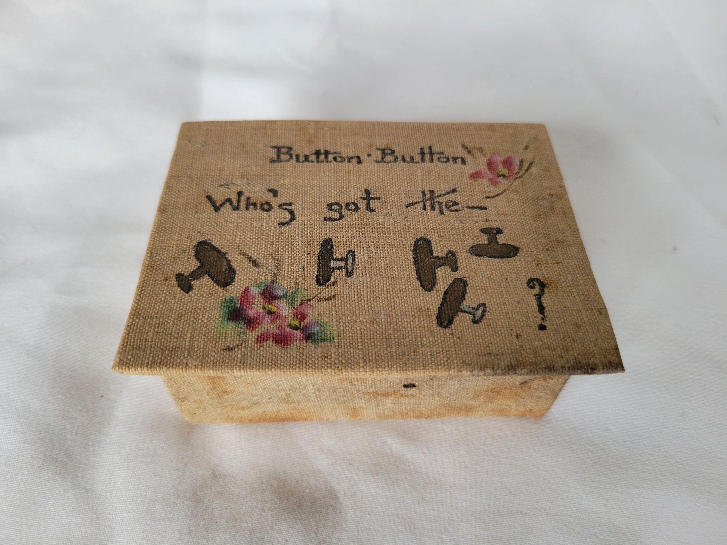 A small beige cloth covered box. It has two small pink flowers printed on the fabric and handwritten in black on the lid is "Button Button/Who's got the-" with illustrations of what may be five stud buttons. Inside the box are two sloped compartments. The box may originally have been for jewelry, the sloped sides to more easily get out small pieces, though it seems it was most recently used to hold buttons. The box is heavily stained but the material is intact, as is the cardboard interior.Collection