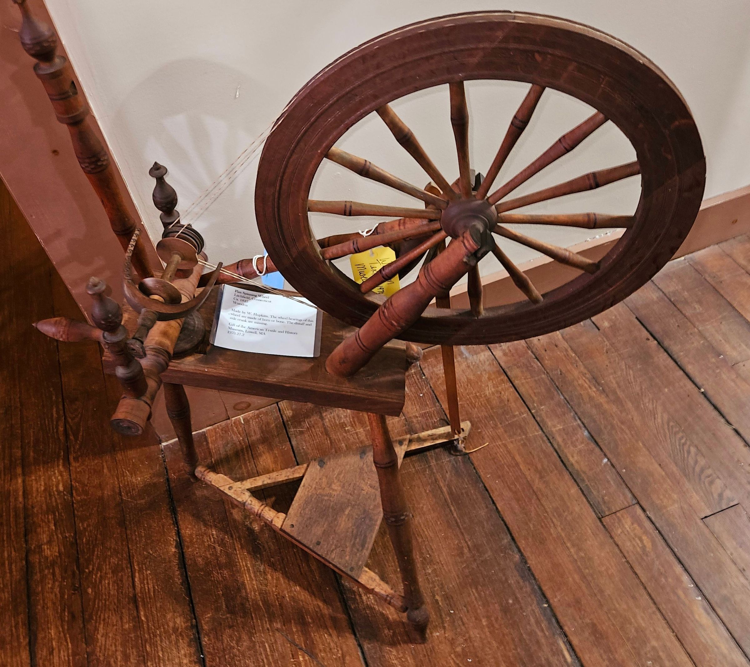 Flax spinning wheel. Striped wheel. Wheel bearings are made of horn or bone. Made by William Hopkins of Litchfield, CT, c. 1825. Establishing that there did exist a wheel-maker named William Hopkins in Litchfield in 1825, Elizabeth Cynthia Barney Buell, in "The Tale of the Spinning Wheel" (Cambridge, MA: University Press, John Wilson & Son / Litchfield, CT, 1903), pp. 27-29, [https://www.gutenberg.org/files/58950/58950-h/58950-h.htm] writes: "Here is a wool-wheel [owned by the Litchfield Historical Society] (see illustration), not so old as many others, perhaps, but all the more interesting for that, inasmuch as it proves how recently the real old homespun held its place amongst us. This wheel is a little out of the common. It was made by one William Hopkins, a resident of Litchfield, for his daughter, Nicey Melinda, about 1825. William Hopkins was a direct descendant of Joseph Harris, one of Litchfield's pioneers, who fell a victim to the tomahawk on Harris Plains in 1723. He had married Mary Hopkins of West Hartford, and lived just below the Symington Cottage. His daughter Abigail married a cousin Asa Hopikins, and their son Harris married Margaret Peck, sister of Paul Peck, 'the mighty hunter,' and became the father of William Hopkins of the spinning-wheel. William was a clever mechanic, and made this wheel to suit Nicey's particular fancy. It has two heads instead of one, -- a new and an old fashioned one, -- and the edge of the wheel is narrow and has a little groove in it instead of being broad and flat. Nicey Melinda married John A. Woodruff, and lived on a farm this side of the Town-house first; then they sold out there and came into Litchfield, where they took up a residence on West Street. She died in 1888. She was Woodruff's second wife, and her step-daughter, Mrs. Abbie M. Woodruff Newcomb, was loaned to the Litchfield Historical Society a collection of linen spun and woven by her. It consists of sheets, pillow-slips, as they were called, and table-cloths; and there is also a red broadcloth cloak entirely home-made. Her reel is also still in existence, and had been presented to this Society. The illustration shows the marking on the linen worked by her in black sewing-silk, the fine threads being counted at every stitch. Think of the labor represented by every inch of this linen, whose sheen is hardly surpassed by the finest silk or satin, made on a lonely Connecticut farm by a busy woman, for whom it was only one of innumerable other tasks." Although Buel's article references a wool wheel, it also mentions flax production. Indeed, the books contains illustrations in the form of line drawings by Emily Noyes Vanderpoel, including one of "Nicy [sic] Melinda's wool wheel" (a great wheel, and is noted as being part of the Litchfield Historical Society's collection) and another of a "flax wheel" that closely resembles this wheel. Currently, the Litchfield Historical Society has the originals of both illustrations in its a collection, along with two clock reels attributed to William Hopkins, and a woolen wheel with no attribution. See https://bento.collection.litchfieldhistoricalsociety.org/bento/search/?kw=Hopkins+spinning+wheel. Tilted towards bobbin and flyer; 3 legs. Driving wheel (1) diameter 20 inches; 14 spokes; 3/4 in. rim width; 2 grooves in rim; axle 25 3/4 in. from floor. Bobbin missing; flyer u-shaped, 4.5 in diameter, 10 hooks on each arm. Distaff missing. Tensioning device on bobbin and flyer adjusted by slide and screw. Power transmission: bobbin (missing) and flyer powered by treadle; flyer pulley diameter 1 7/8 in. Construction: made entirely of wood (jointed and nailed); metal axles to bobbin and flyer, wheel, and treadle. Ornament: mild turnings on wooden stocks; painted at one time; deptical goudge in flower pattern.Use