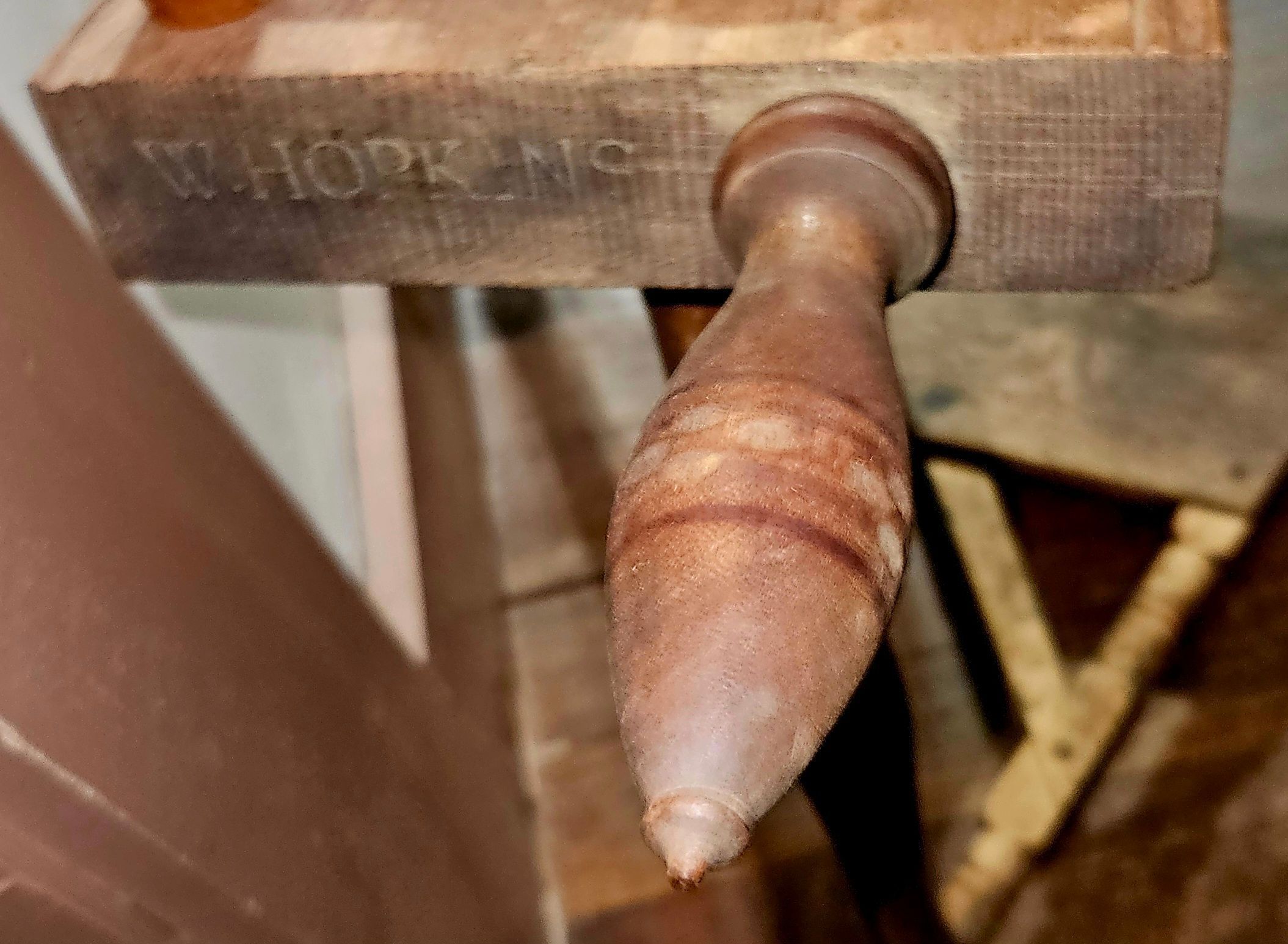 "W. HOPKINS" stamped on bobbin and flyer end of table. ATHM paperwork indicates that the object was donated with other items as part of the estate of Elmer D. Keith of Clintonville, CT, in August, 1970.Owner/Agent