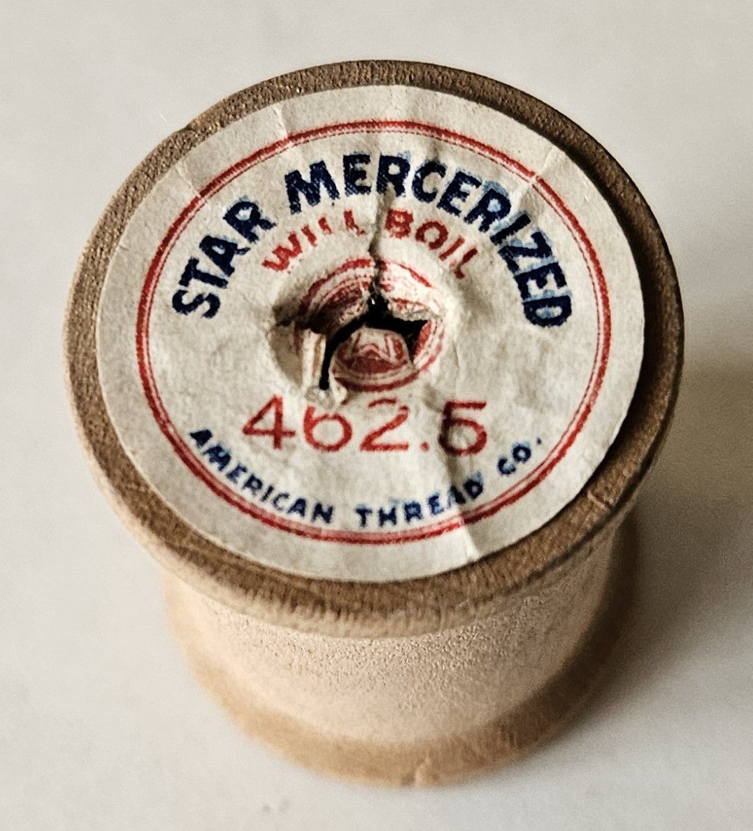 Empty wooden thread spool. The label reads: "Star Mercerized, Will Boil, 462.5, American Thread Co." The label also features ATCO's star logo.Use