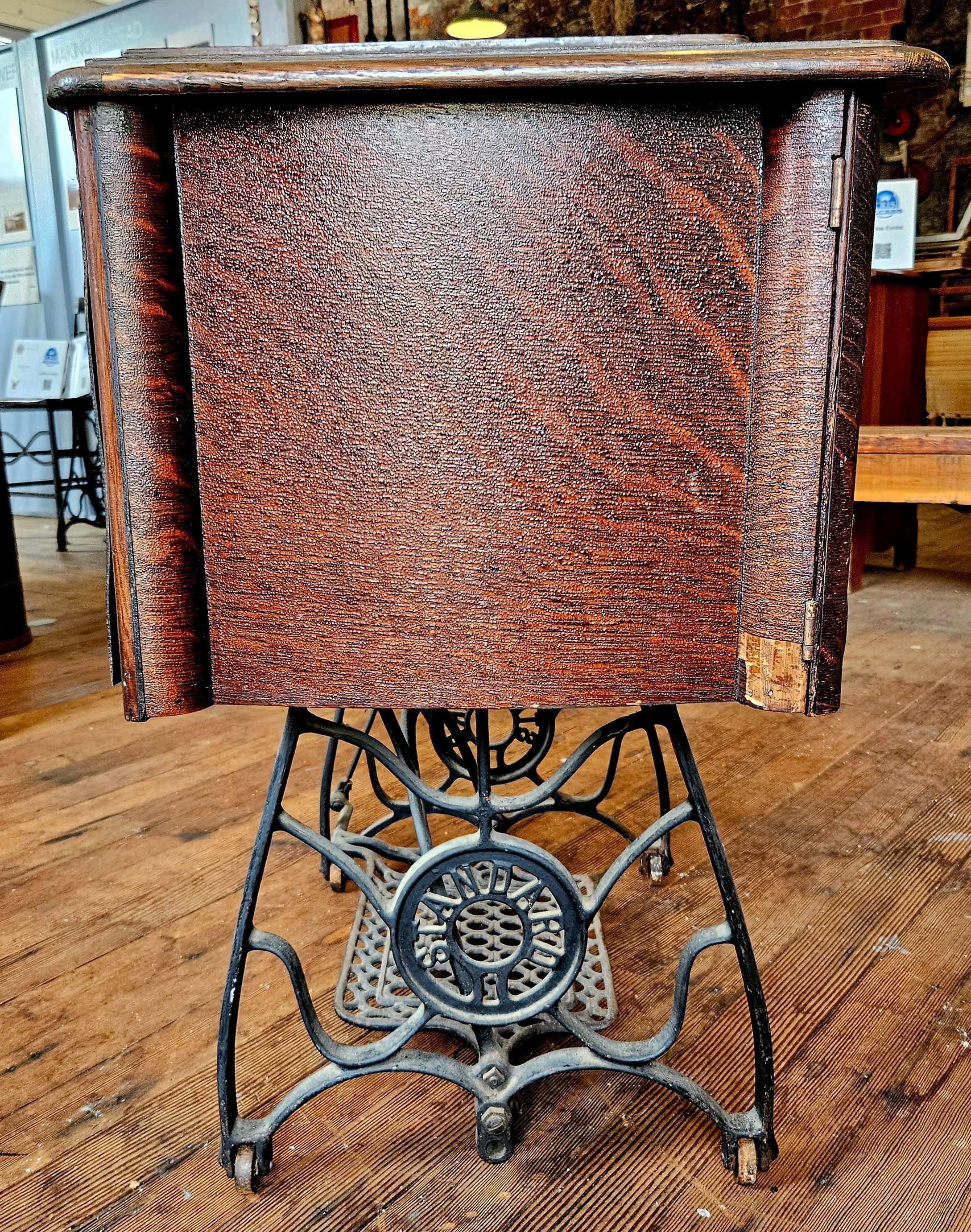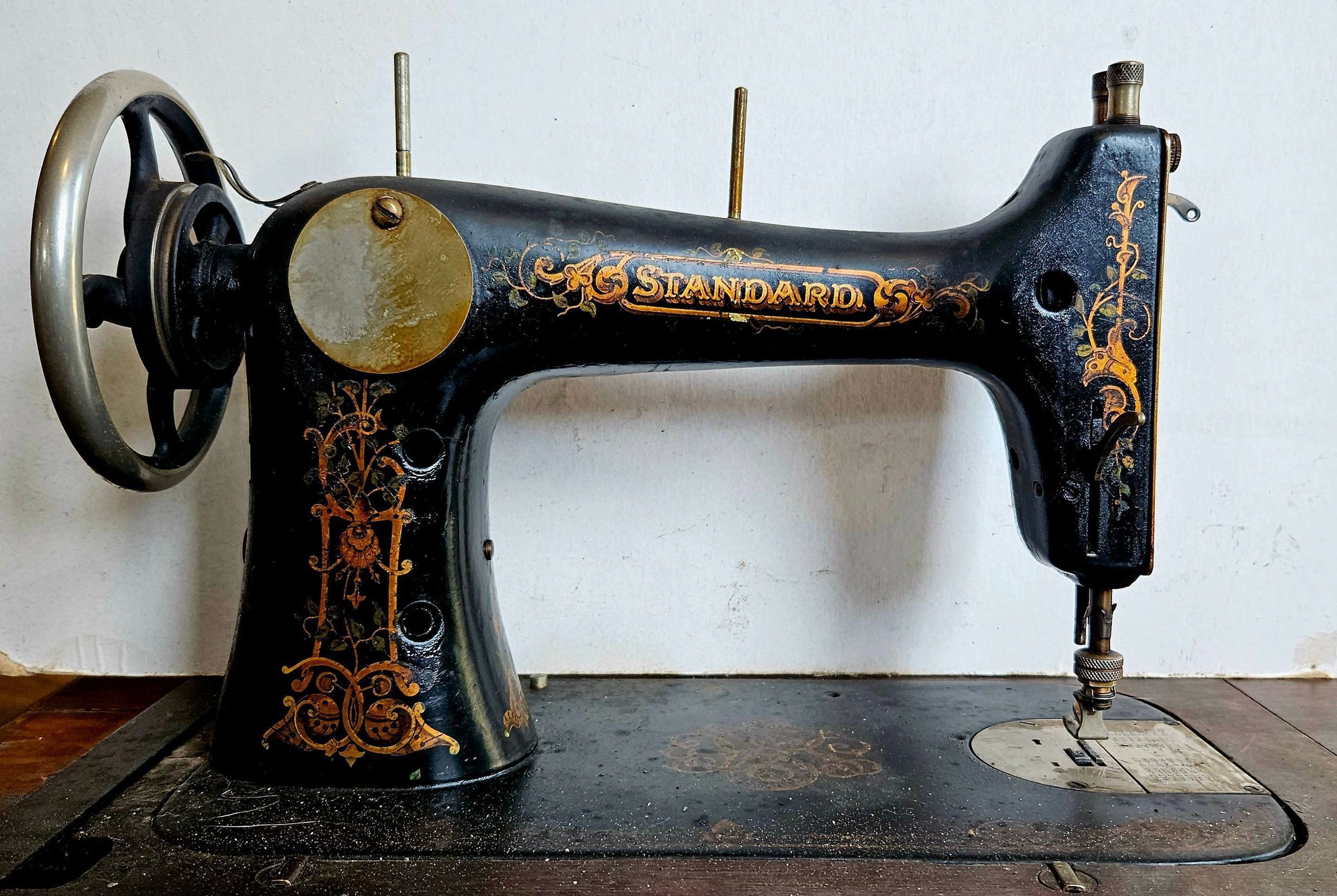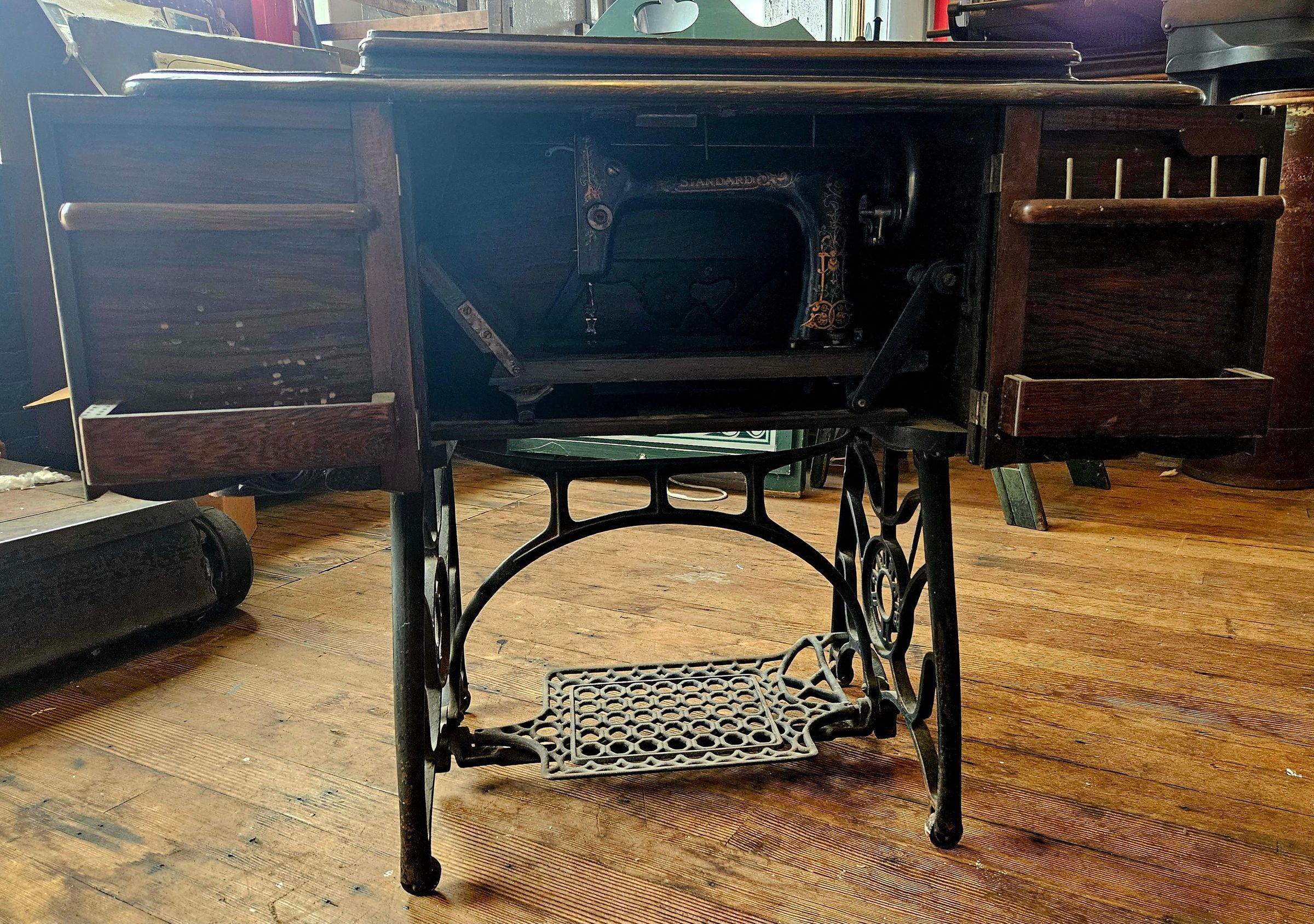 Standard brand treadle sewing machine in cabinet, c. 1905. The Standard Sewing Machine Company was founded in 1884 and located in Cleveland, OH. It was one of the many sewing machine companies founded after the dissolution of the Sewing Machine Combination, a patent pool and trust created by the Howe, Singer, Wheeler & Wilson, and Grover & Baker companies and based on the Elias Howe patent. See https://millmuseum.org/sewing-revolution/ for more information about the Combine. Standard's most popular model was the Standard Rotary, which was manufactured relative unchanged from the 1880s into the 1910s. This particular model carries patent dates through 1904. (Standard also made the Minnesota "L" and Kenmore sewing machines, the latter for Sears Roebuck.) Standard was bought by the Osaan Company in 1929, and later acquired by Singer in the 1930s. The sewing machine is a treadle-only machine; there is no motor.