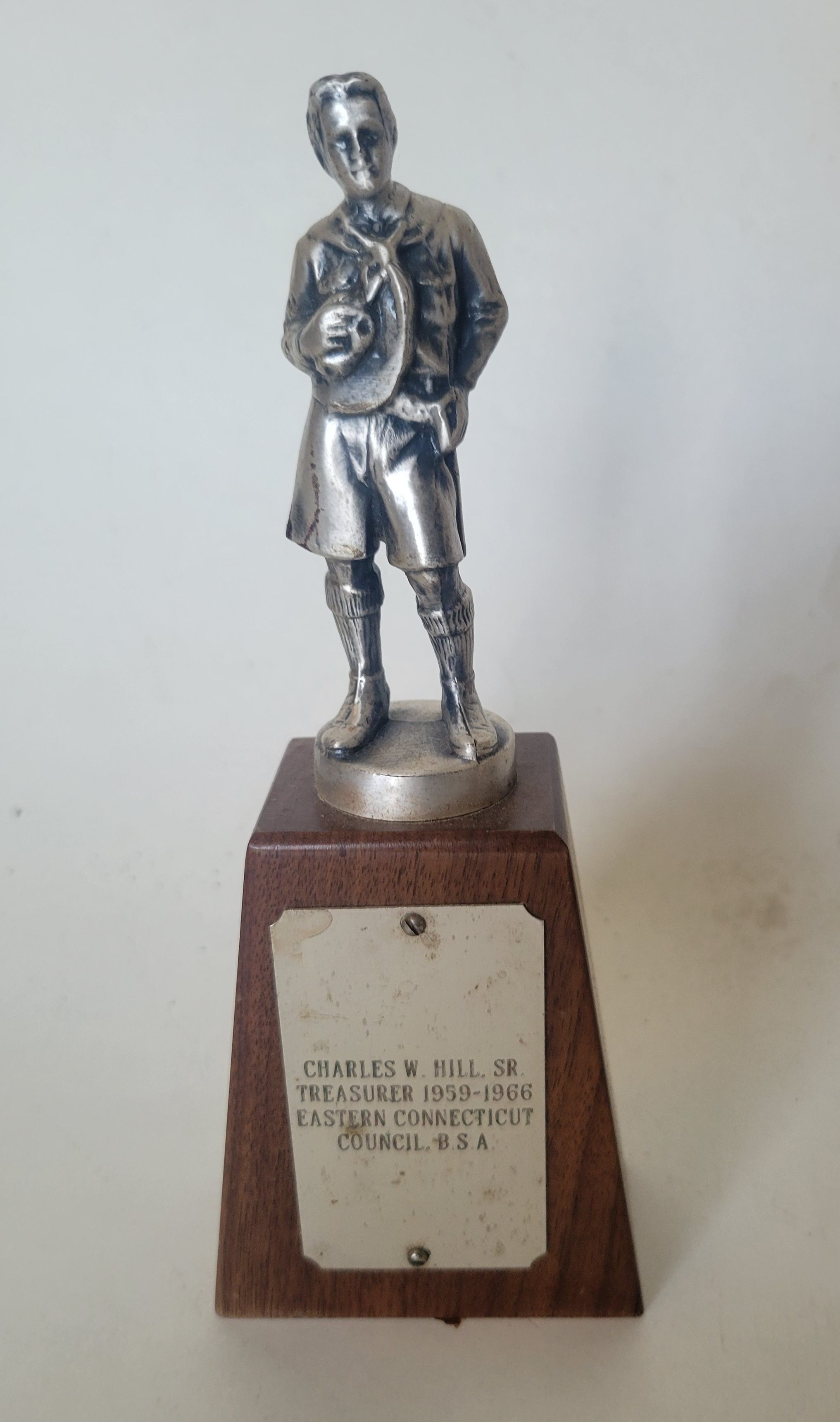 Statuette awarded to Charles W. Hill Sr. by the Boy Scouts of America Eastern Connecticut Council for his service as treasurer from 1959-1966.Collection
