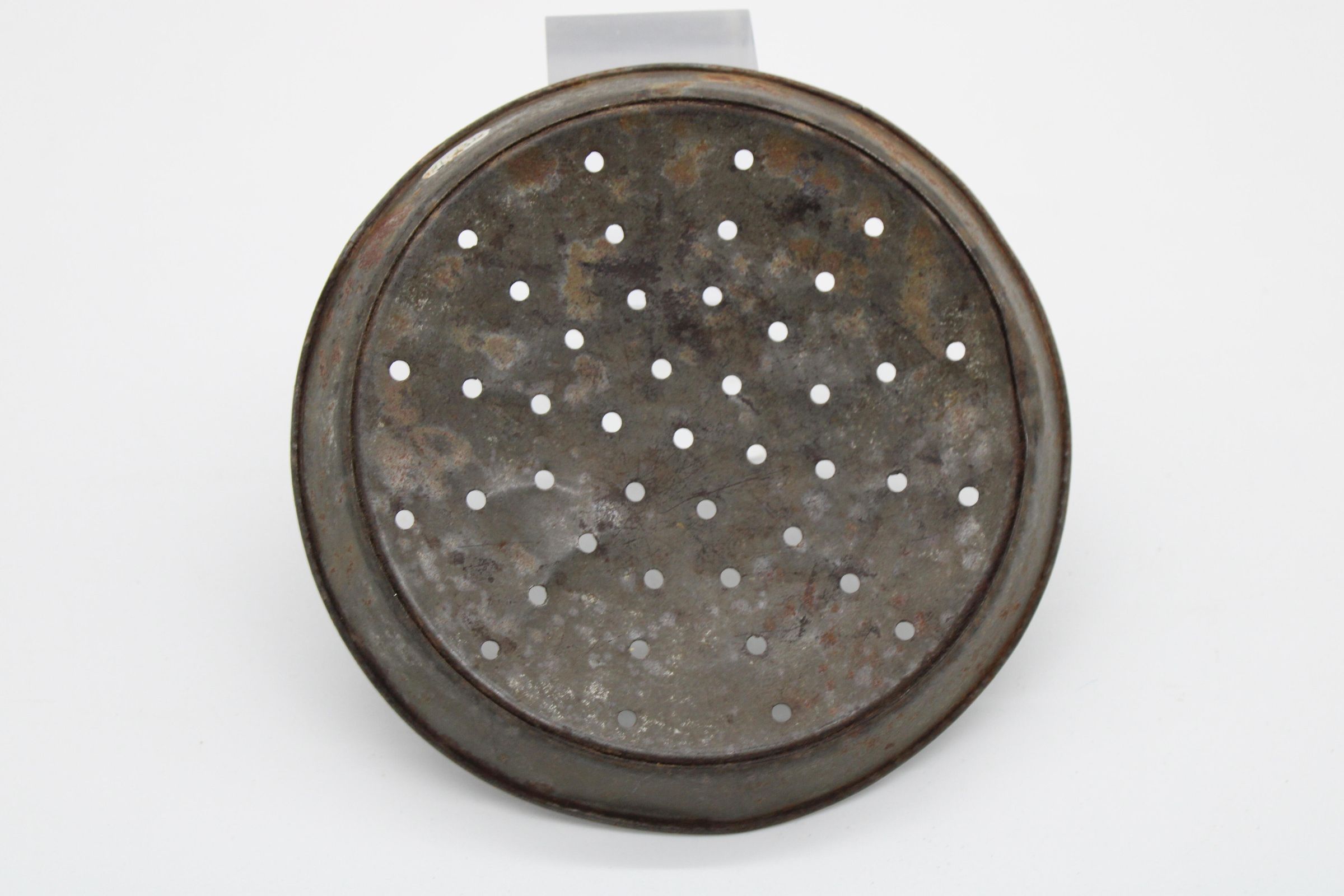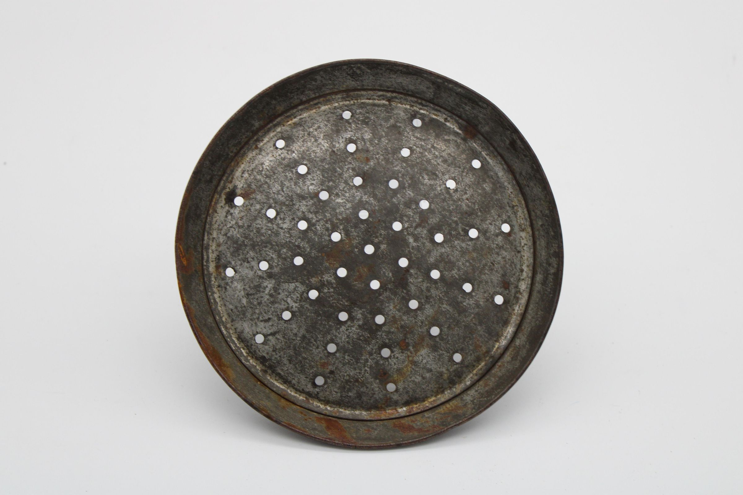 A rusted tin steamer plate. The holes are arranged in a radial hexagon.Location
