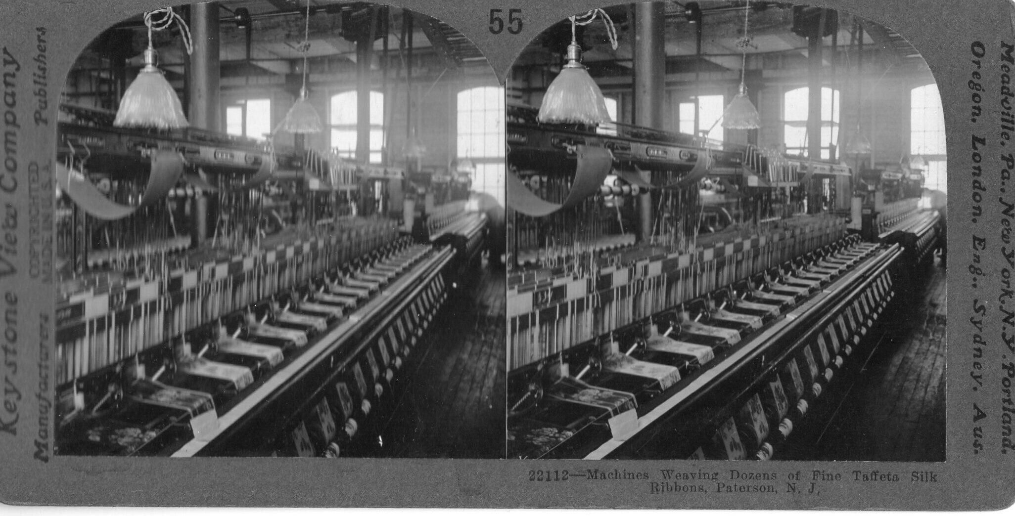 Keystone View Company made educational cards. This one displays machines weaving silk in Paterson, NJ, 1905.Photograph Details