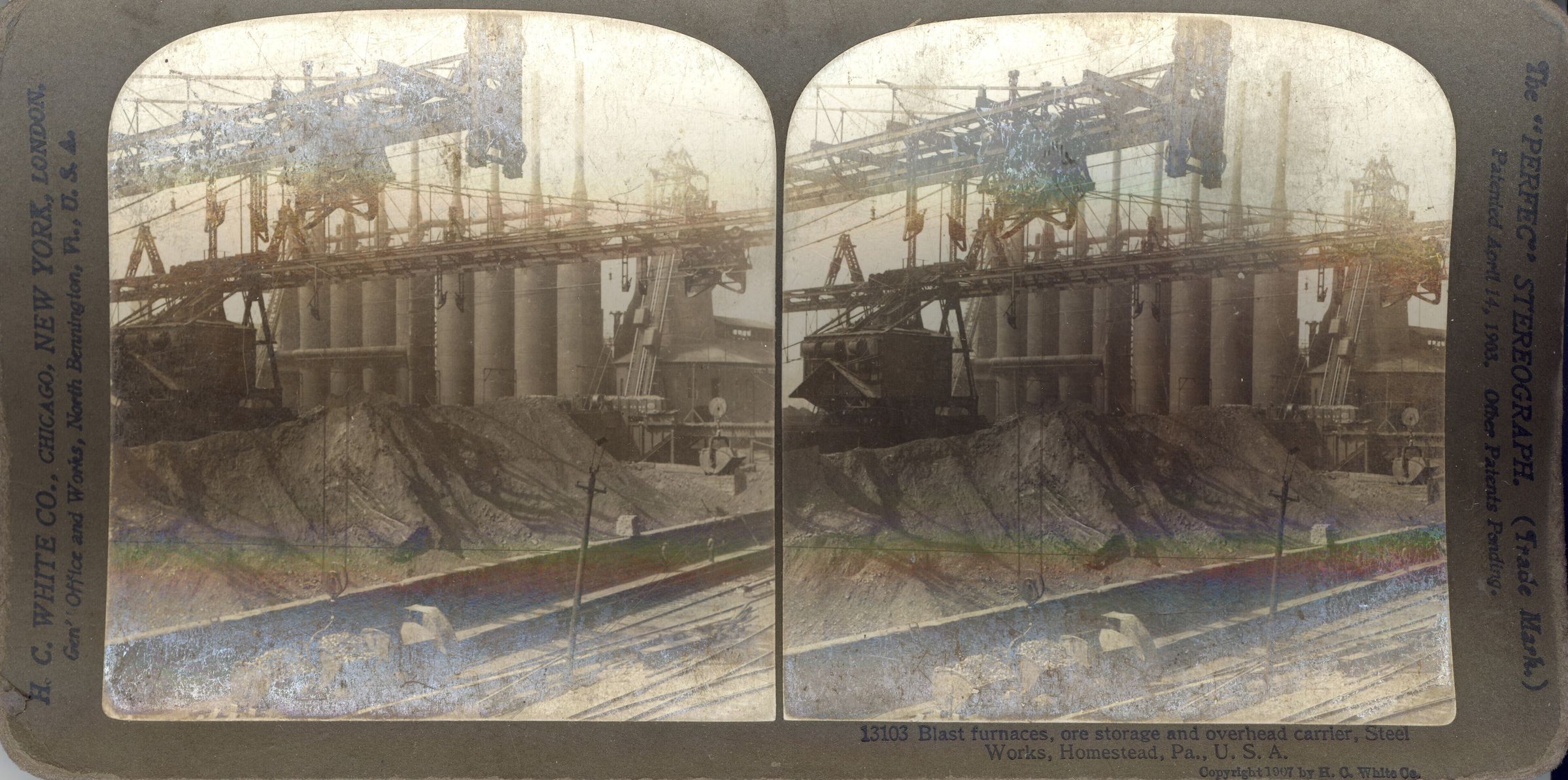 Stereograph of blast furnaces, ore storage, and overhead carrier, Steel Works, Homestead, PA, 1907. Black-and-white print on cardboard. Card is warped. H. C. White Co, North Bennington, VT. TM The "Perfect" Stereograph.Photograph Details