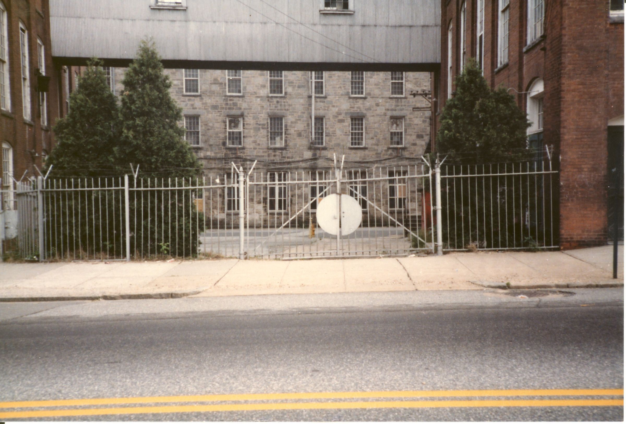 Color photographic print of stone dye house, American Thread Company, Willimantic, CT. Also shows parts of brick dye house (on left), Mill No. 6 (on right), bridge connecting brick dye house and Mill No. 6, and iron fence and gate. Unknown photographer. Taken c. 1987, shortly after ATCO closed its Willimantic plant.Photograph Details