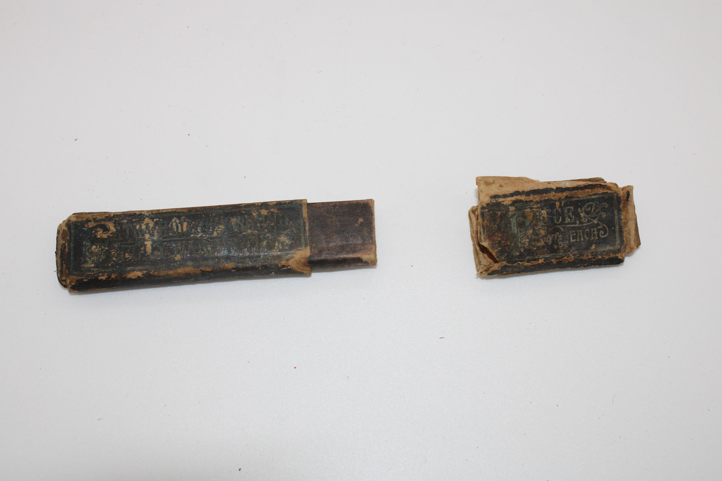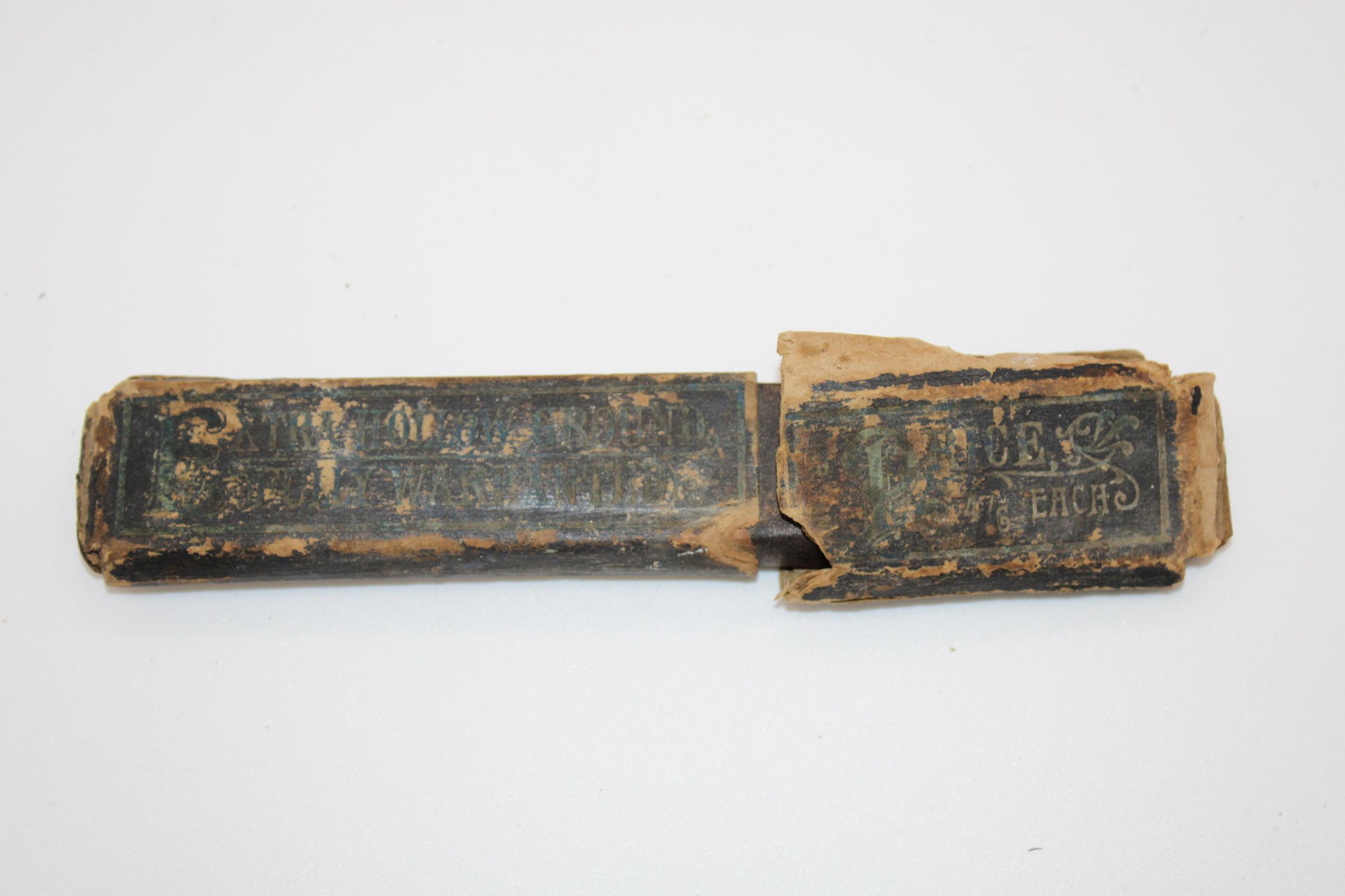 A case meant to hold a straight razor. Text on body reads: "EXTRA HOLLOW GROUND ??U?LY WARRANTED". Text on lid reads: "PRICE 3 47c EACH"Made/Created