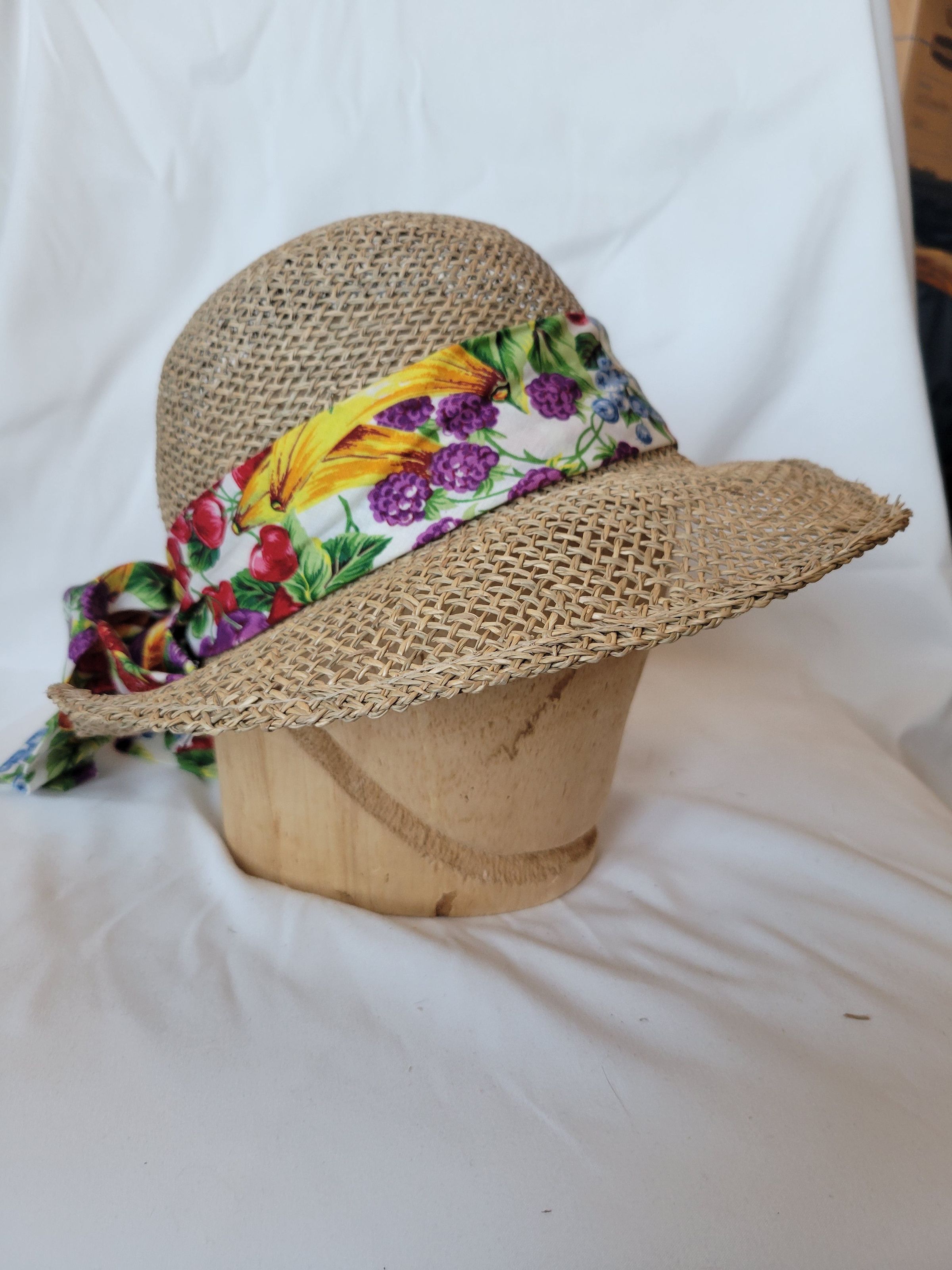 A tan straw sun hat with fruit and floral band. The brim is bent out of shape.Collection
