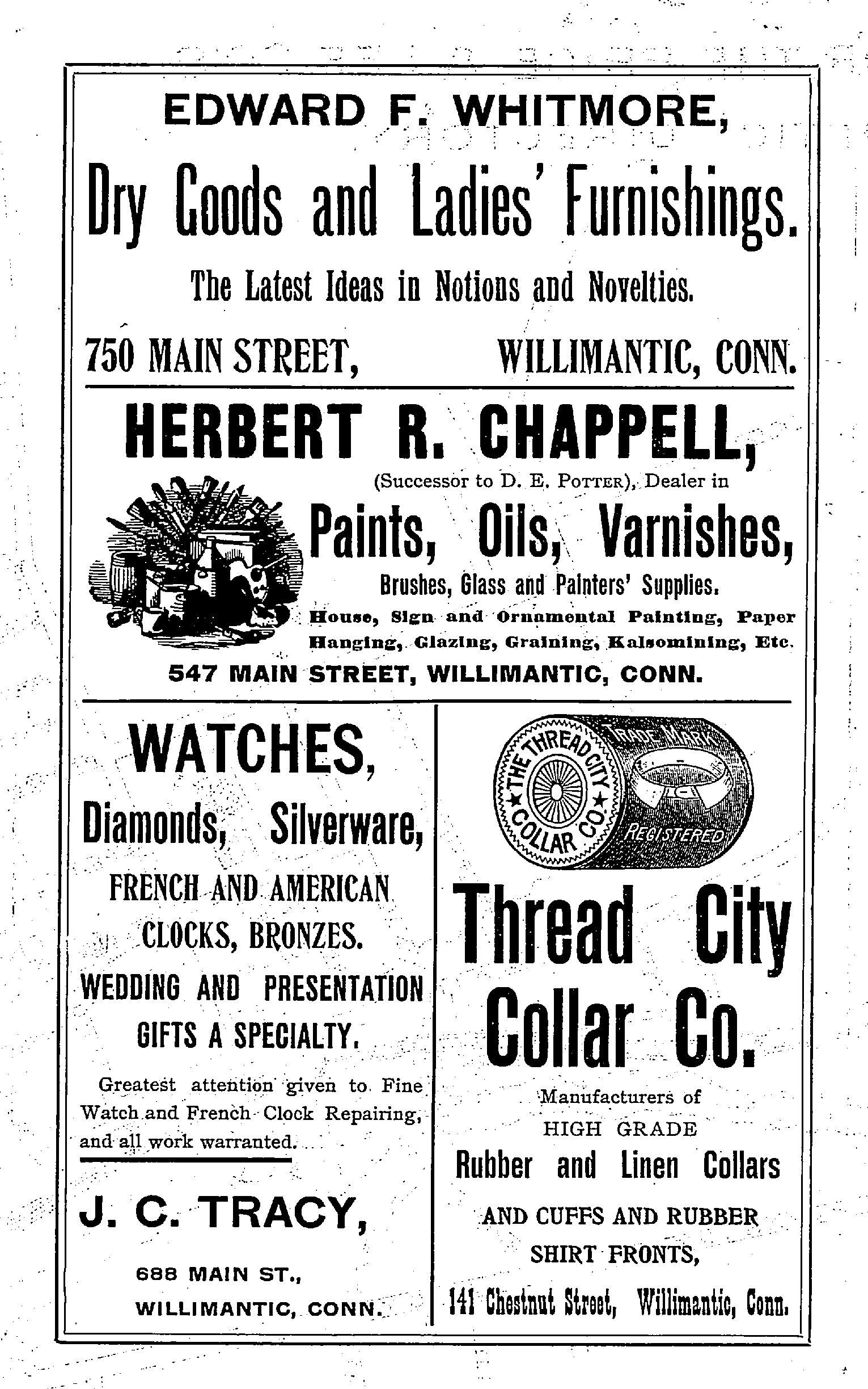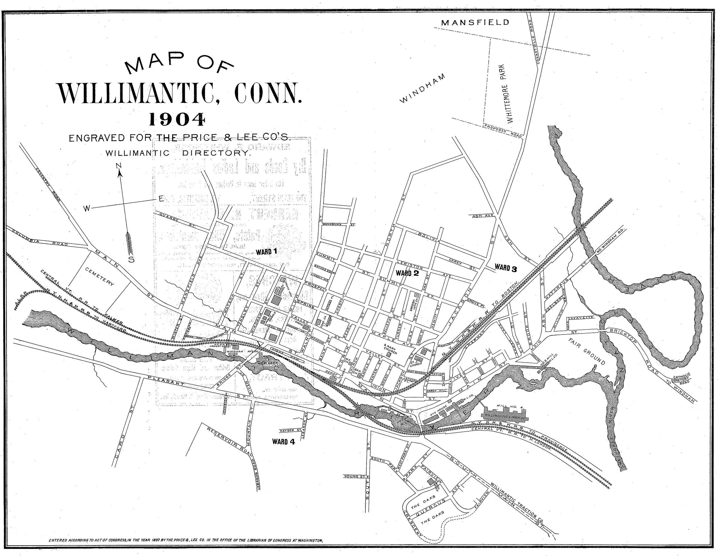 Street map of Willimantic, CT. 1904. Engraved for the Price and Lee Company of New Haven, CT, for its Willimantic street directory for the year.Collection
