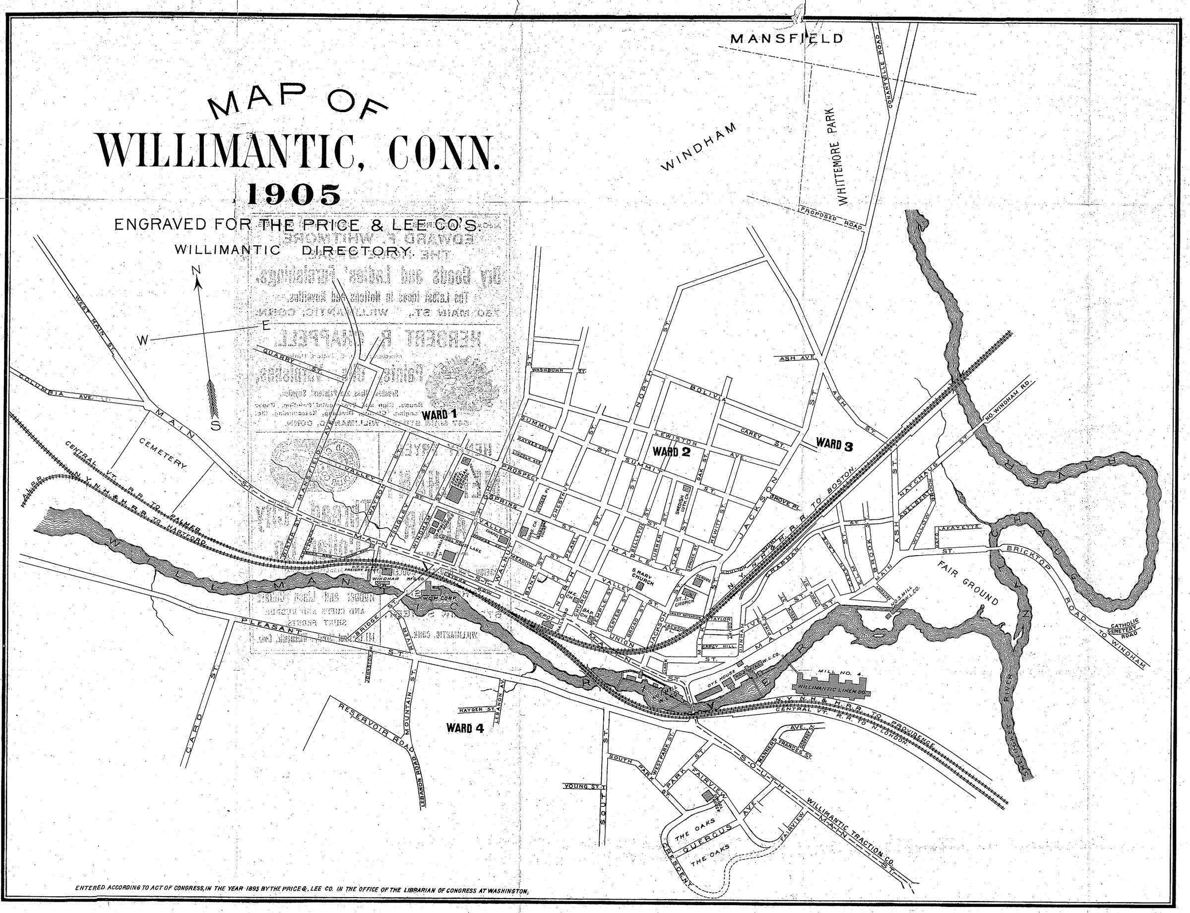 Street map of Willimantic, CT. 1905. Engraved for Price and Lee Company's Willimantic street directory.Collection