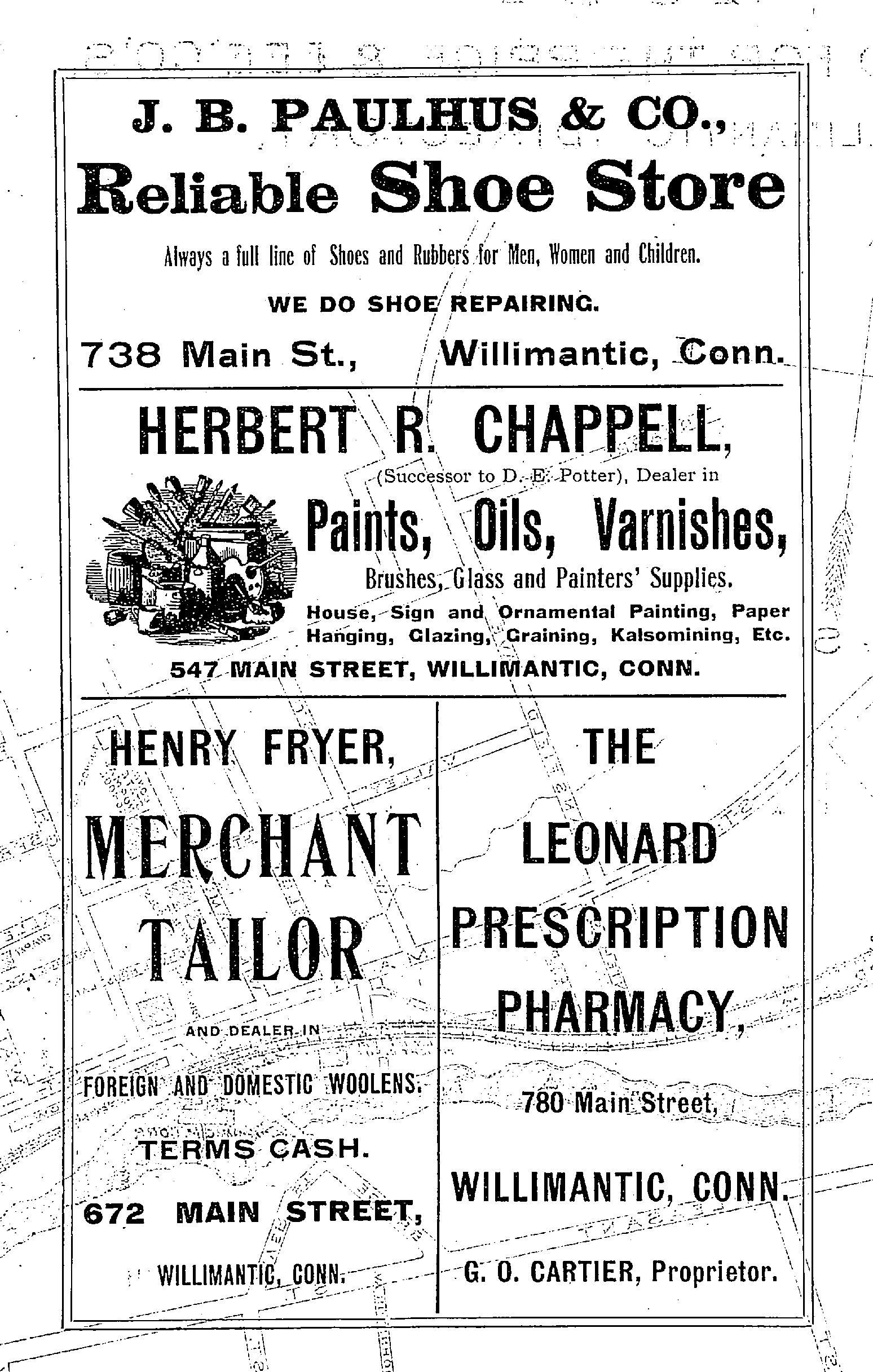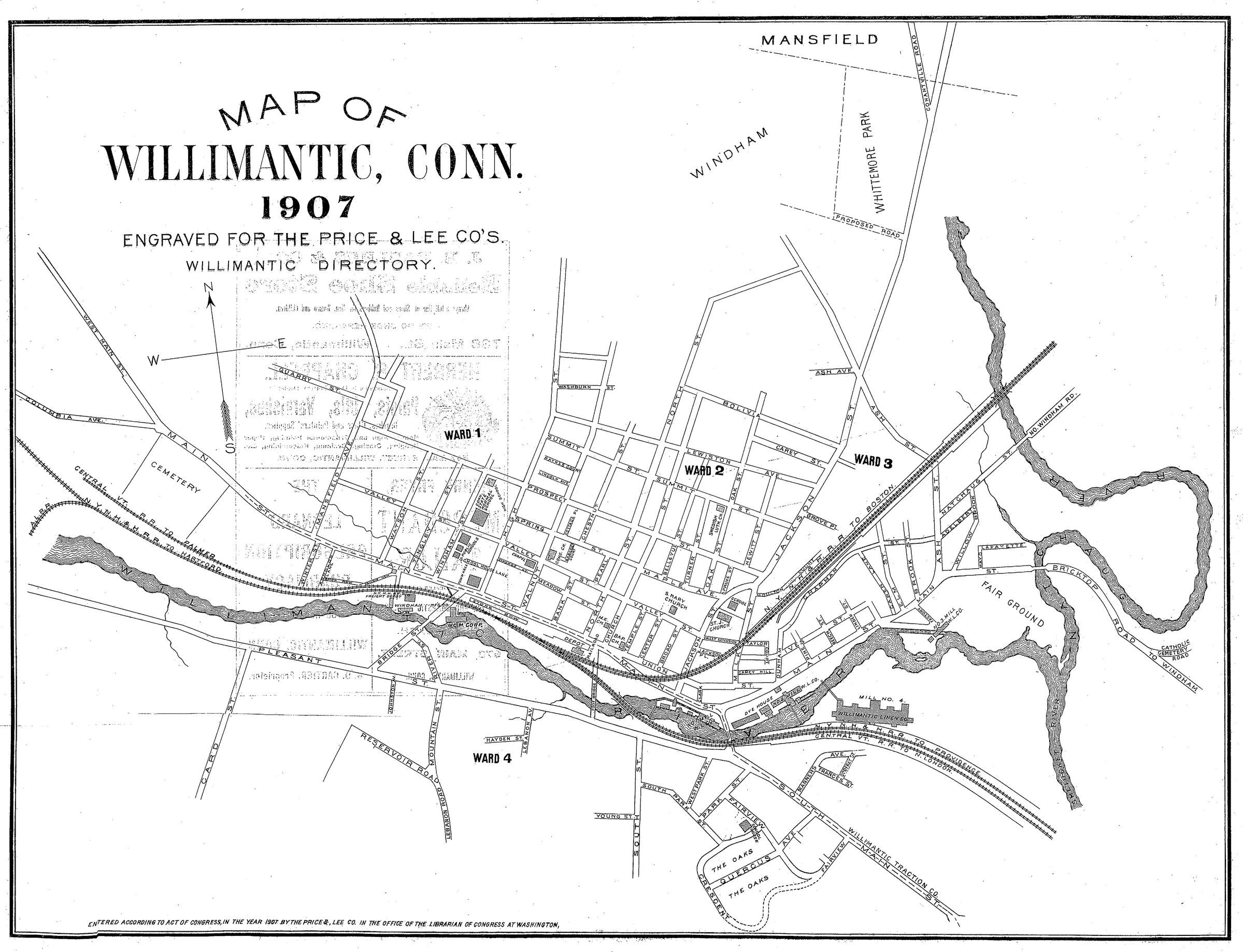 Street map of Willimantic, CT. 1907. Engraved for the Price and Lee Company of New Haven, CT, for its 1907 Willimantic Street Directory.Collection