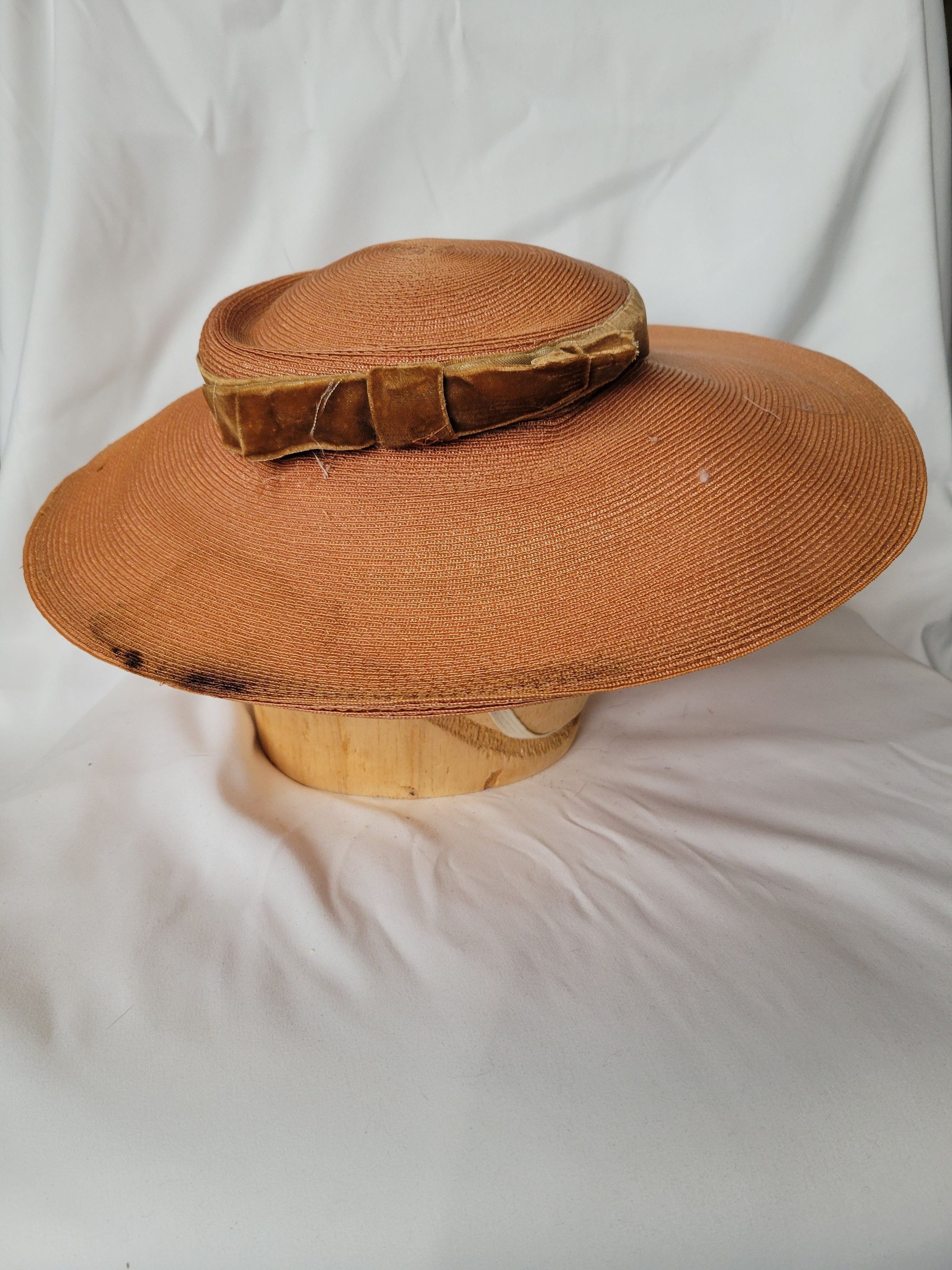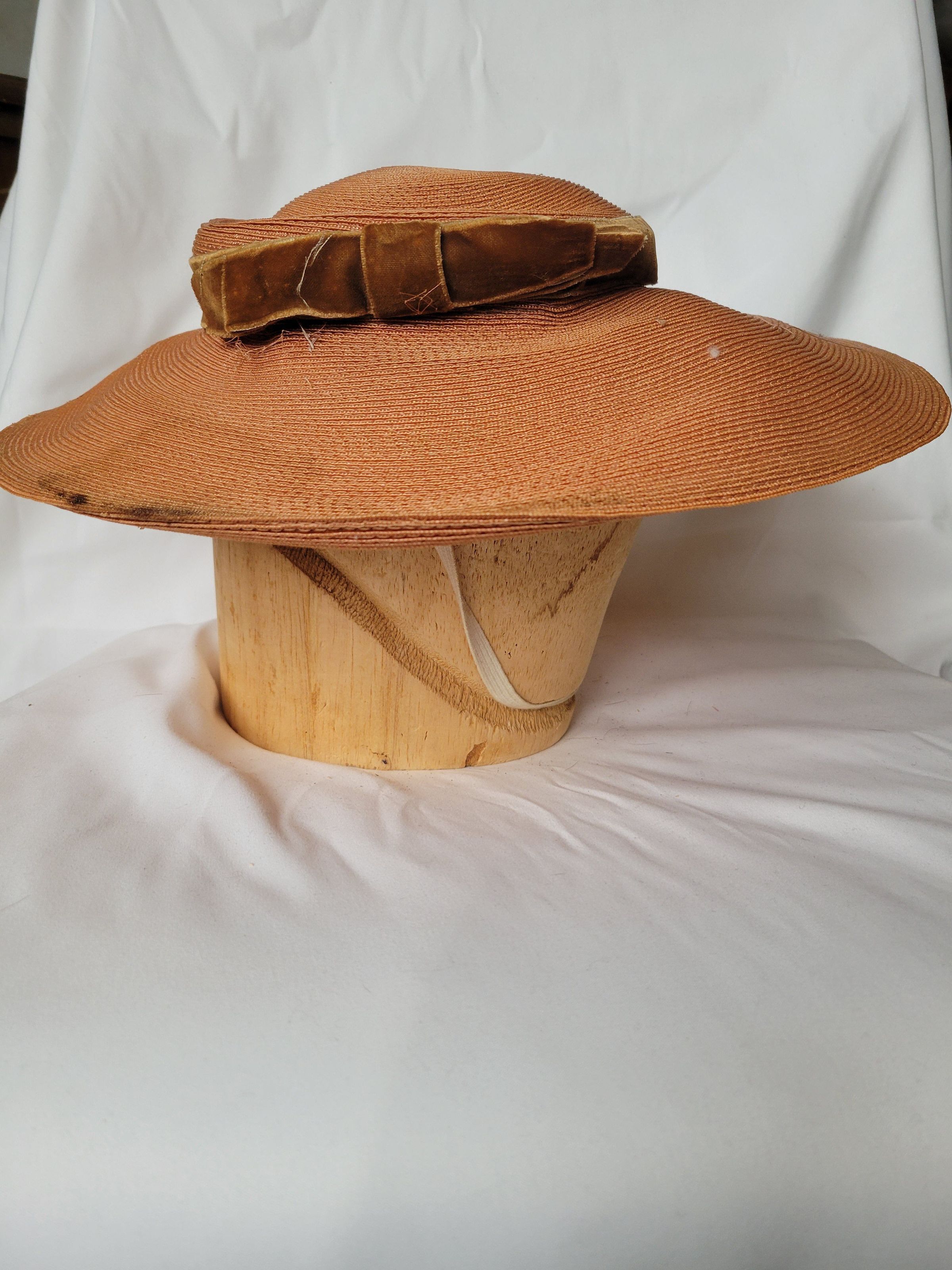 A tan straw sailor hat with a wide brim and brown velvet band. There is also a while elastic chin strap to keep the hat on in high winds found on the beach or a boat, where this was likely to be worn. The crown is bent out of shape and the brim is stained.Collection