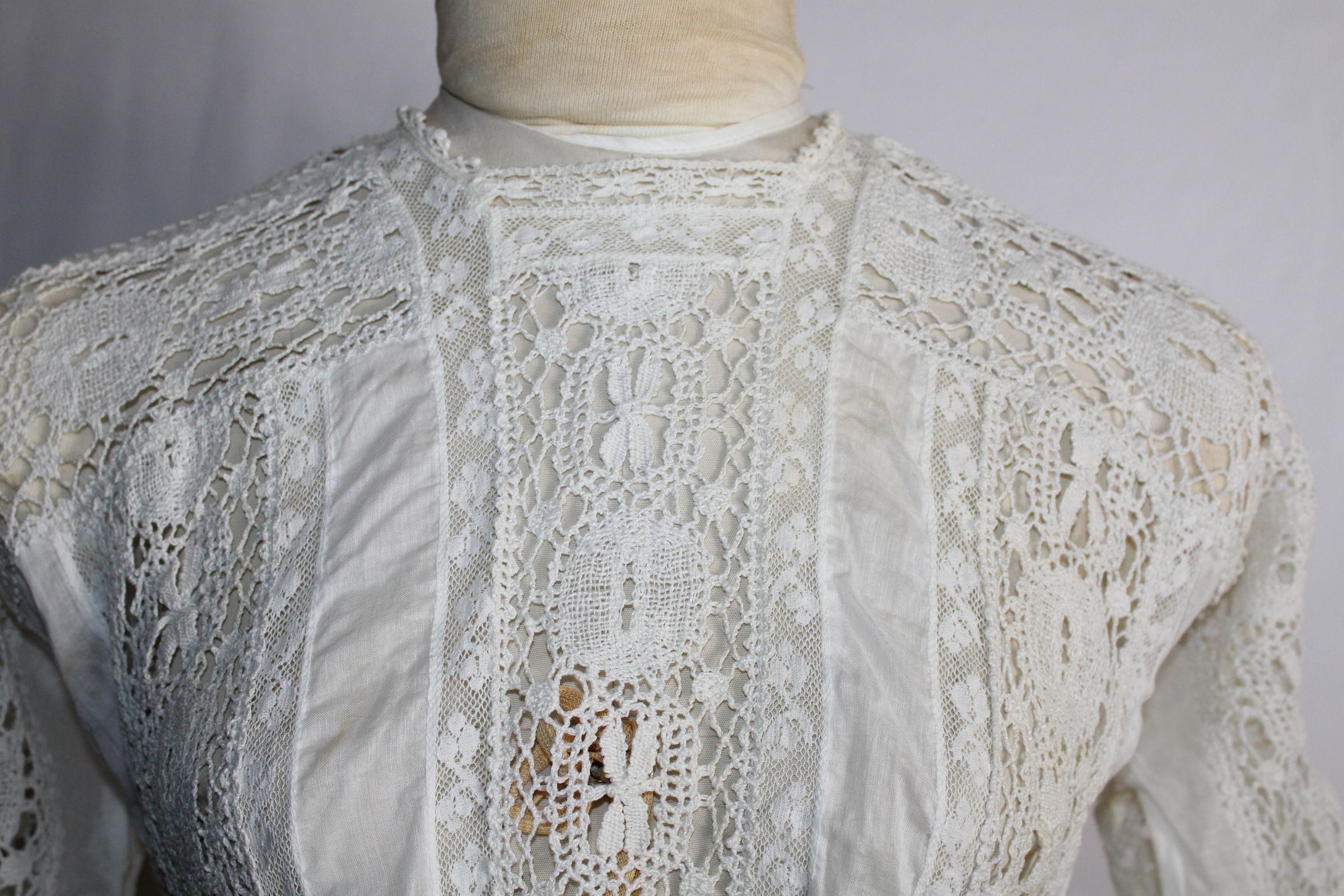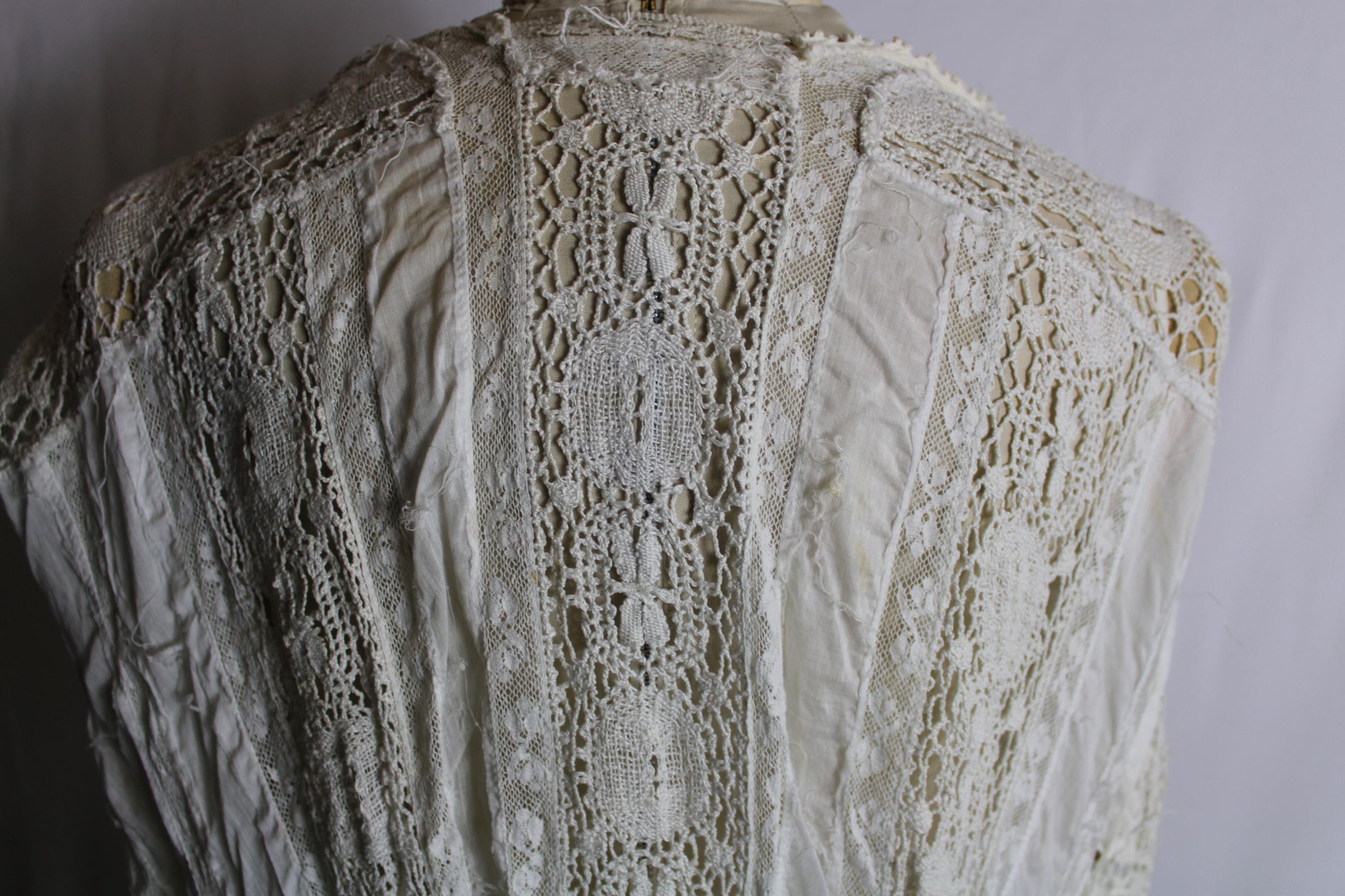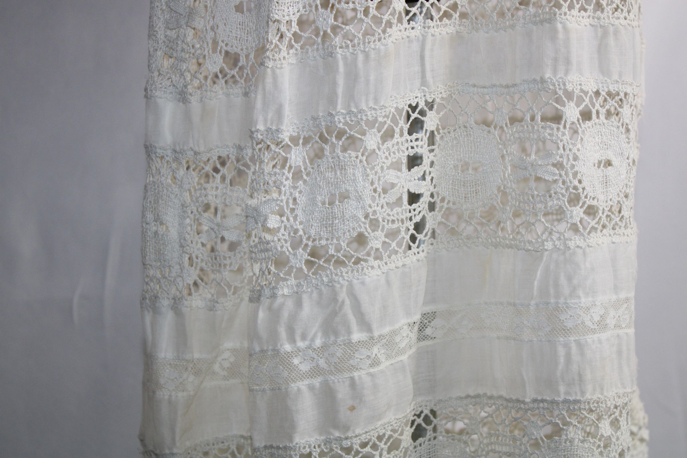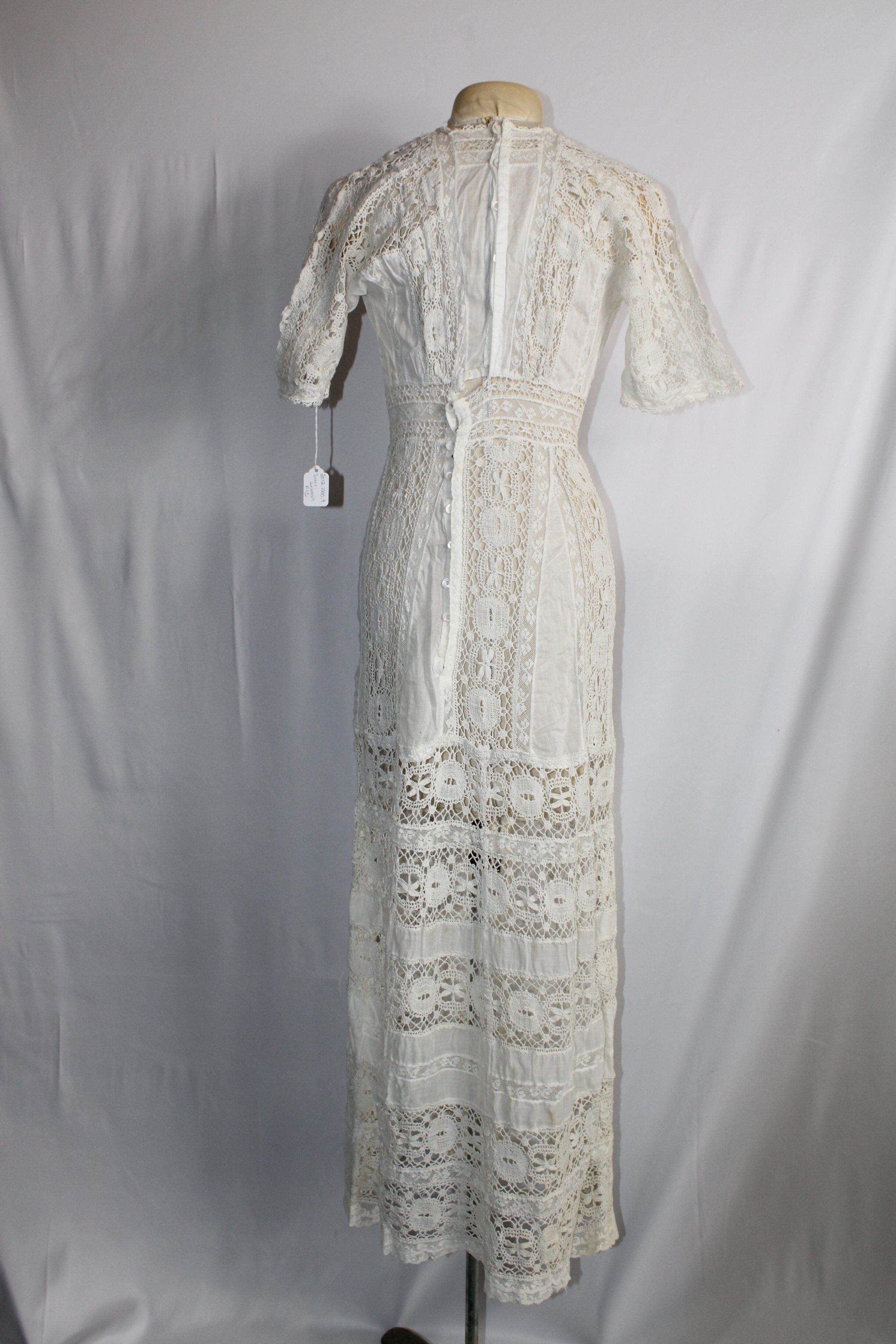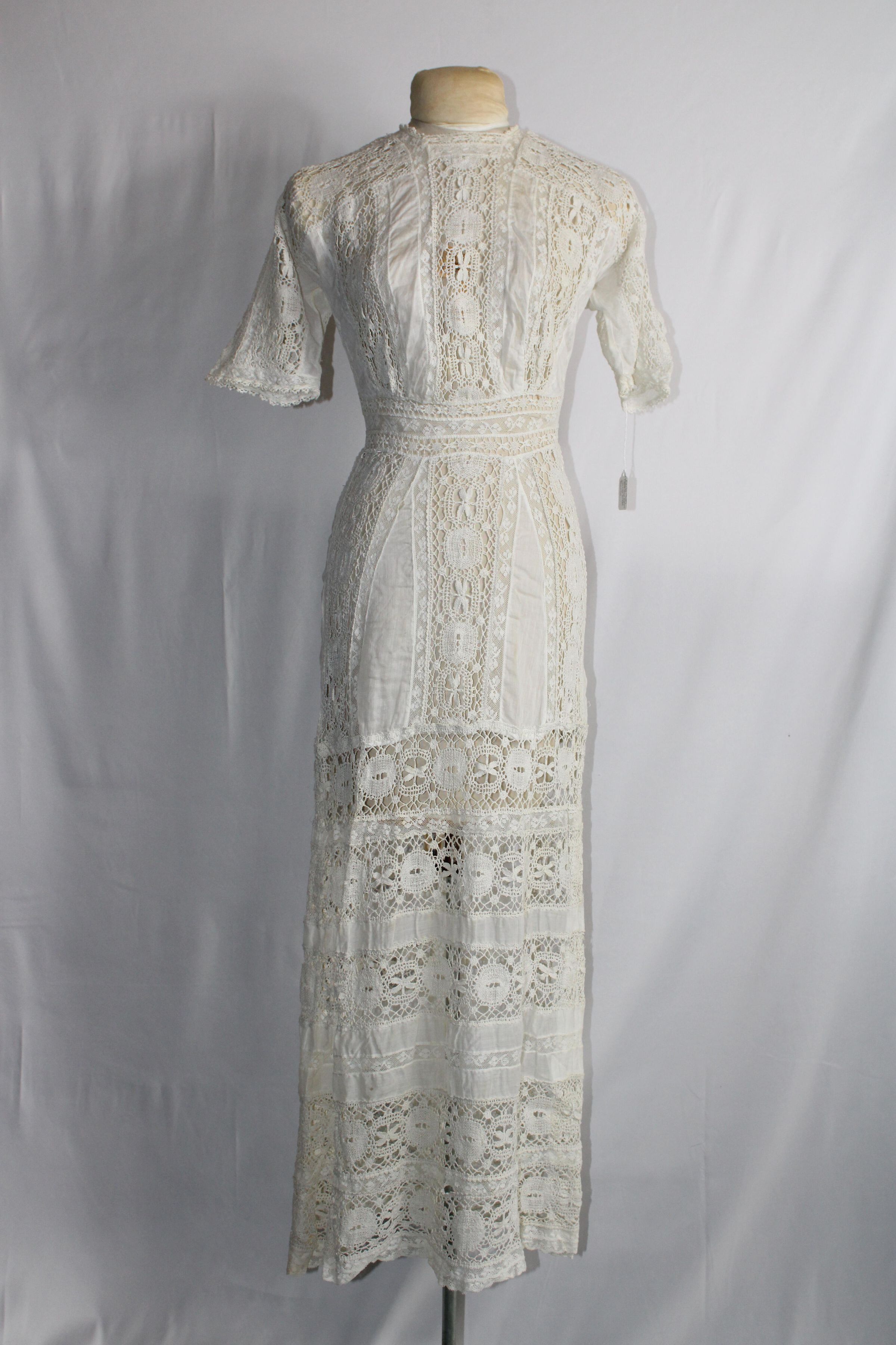Early 1900s dress made of lightweight cotton lawn with large bobbin lace insertions.