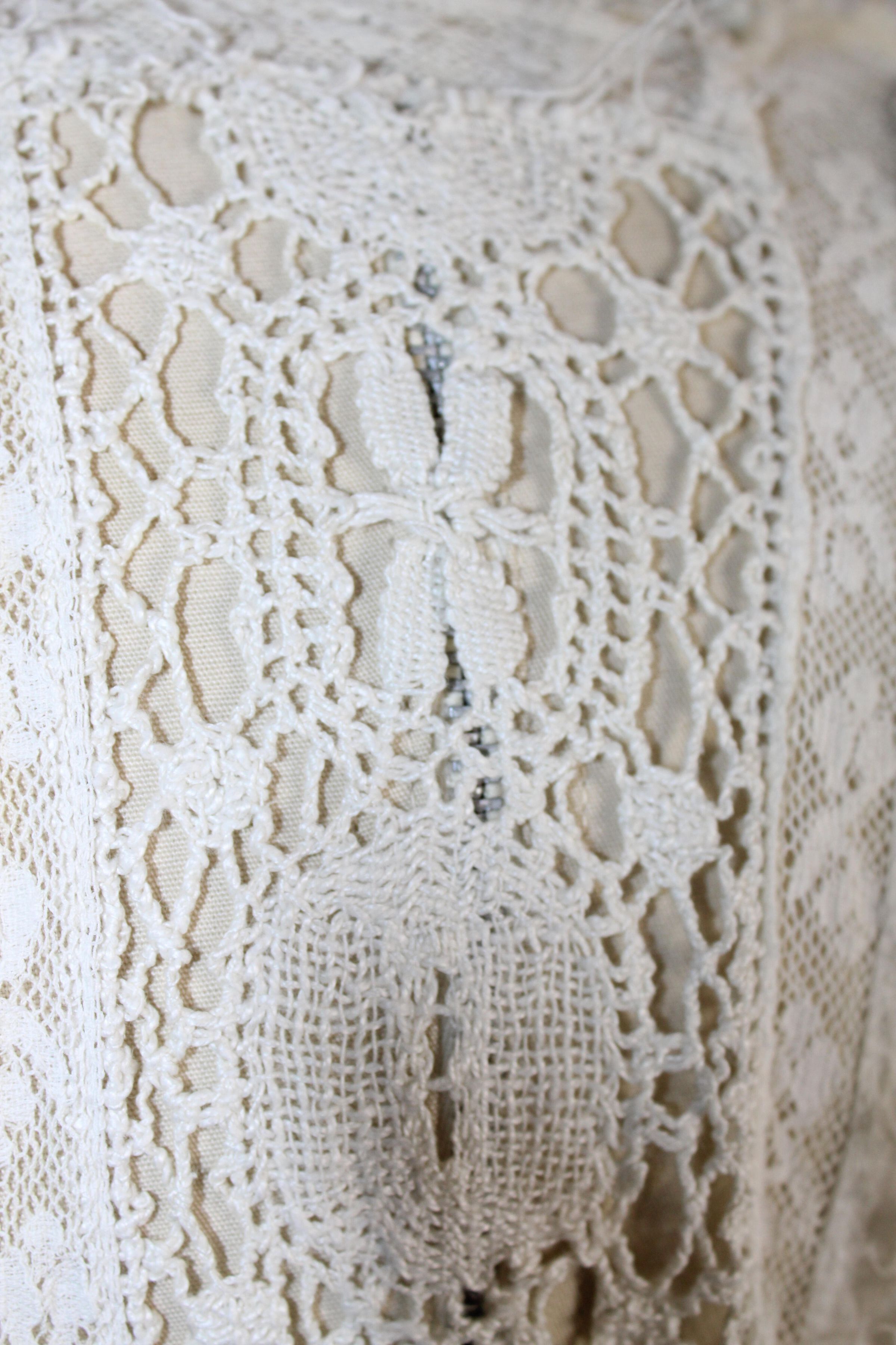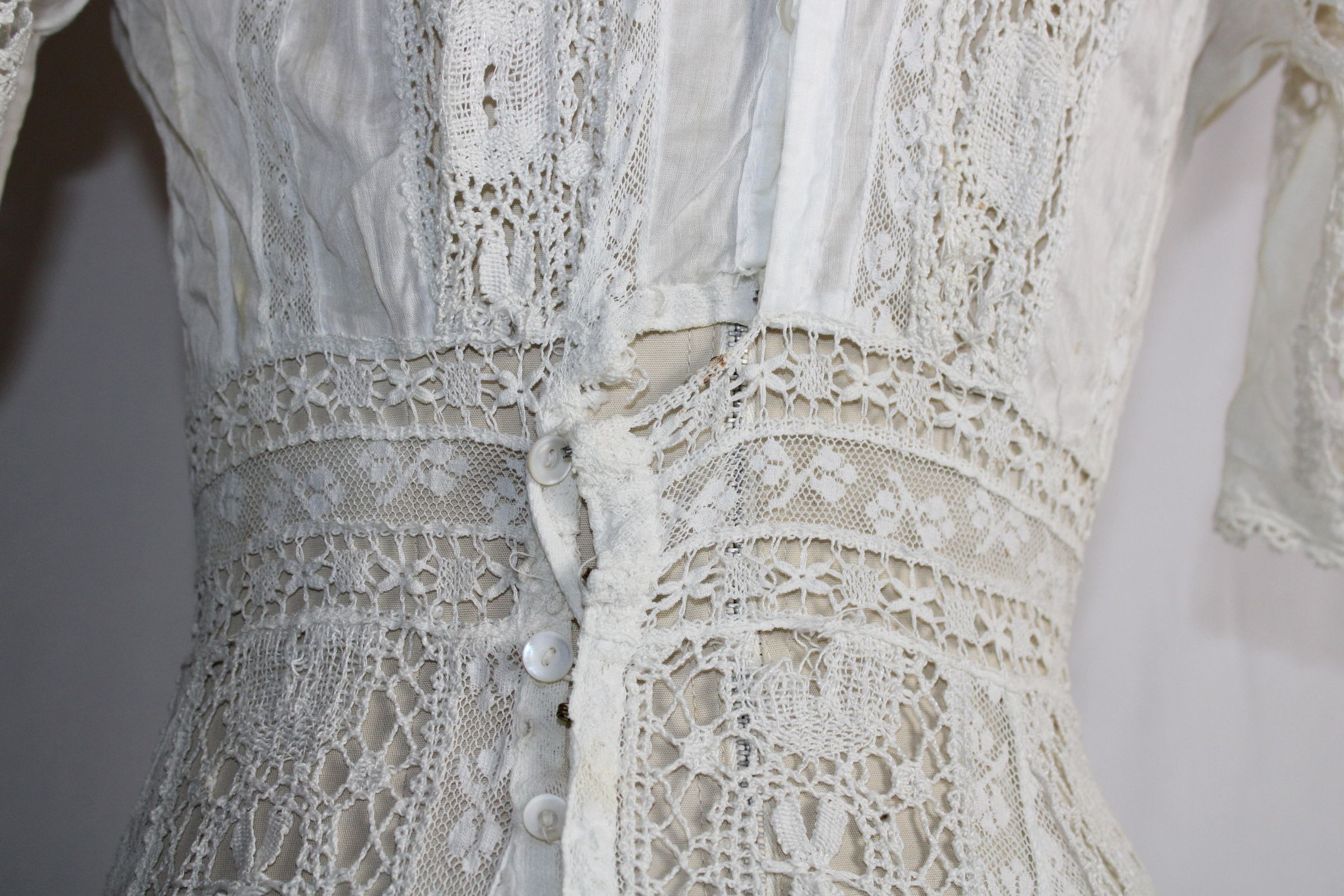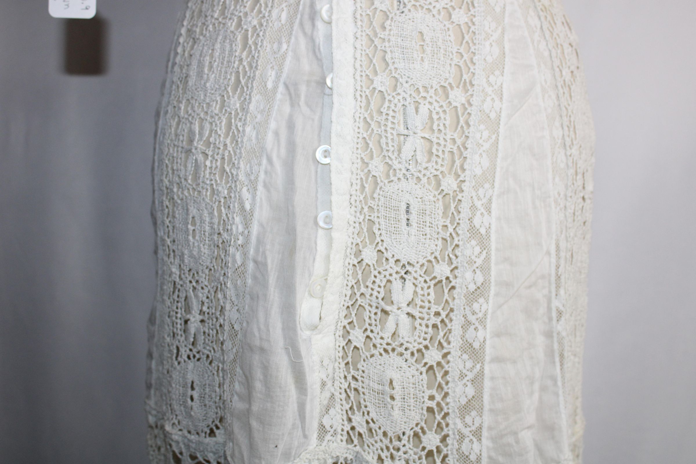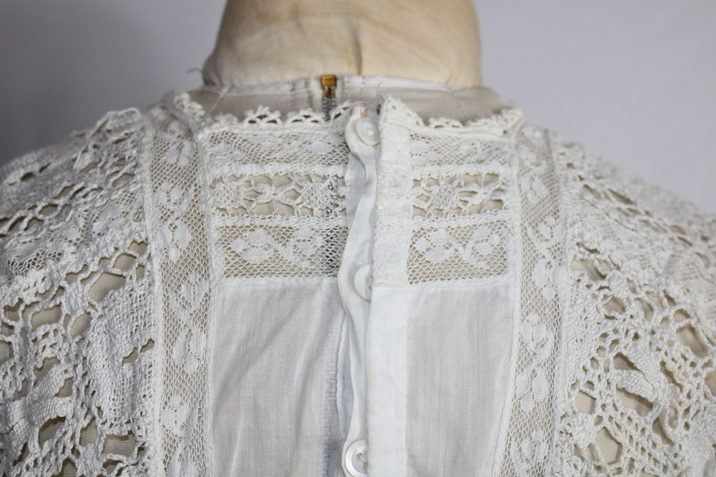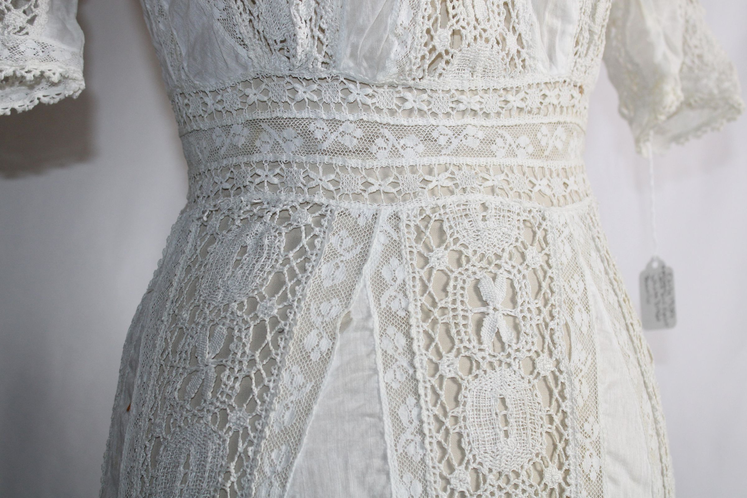 Early 1900s dress made of lightweight cotton lawn with large bobbin lace insertions.