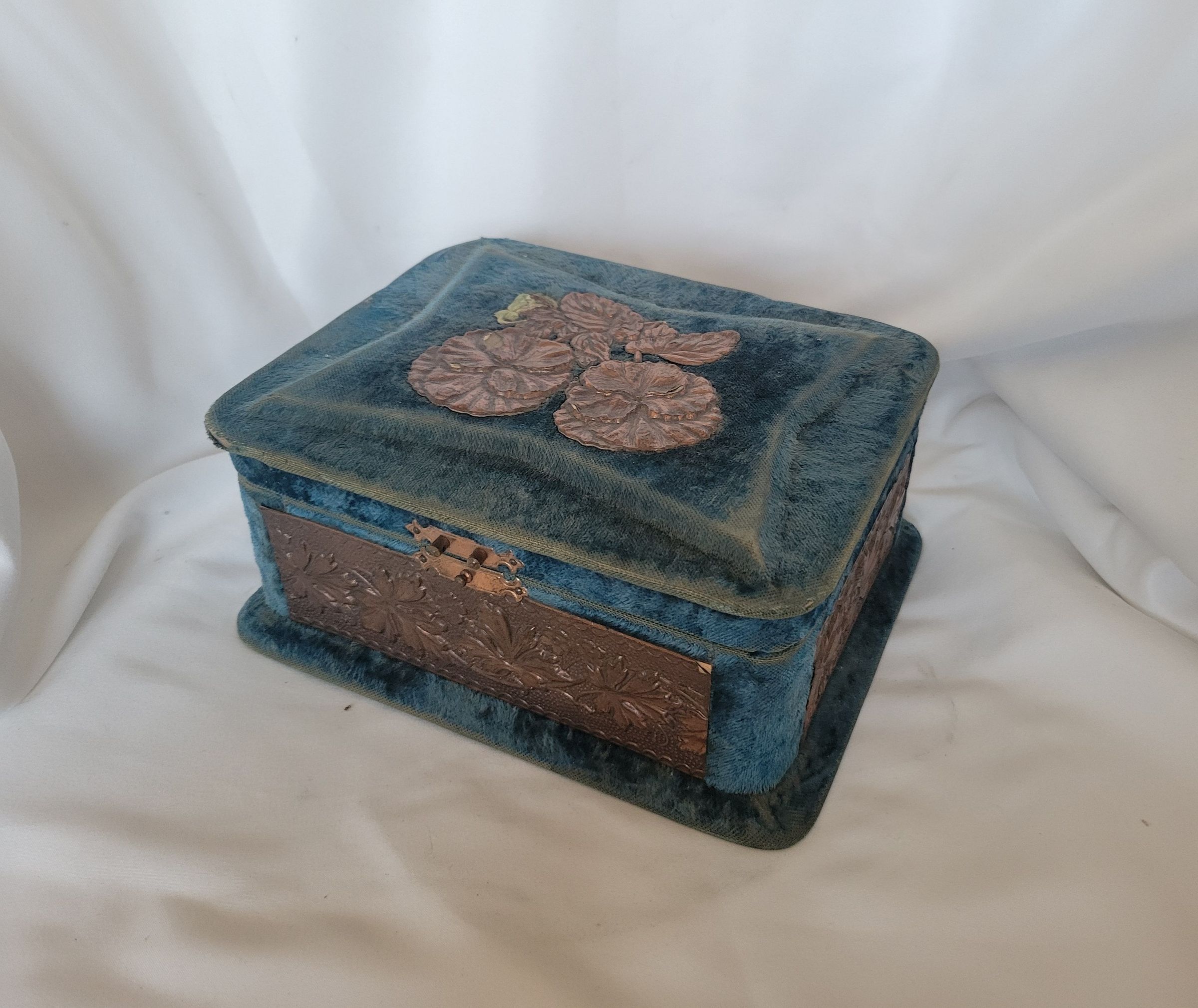 The velvet is rubbed off on most protruding corners, and there are a few places, namely the lid, where the copper is flaking off the formed cardboard underneath. The latch would once have had a metallic flap that fitted over the peg on the bottom half of the box but it is missing.