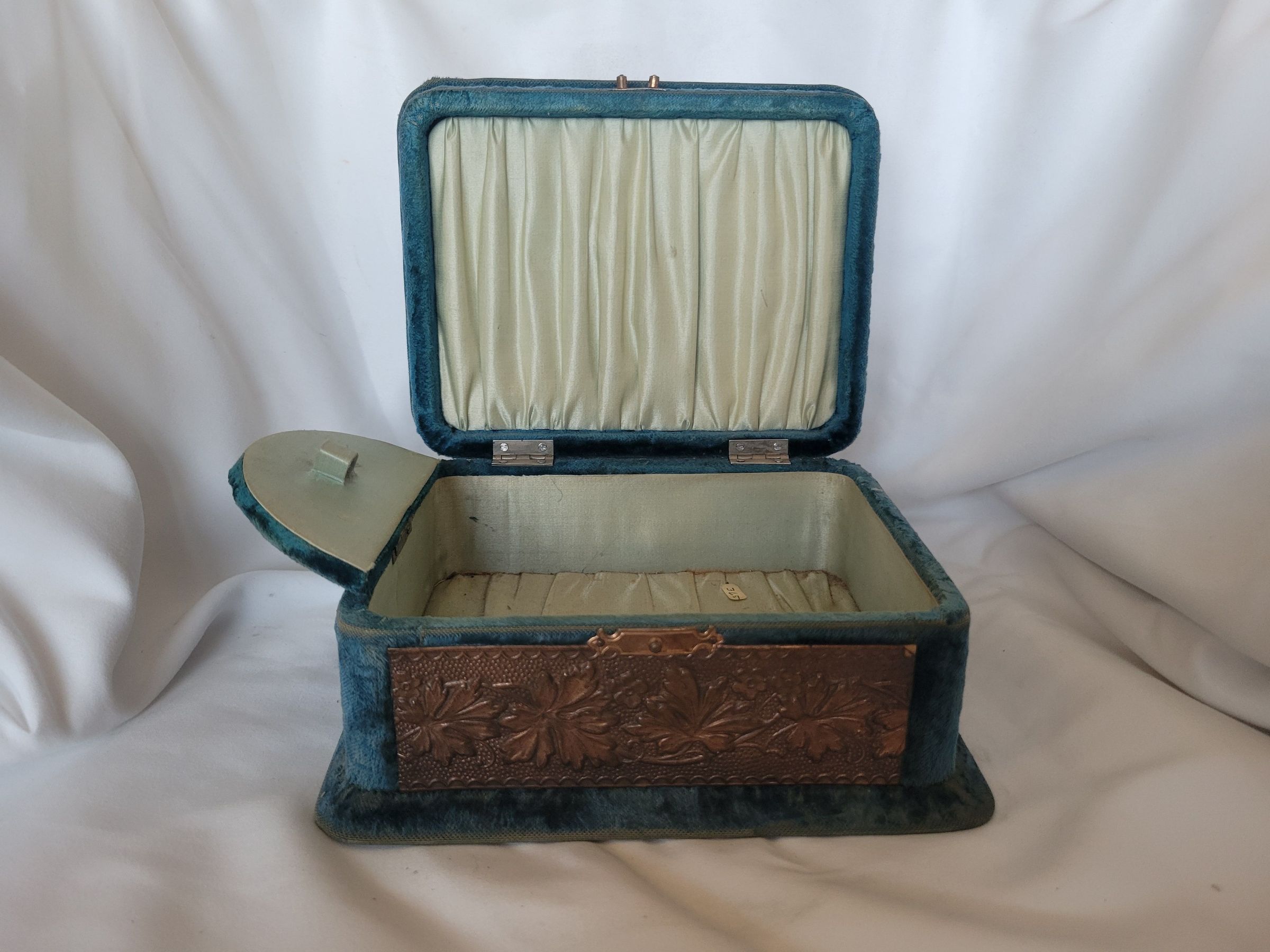 A pressboard box covered in teal velvet with cardboard and copper detailing. The inside is pleated seafoam green satin with a hinged flap featuring a number of channels through which something the size of a pencil might be slipped.