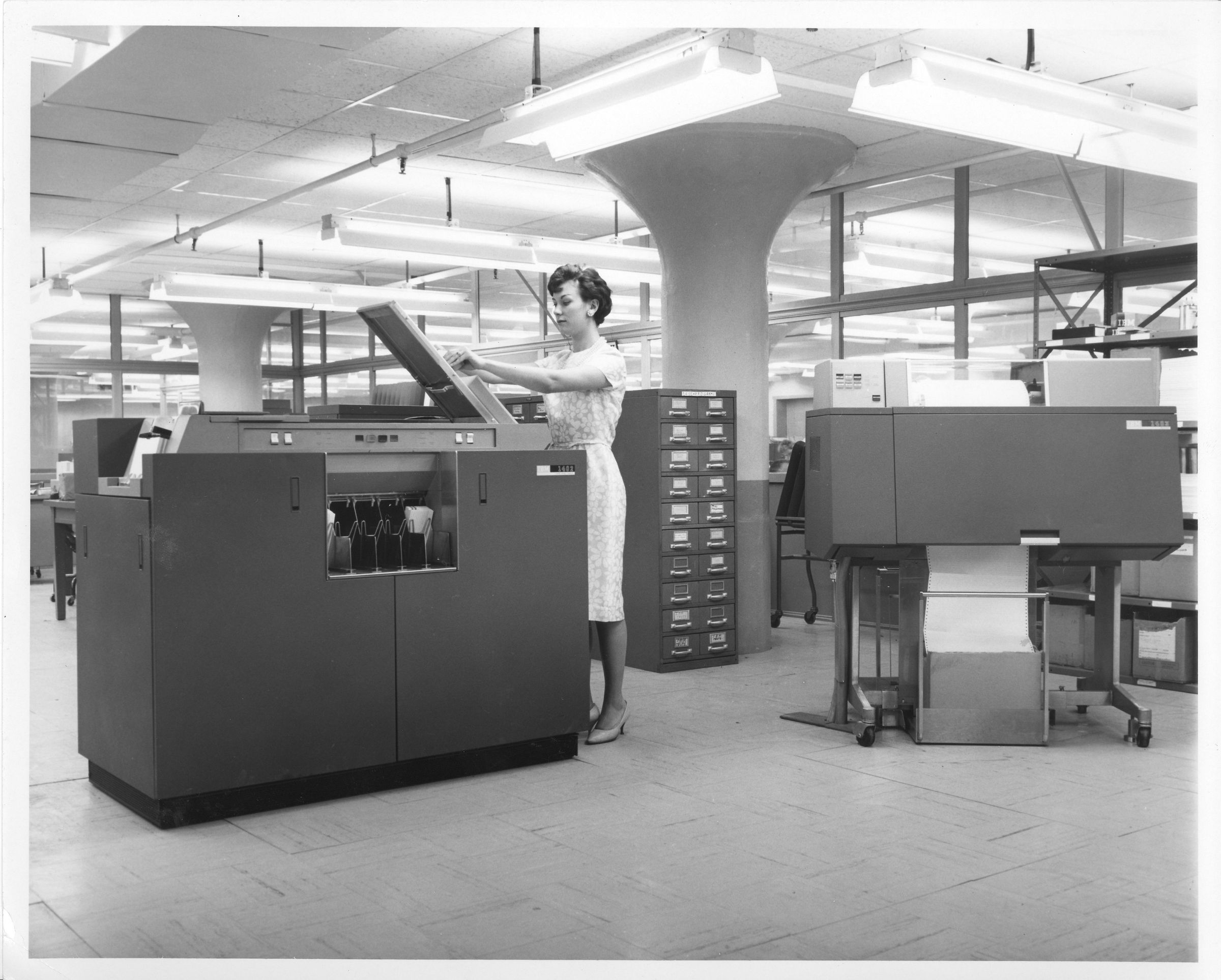 Black and white photographic print of Kathie Finasa, a textile mill office worker, operating a photocopy machine in the computer room, American Thread Company, Willimantic, CT. ATCO's computers were located in the Concrete Warehouse. Unknown photographer. Taken 1963.Photograph Details