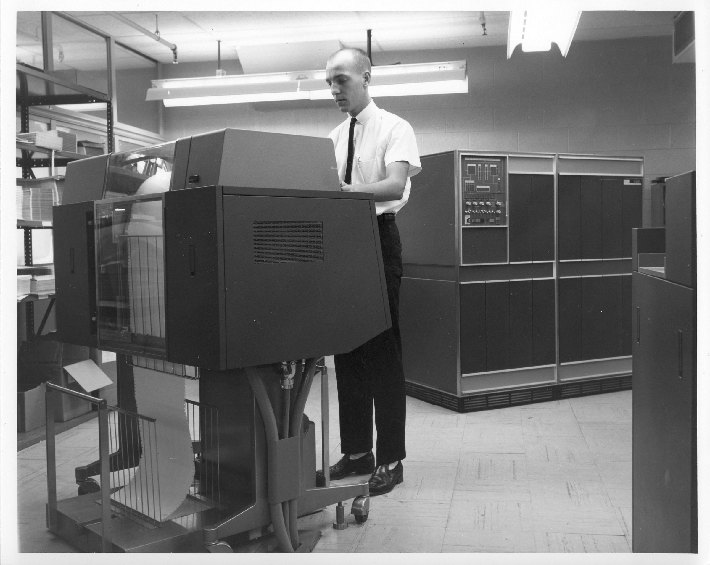 Black and white photographic print of an unidentified textile worker operating computers, American Thread Company, Willimantic, CT. ATCO's computers were located in the Concrete Warehouse. Unknown photographer. Taken 1963.Photograph Details