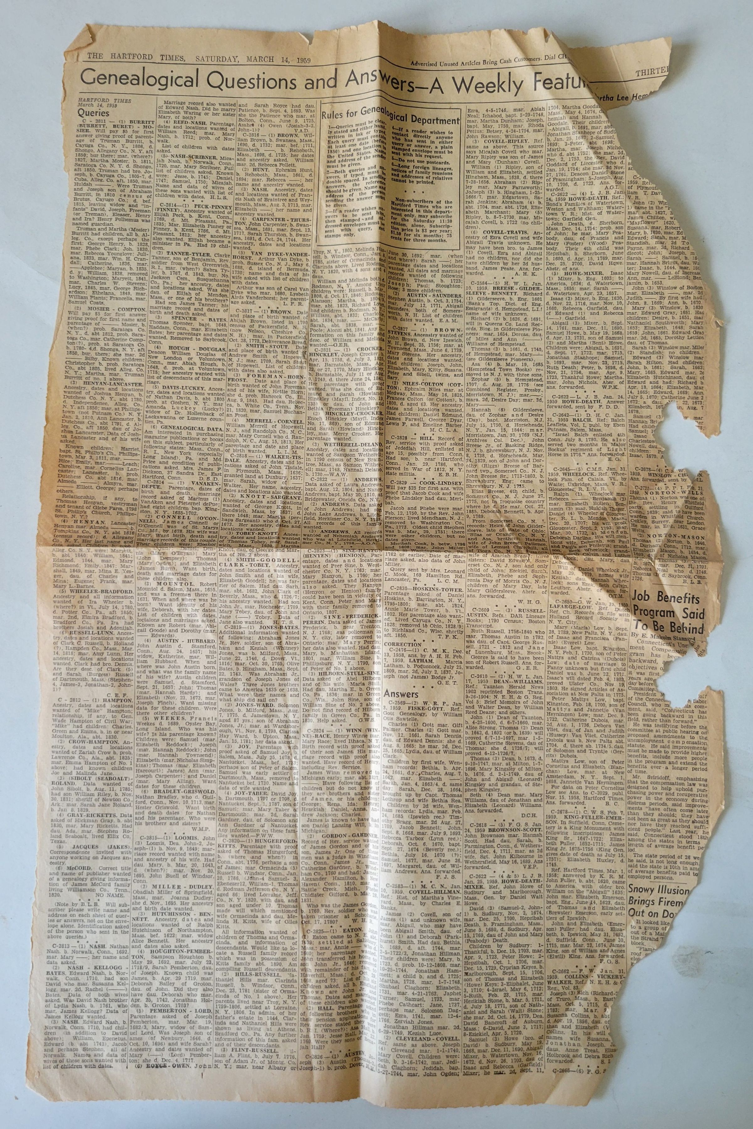 A page from the Hartford Times, dated March 14, 1959. The page is dedicated to genealogical questions and answers from the readers. A section of Queries consists of short blurbs from readers, asking for information on their ancestors, and is followed by a significantly shorter section of Answers where readers offer what information they have pertaining to any Queries. The page is torn along the right edge and in some cases large sections are missing. It is also creased in several places.Collection