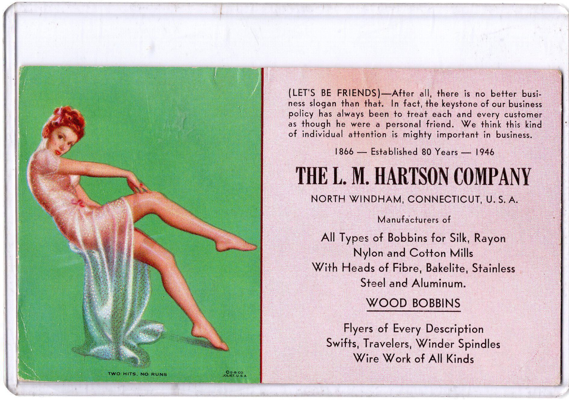 A L.M. Hartson Company trade card that has their slogan, where they are located, which is North Windham CT, they also manufactured all types of bobbins for different textile mills.Condition