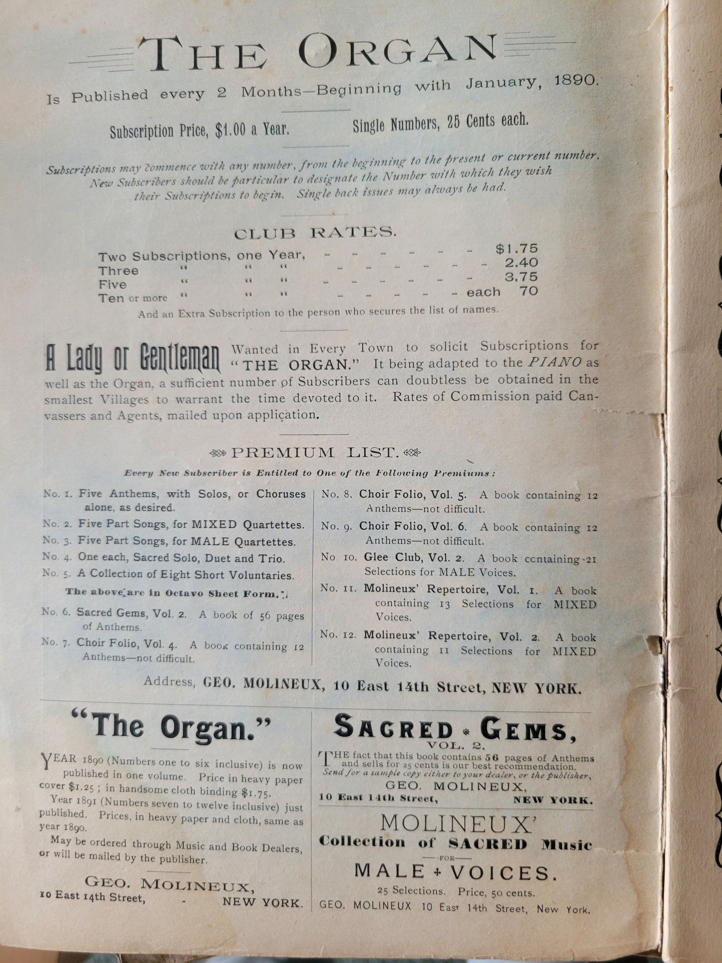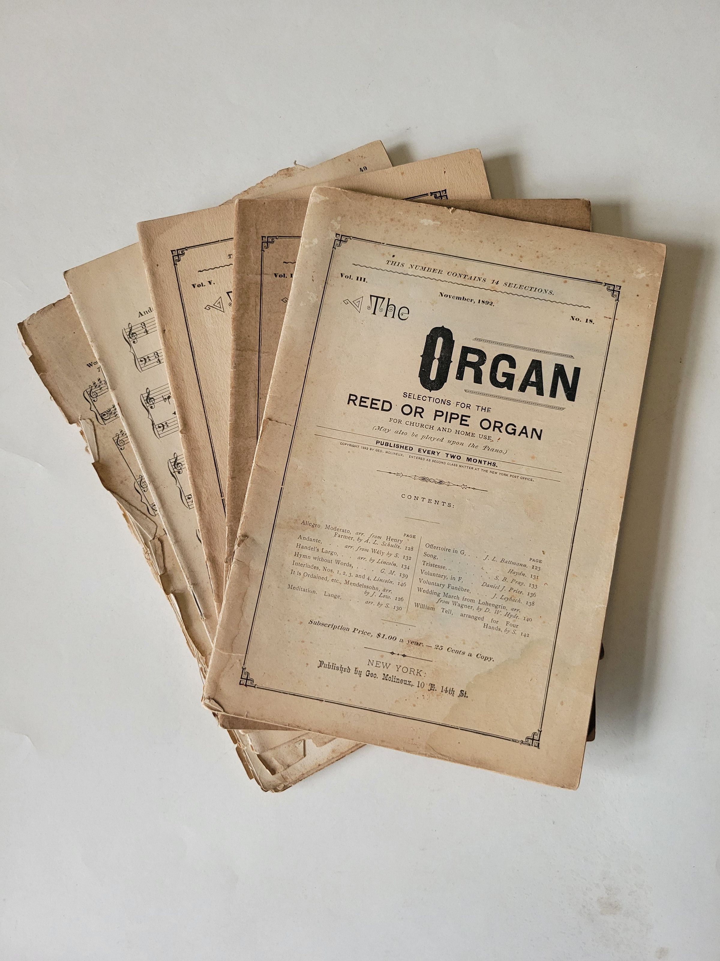A serial of sheet music arranged for the organ or piano and published every two months starting on 1890. Volumes 3, 4, and 5, plus two others which are missing covers.Collection