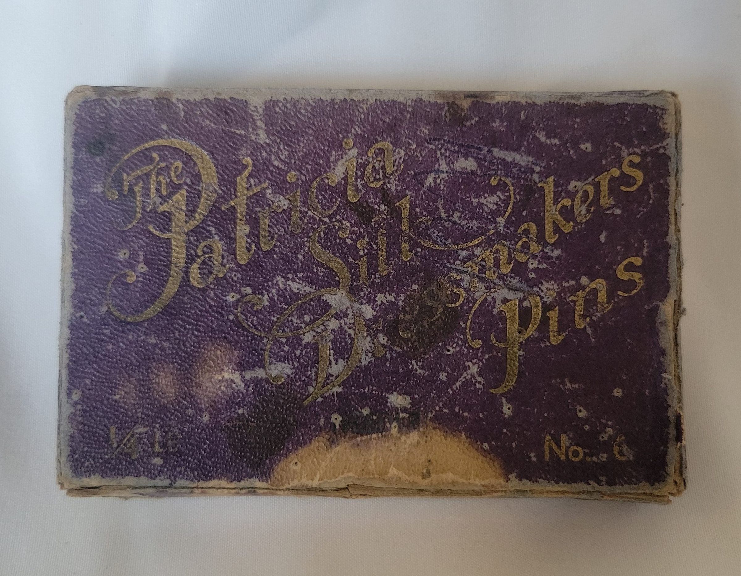 An empty box of dressmaker's pins by the Patricia brand, popular in the 1930s. The box is heavily worn and two of the lid corners are torn.Collection
