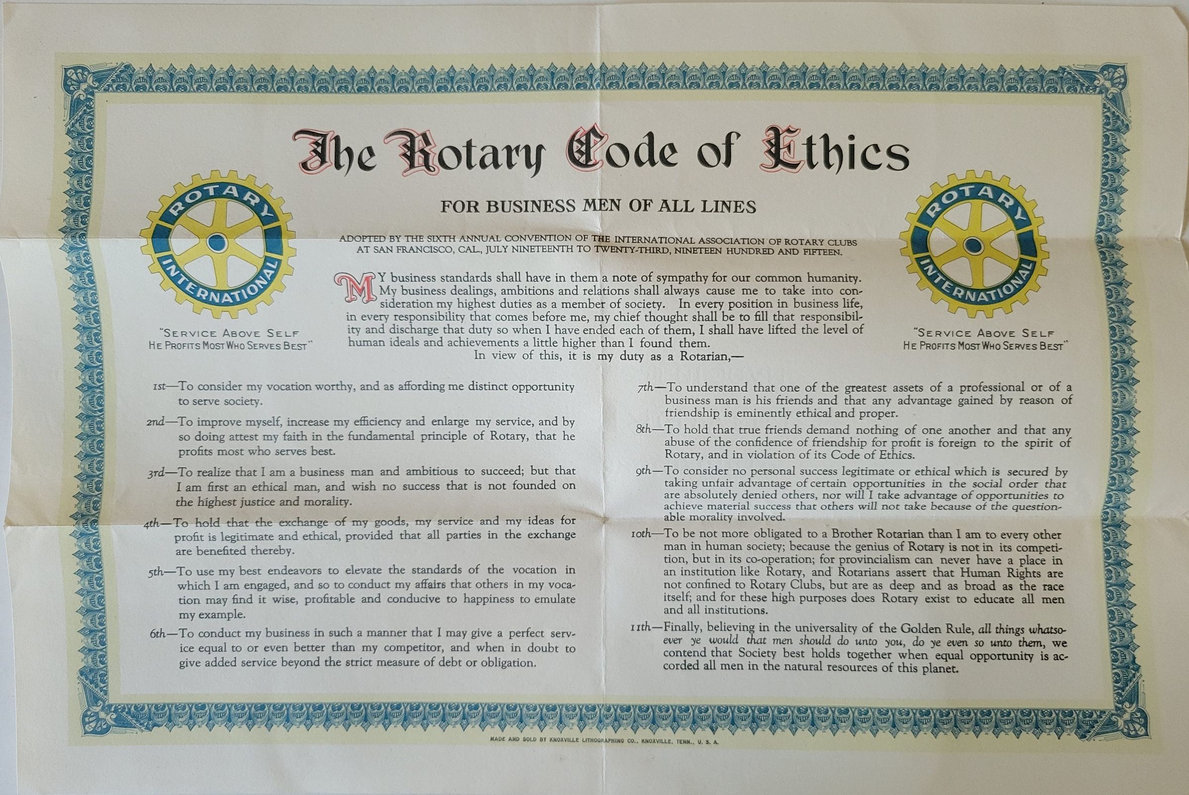 A printed certificate of the Rotary Code of Ethics, adopted by the 6th annual convention of the International Association of Rotary Clubs at San Francisco, CA, July 19-23, 1915. It outlines 11 tenets for members to follow. Made by the Knoxville Lithographing Co. of Knoxville, TN. The Rotary Club is a service organization whose goal is to, according to their website, "provide service to others, promote integrity, and advance world understanding, goodwill, and peace through [the] fellowship of business, professional, and community leaders."Collection