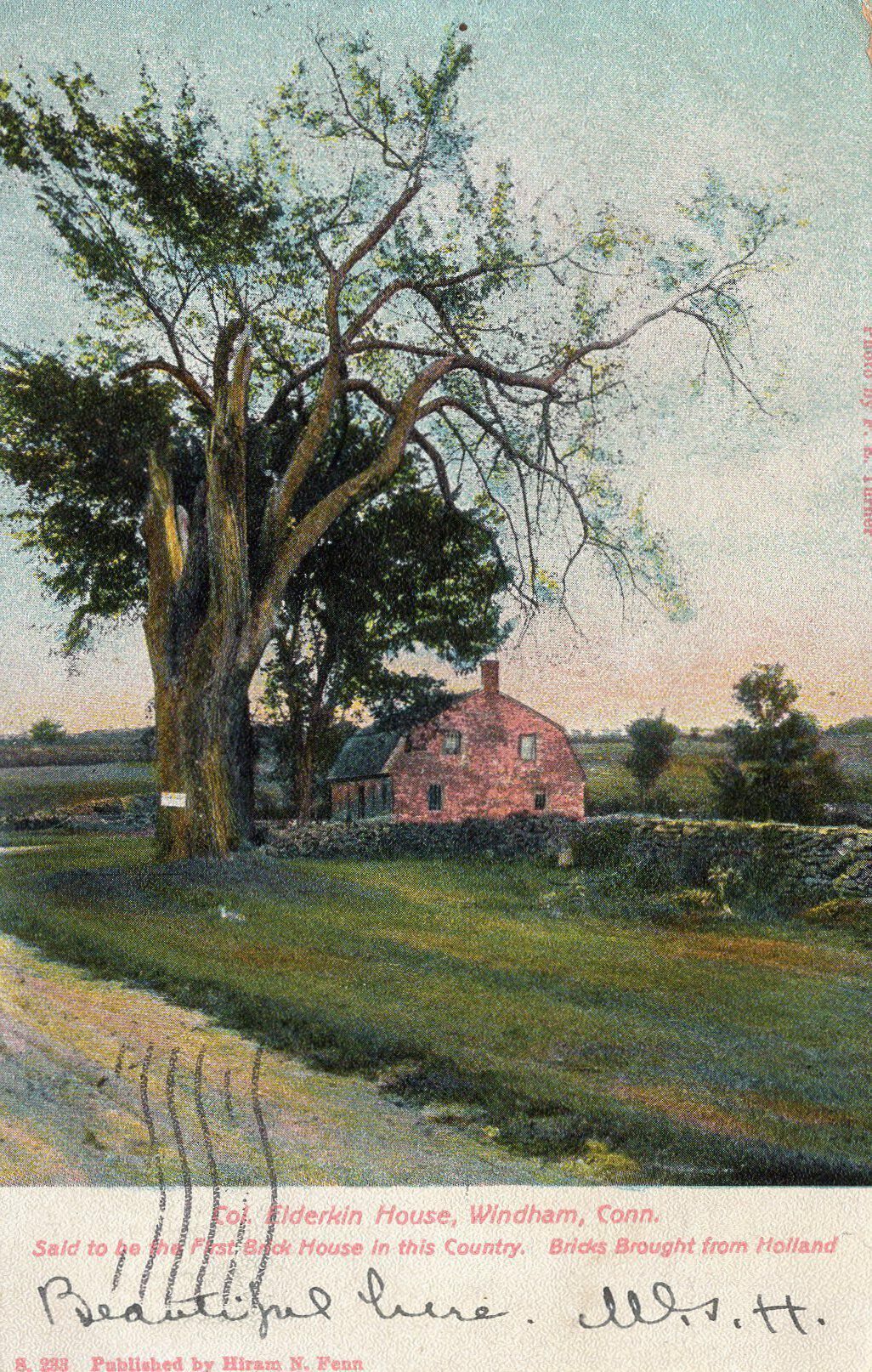 A postcard of the first brick house in the country, sent in 1906