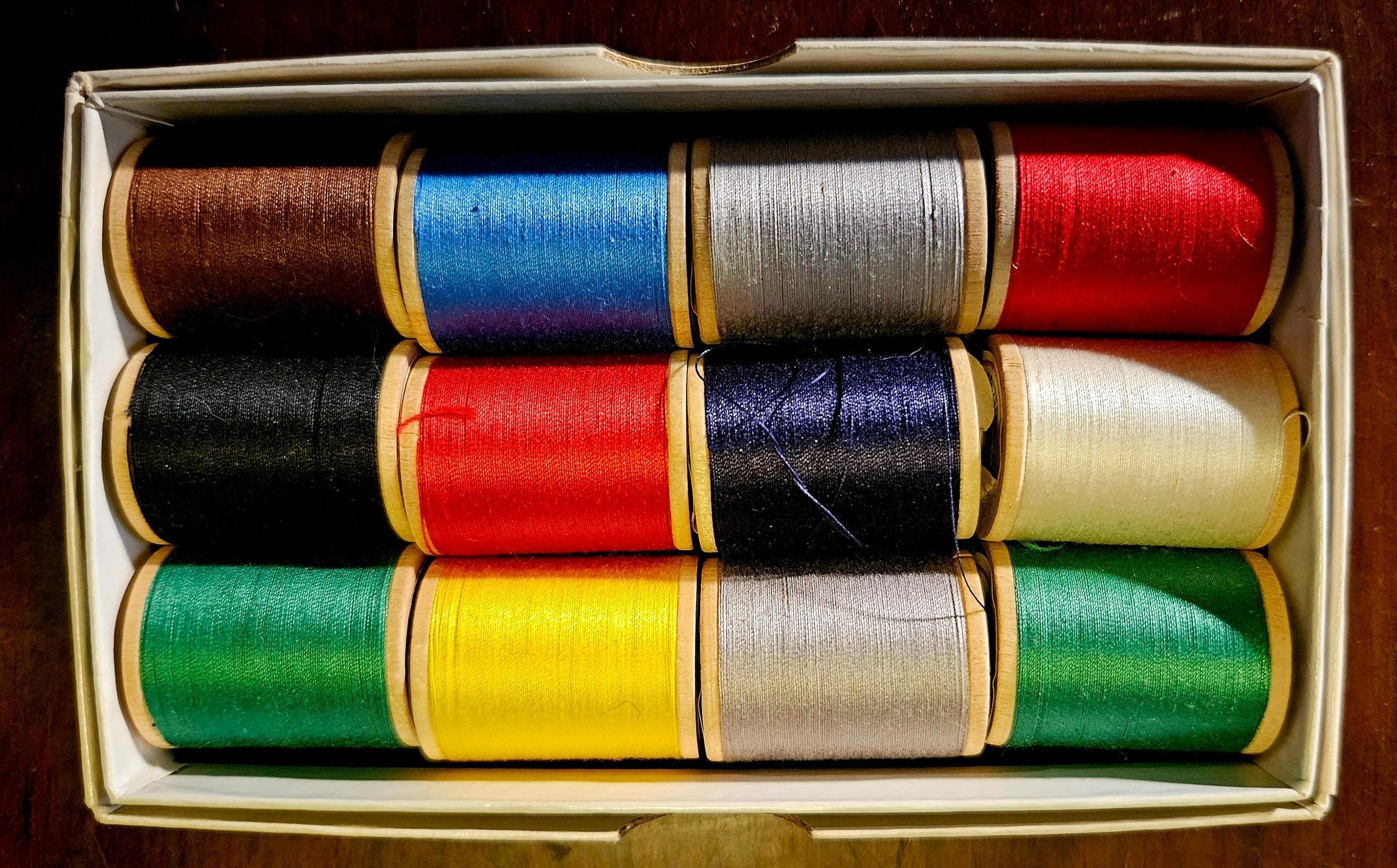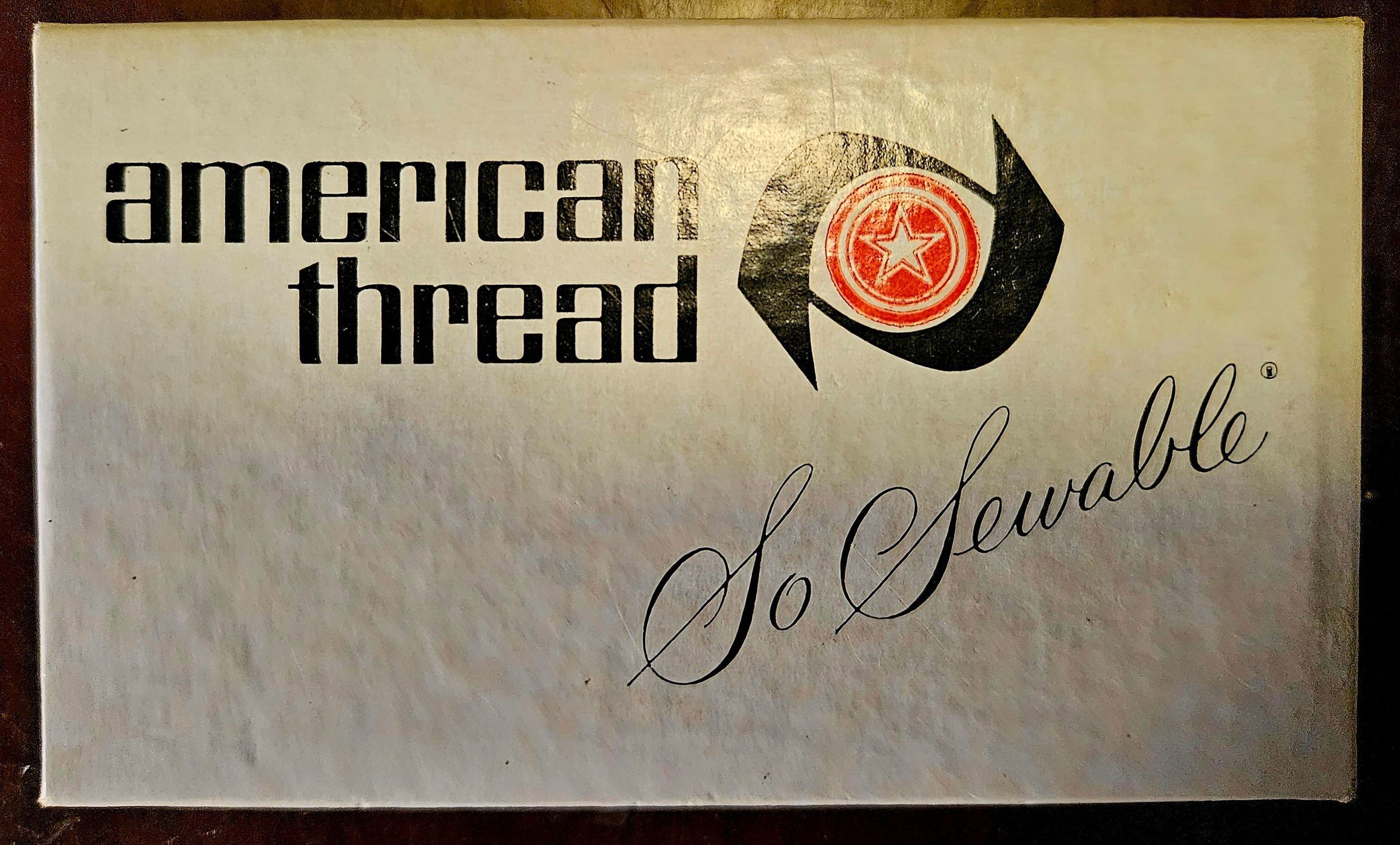 Box of American Thread Company Star Mercerized thread, wound onto wooden spools. Twelve spools. Assorted colors.Use